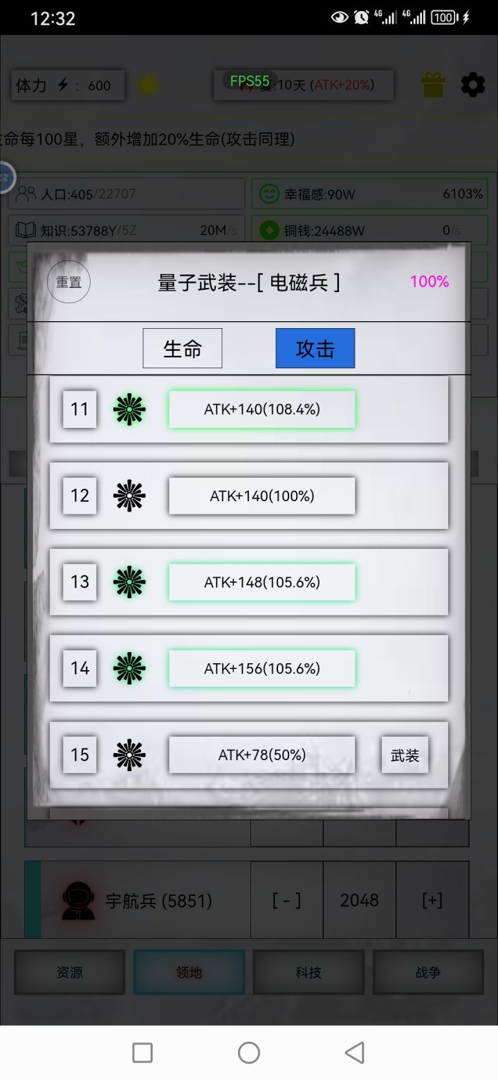 今天打了步兵极限,之前一直不敢打,结果发现很轻松就过了。我看那些攻略说要2000/20加30青龙,才能5000兵,我属性青龙都不够,多上了很多浪费了好多果子,结果不需要。 我计算了一下,发现不需要这么多属性,步兵带兽王剑和军旗生,以步兵生命是攻击10倍算,如果满攻步兵两个能杀对面一个,那属性就够了。20阶时对面4400血,又能吸步兵生命值20%,设步兵攻击力X,加满攻触发兽王剑技能可打21.6X