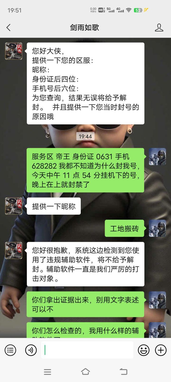 无辜封禁账号,请求技术复查。账号15354037490。帝王区。角色名字,雪君。在此保证本人绝对没有使用任何外挂脚本同步器,从开服到现在一直手动。本人还有四个账号,15354039735.18034329990.17363132811.17717716337。如果本人承诺的情况不属实,使用了任何破坏游戏的脚本,请求官方对另外四个账号一块封禁。昨晚在打熊,后来打犀牛。又打了忍者。然后就离线挂机练步伐