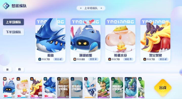 珊瑚岩蟹∶第1回合究极进化,然后一直对自己用厚礼蟹技能(可以留一个pp等到第二轮用) 雷鼓蛙∶先用电闪雷鸣开雷暴天气,第2回合对鹿用徐徐暴之提升一级暴击,第3回合如果对面魂鱼剩余血量还多就用二技能重鼓余响。剩的血量不多就用徐徐暴之或者一技能雷鸣协奏恢复血量。第一轮快结束的时候换上可兰。 苍星之王∶先用闪电系的饮战之击,再用闪电系的杀灭一念。第2-3回合还是用杀灭一念,第4回合开始凝晶,后面都是用凝
