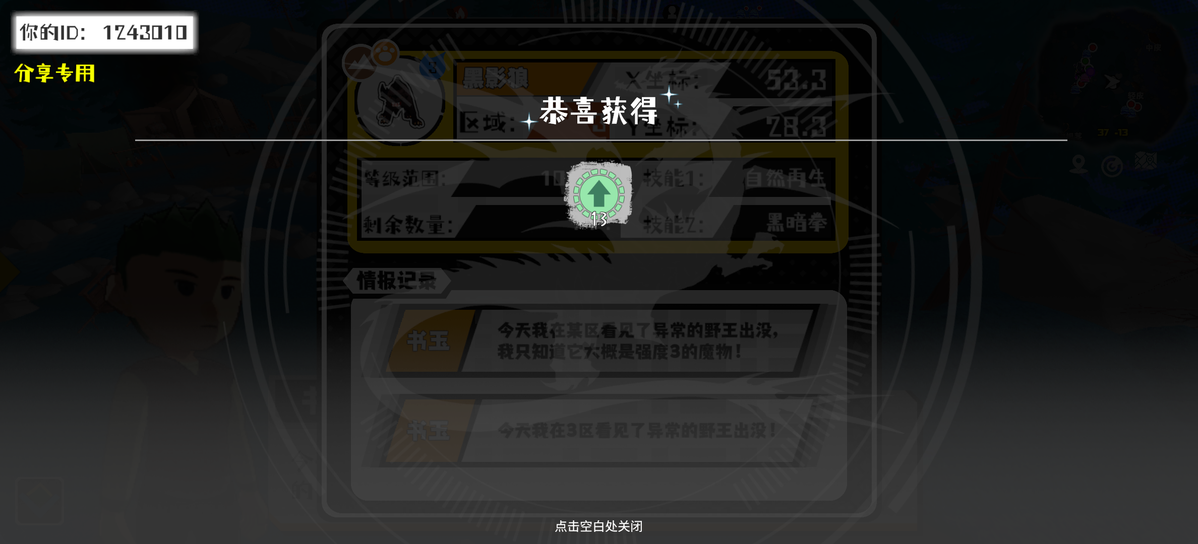 幸运时刻分享! 【野王异常出没】1月3日下午6点 - 黑影狼【强度3】 【3区】 【X:53.3, Y:28.3】#超数据世界