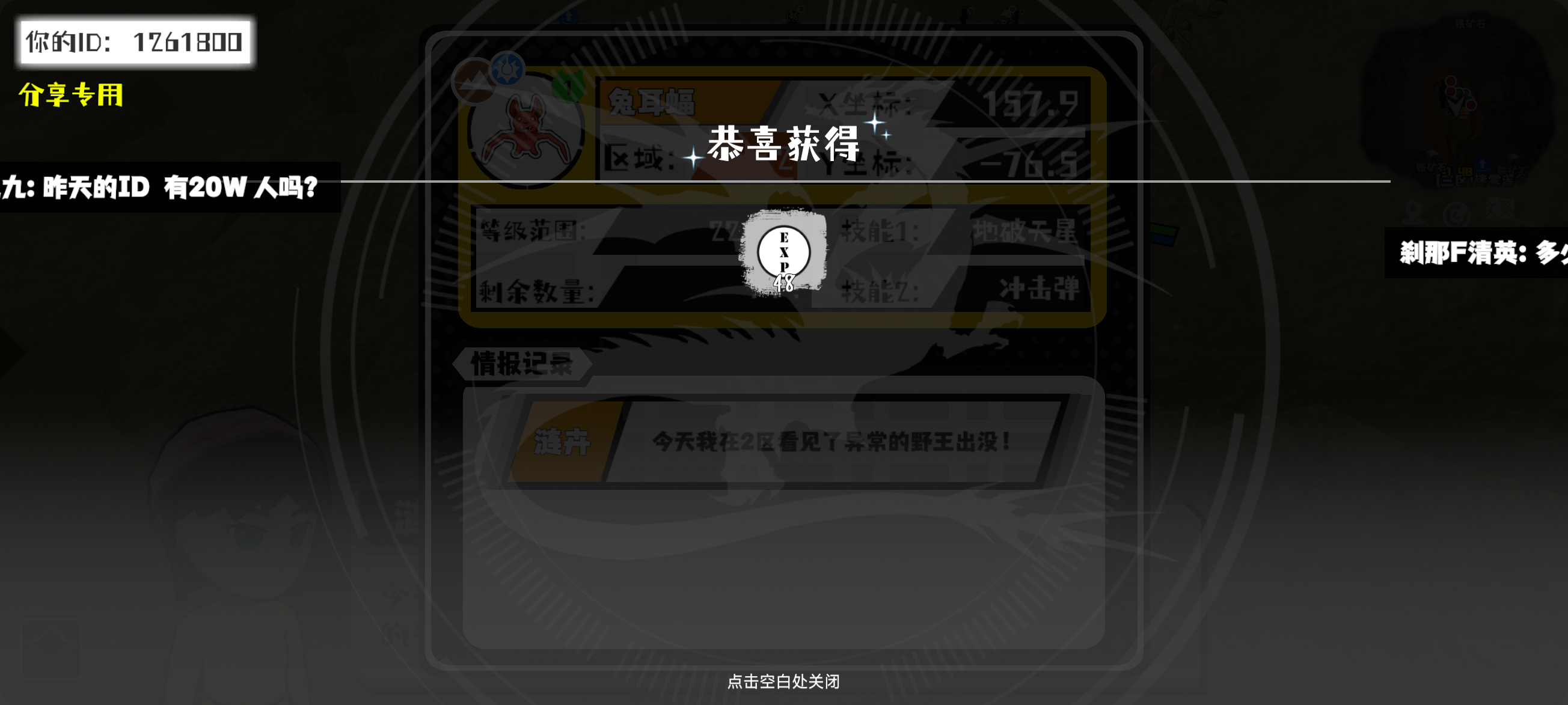 幸运时刻分享! 【野王异常出没】1月12日下午2点 - 兔耳蝠【强度1】 【2区】 【X:157.9, Y:-76.5】#超数据世界