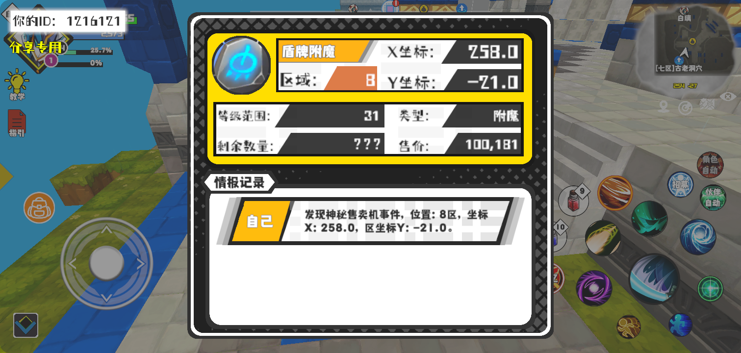 幸运时刻分享! 【神秘售卖机】12月20日下午11点 - 盾牌附魔【31级 】【稀有度:稀有】 【8区】 【X:258.0, Y:-21.0】#超数据世界