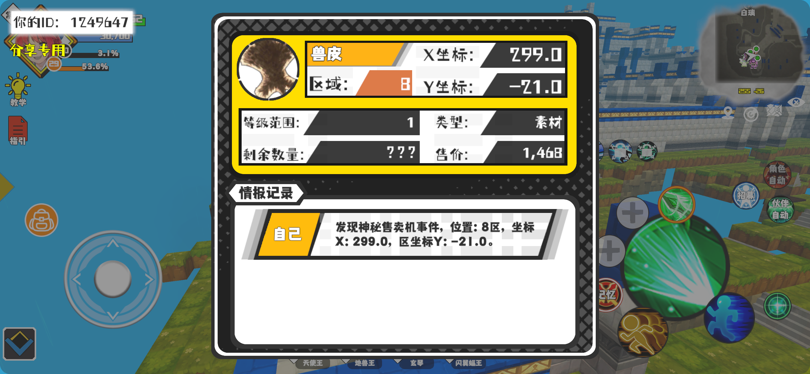幸运时刻分享! 【神秘售卖机】12月14日上午8点 - 兽皮【1级 】【稀有度:精良】 【8区】 【X:299.0, Y:-21.0】#超数据世界