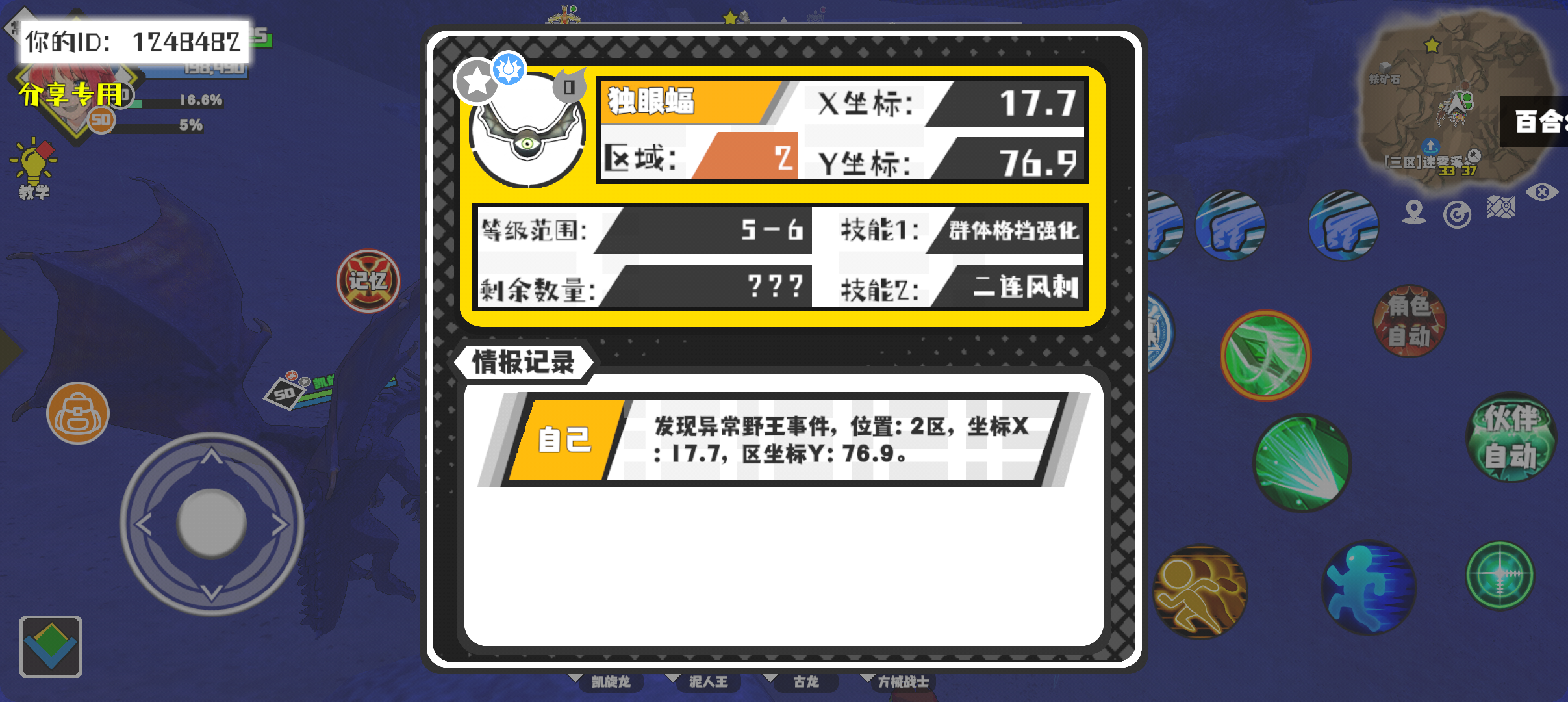 幸运时刻分享! 【野王异常出没】12月11日下午3点 - 独眼蝠【强度0】 【2区】 【X:17.7, Y:76.9】#超数据世界
