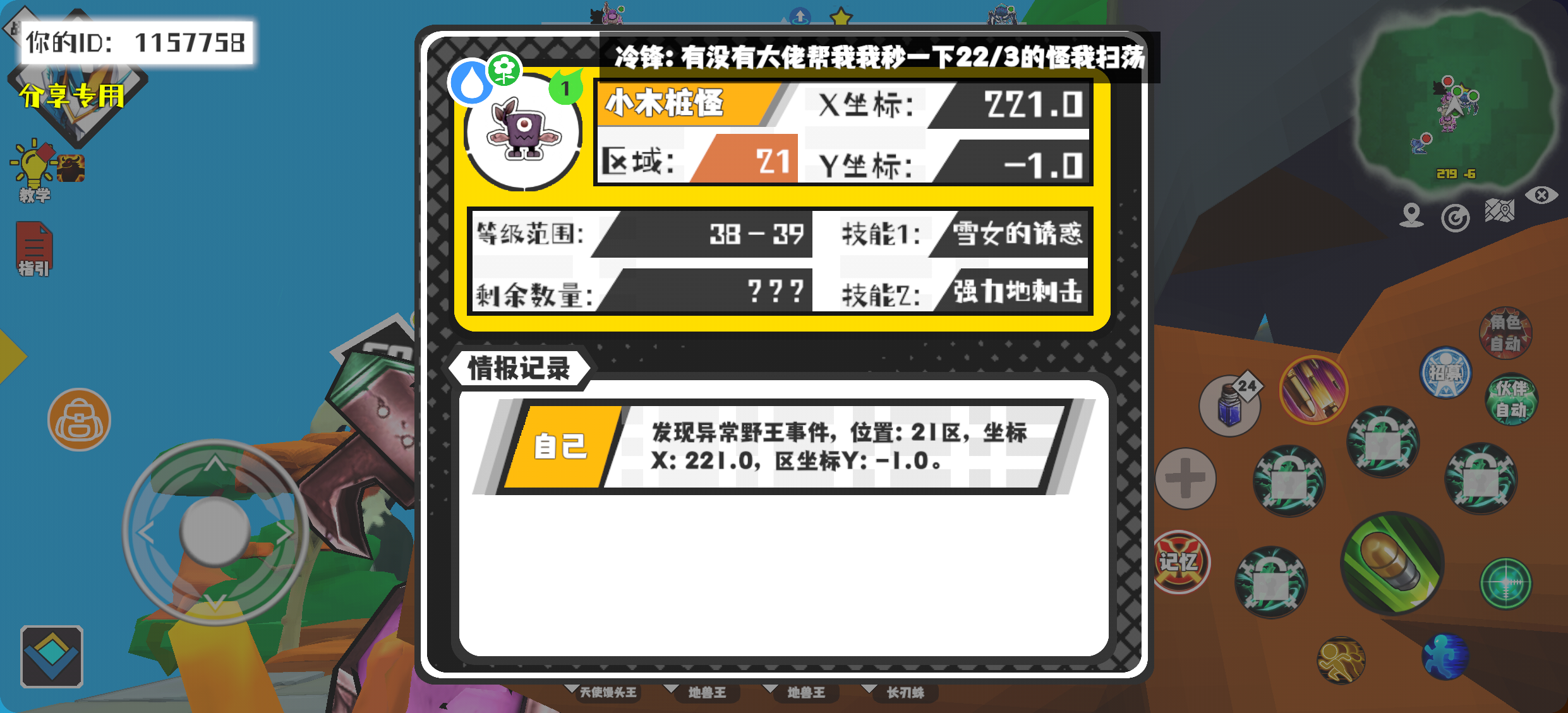 幸运时刻分享! 【野王异常出没】12月8日下午10点 - 小木桩怪【强度1】 【21区】 【X:221.0, Y:-1.0】#超数据世界