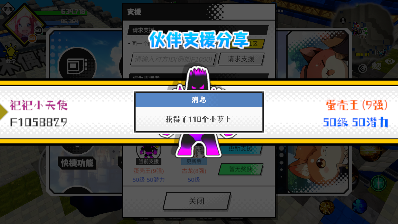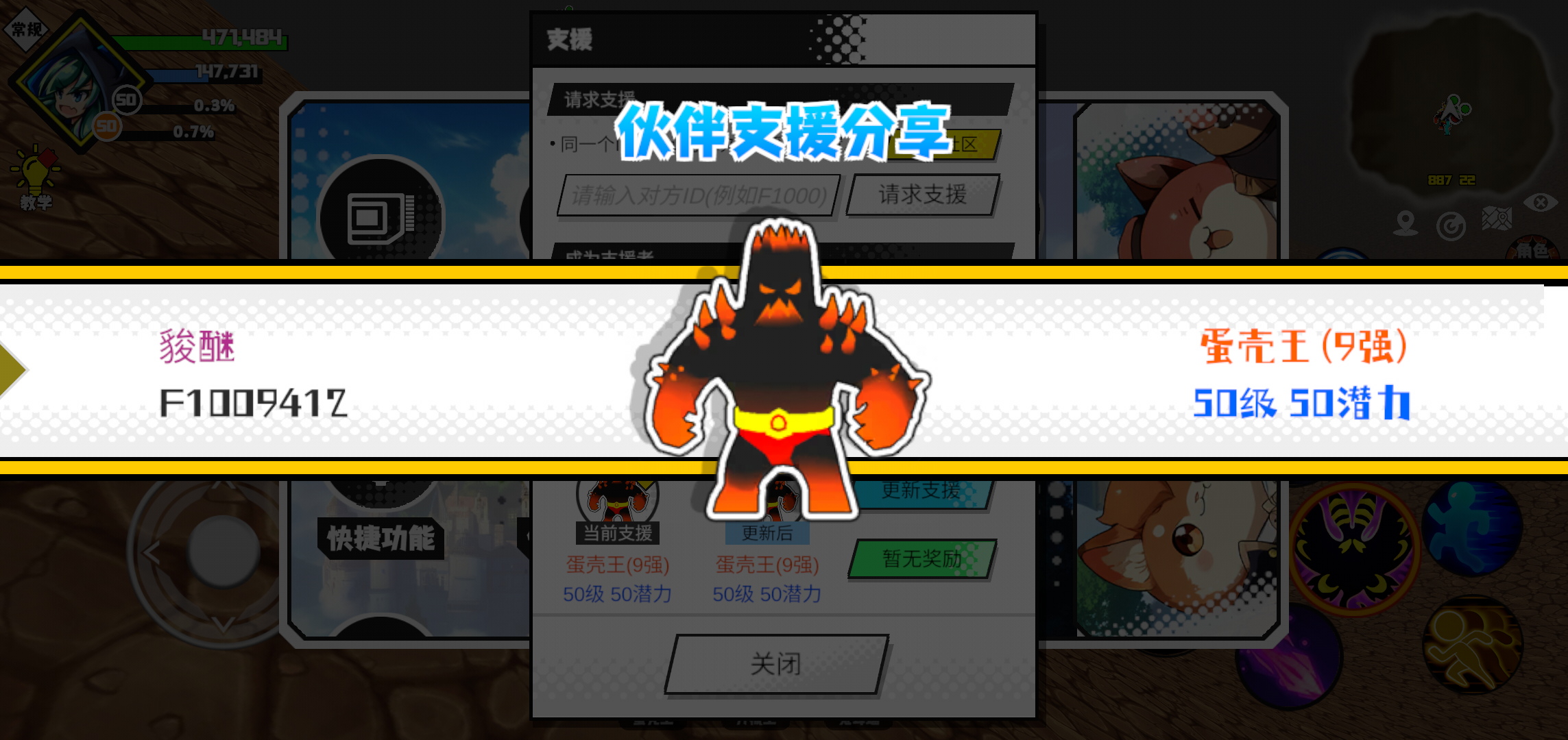 支援者:祀祀小天使(F1058829)如果遇到困难,可以召唤我的宠物帮忙,召唤方法是进入地图后点击左下角的手机功能>支援>输入【F1058829】>就可以召唤我的宠物!我的宠物是蛋壳王(9强)50级 50潜力技能1:黑魔破技能2:黑魔破技能3:黑魔破技能4:黑魔破智慧配点:245初阶职业:鬼咒进阶职业:气宗#超数据世界