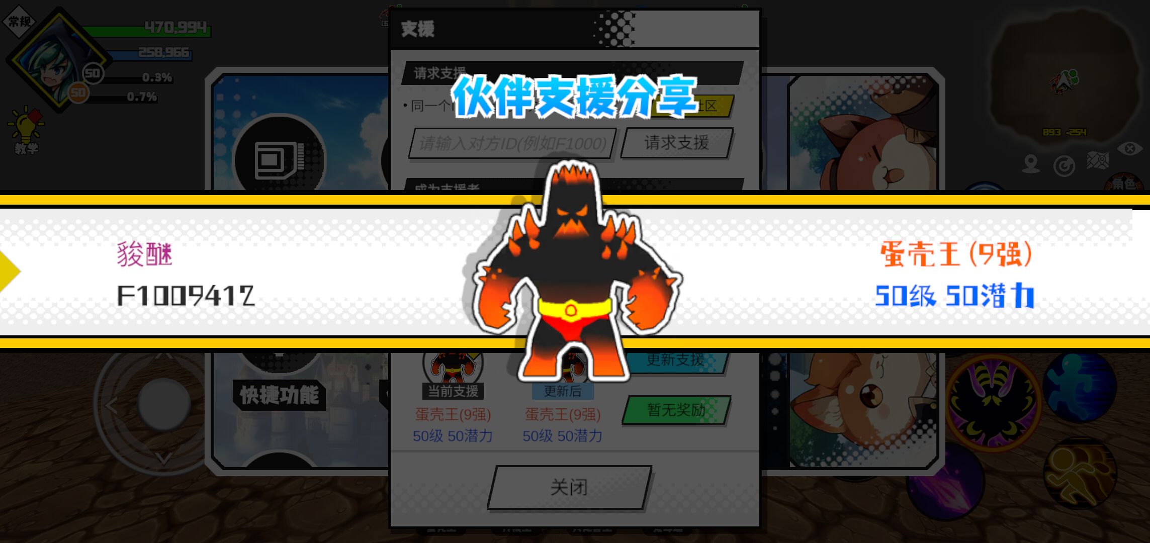 支援者:命(F1000289)如果遇到困难,可以召唤我的宠物帮忙,召唤方法是进入地图后点击左下角的手机功能>支援>输入【F1000289】>就可以召唤我的宠物!我的宠物是蛋壳王(9强)50级 50潜力技能1:火焰破技能2:火焰破技能3:火焰破技能4:火焰破智慧配点:245初阶职业:鬼咒进阶职业:海神#超数据世界