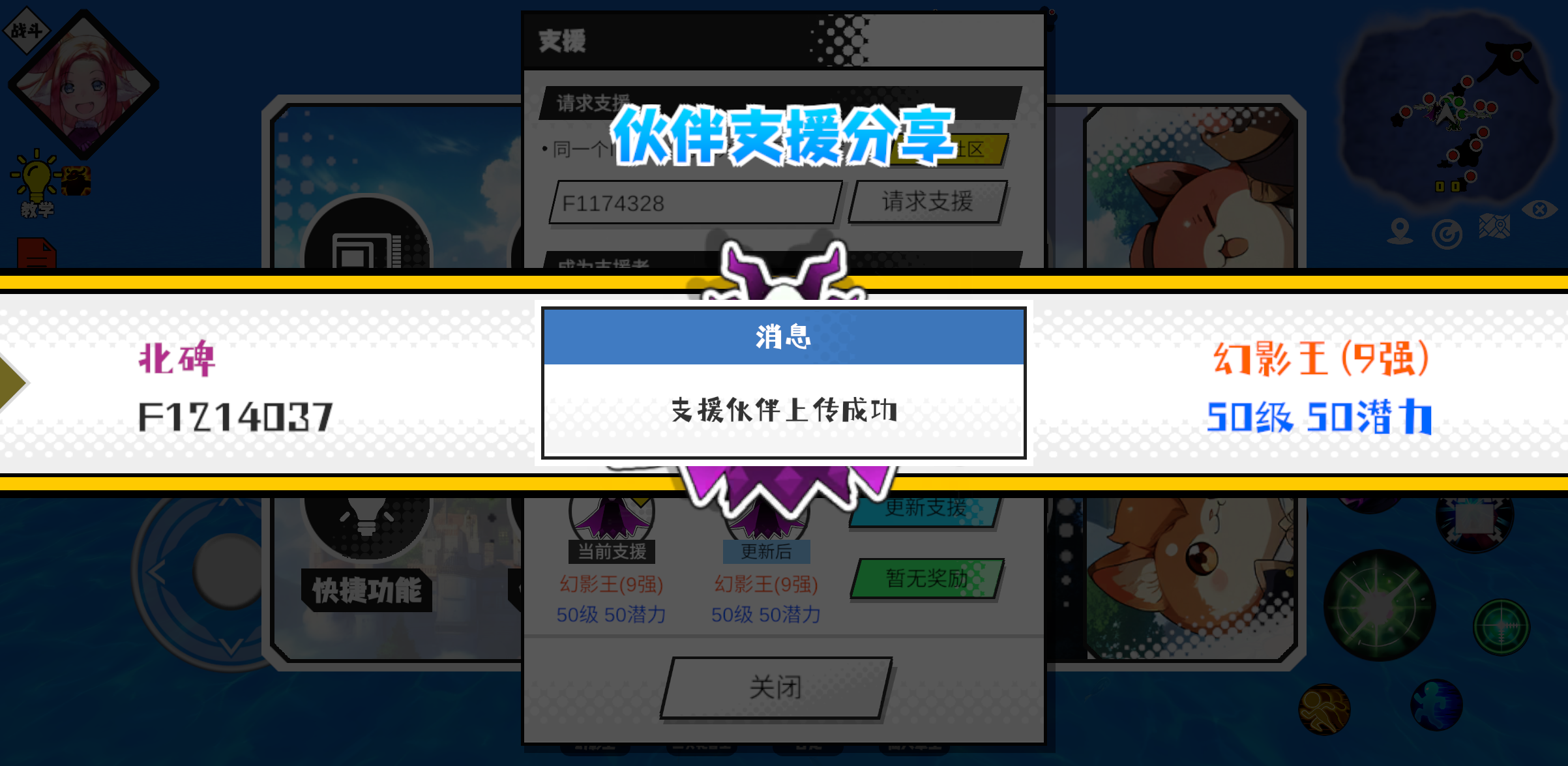 支援者:两仪式(F1024742)如果遇到困难,可以召唤我的宠物帮忙,召唤方法是进入地图后点击左下角的手机功能>支援>输入【F1024742】>就可以召唤我的宠物!我的宠物是蛋壳王(9强)50级 50潜力技能1:黑魔破技能2:黑魔破技能3:黑魔破技能4:黑魔破智慧配点:245初阶职业:鬼咒进阶职业:海神#超数据世界