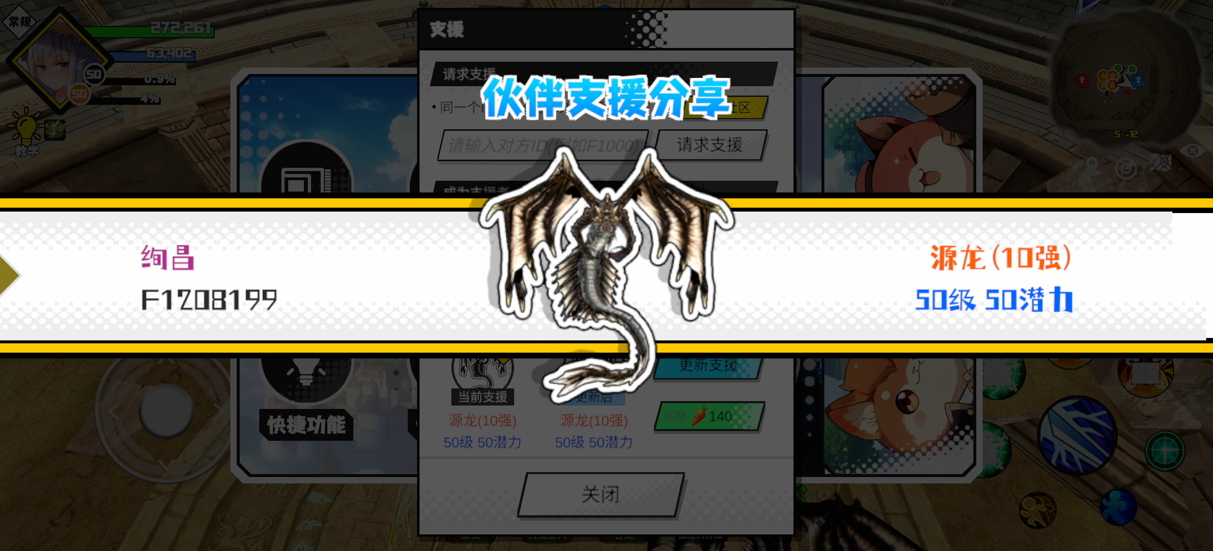 支援者:绚昌(F1208199)如果遇到困难,可以召唤我的宠物帮忙,召唤方法是进入地图后点击左下角的手机功能>支援>输入【F1208199】>就可以召唤我的宠物!我的宠物是源龙(10强)50级 50潜力技能1:黑暗升龙击技能2:黑暗升龙击技能3:火之意技能4:魔源力量配点:145敏捷配点:100初阶职业:暗猎进阶职业:无极#超数据世界