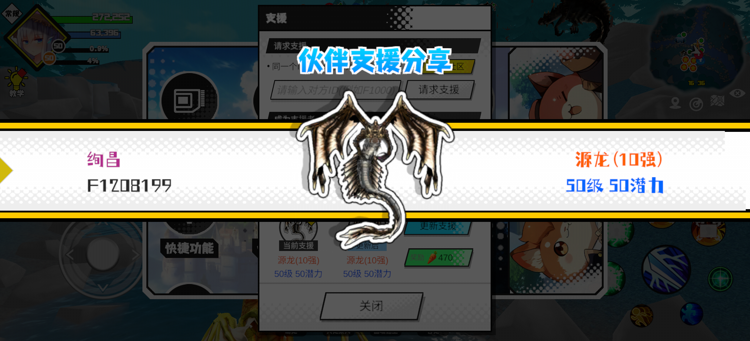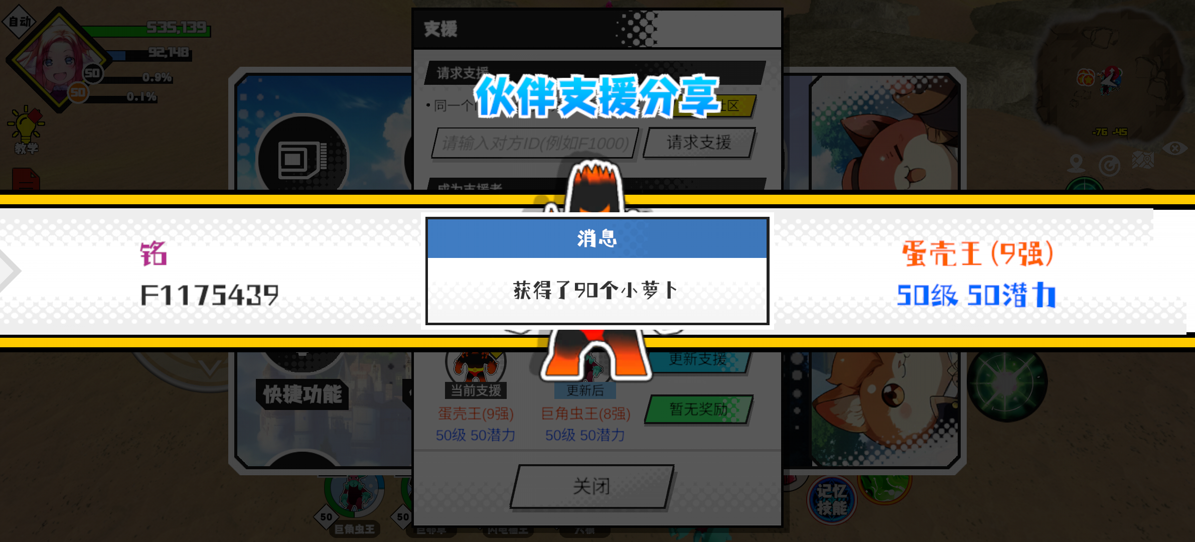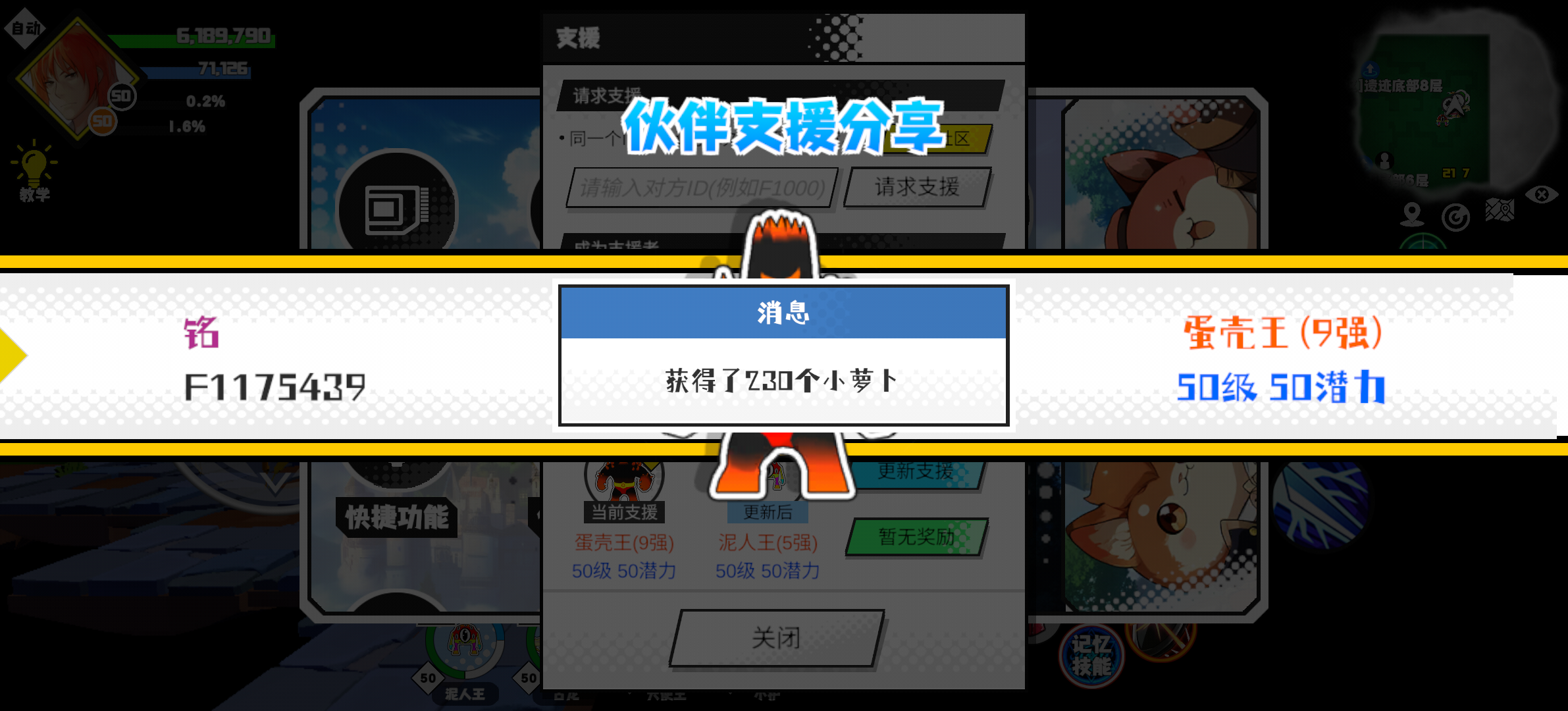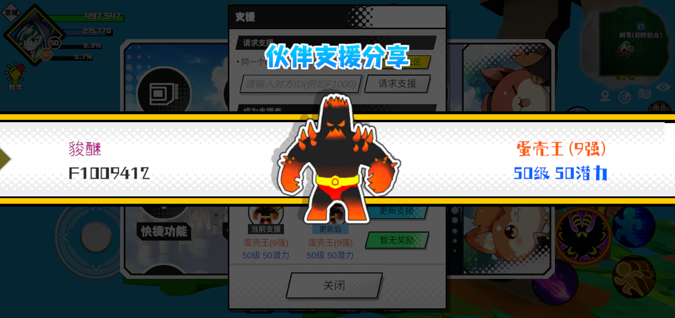支援者:命(F1000289)如果遇到困难,可以召唤我的宠物帮忙,召唤方法是进入地图后点击左下角的手机功能>支援>输入【F1000289】>就可以召唤我的宠物!我的宠物是蛋壳王(9强)50级 50潜力技能1:火焰破技能2:火焰破技能3:火焰破技能4:火焰破智慧配点:245初阶职业:鬼咒进阶职业:海神#超数据世界