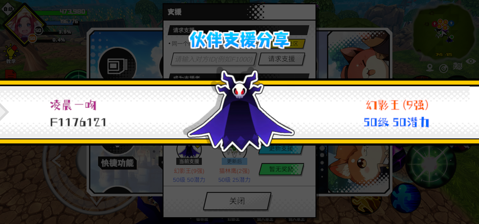 支援者:凌晨一吻(F1176121)如果遇到困难,可以召唤我的宠物帮忙,召唤方法是进入地图后点击左下角的手机功能>支援>输入【F1176121】>就可以召唤我的宠物!我的宠物是幻影王(9强)50级 50潜力技能1:黑魔破技能2:黑魔破技能3:黑魔破技能4:黑魔破智慧配点:245初阶职业:鬼咒进阶职业:海神#超数据世界