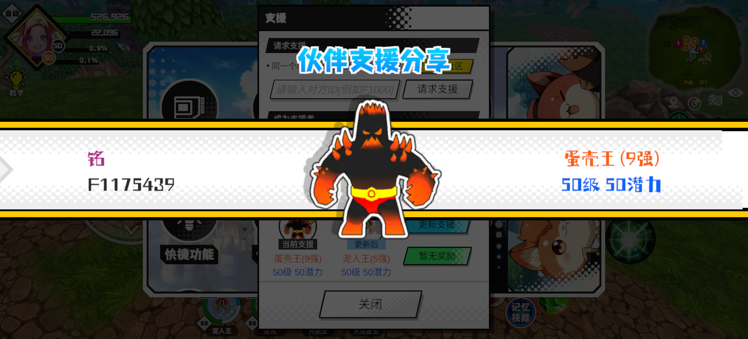 支援者:铭(F1175439)如果遇到困难,可以召唤我的宠物帮忙,召唤方法是进入地图后点击左下角的手机功能>支援>输入【F1175439】>就可以召唤我的宠物!我的宠物是蛋壳王(9强)50级 50潜力技能1:黑魔破技能2:黑魔破技能3:黑魔破技能4:黑魔破智慧配点:245初阶职业:魔导进阶职业:海神#超数据世界 #超数据世界