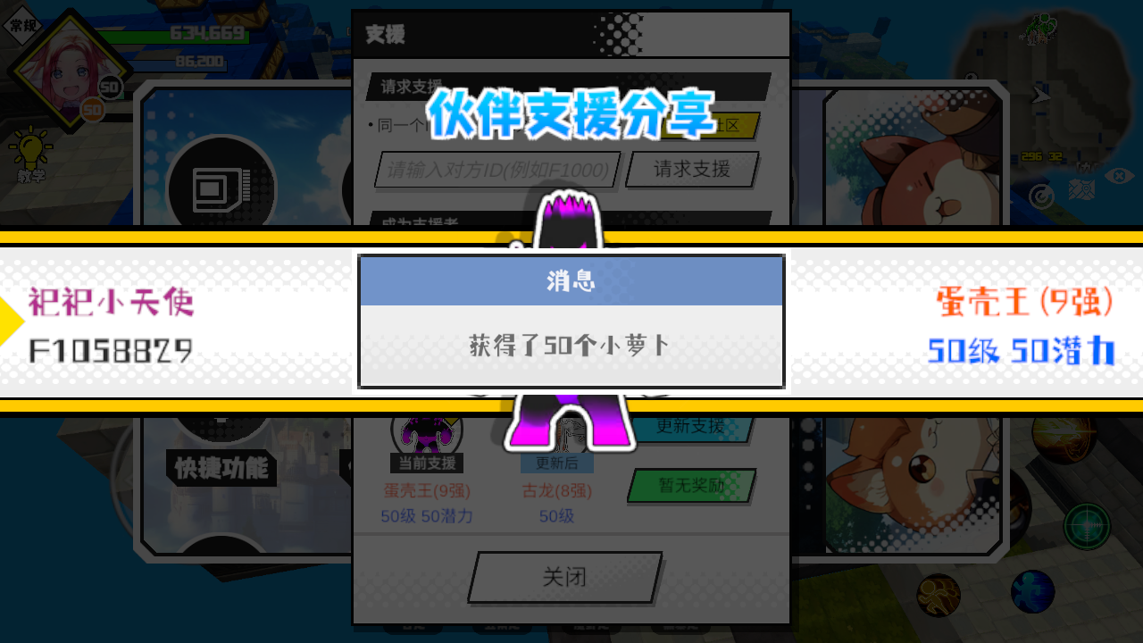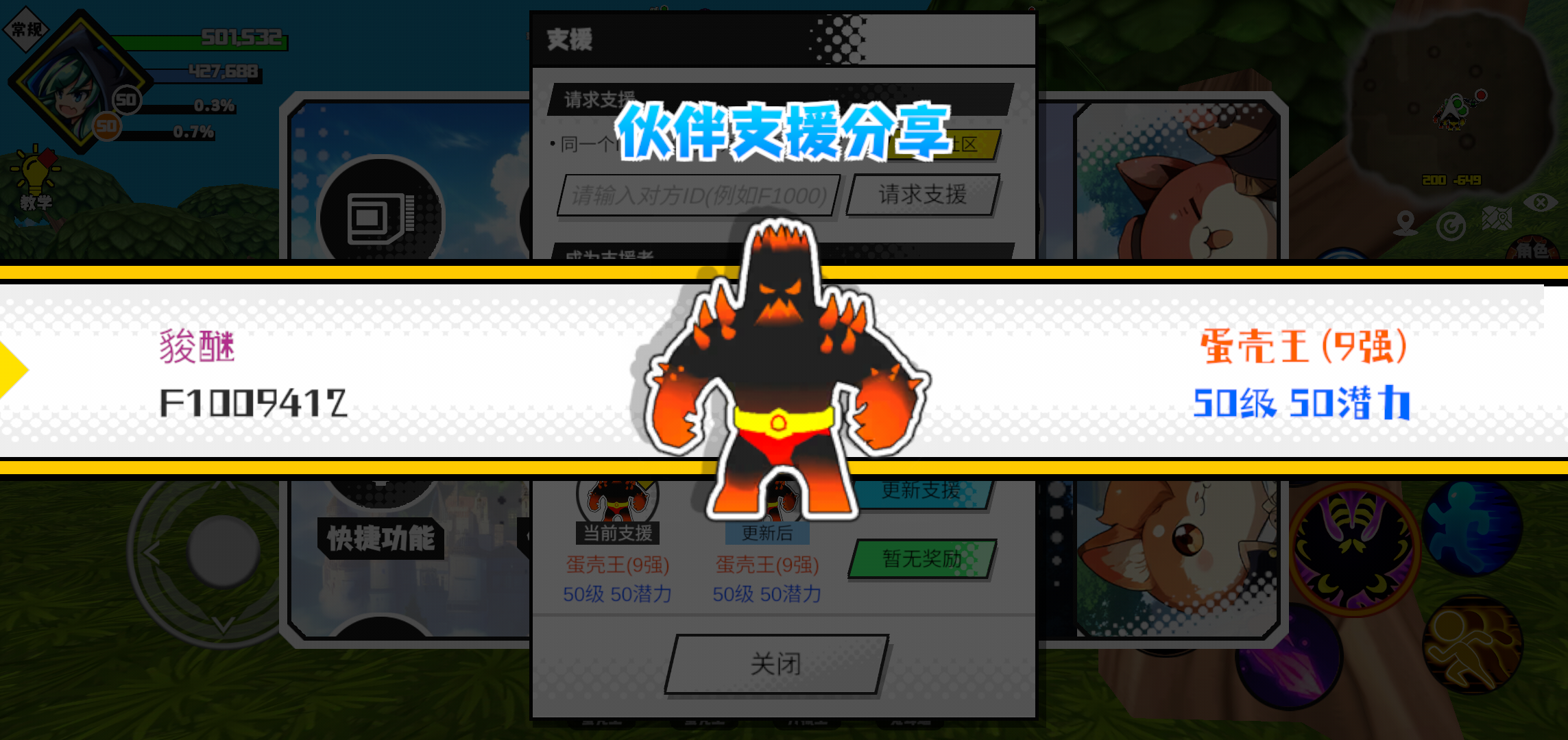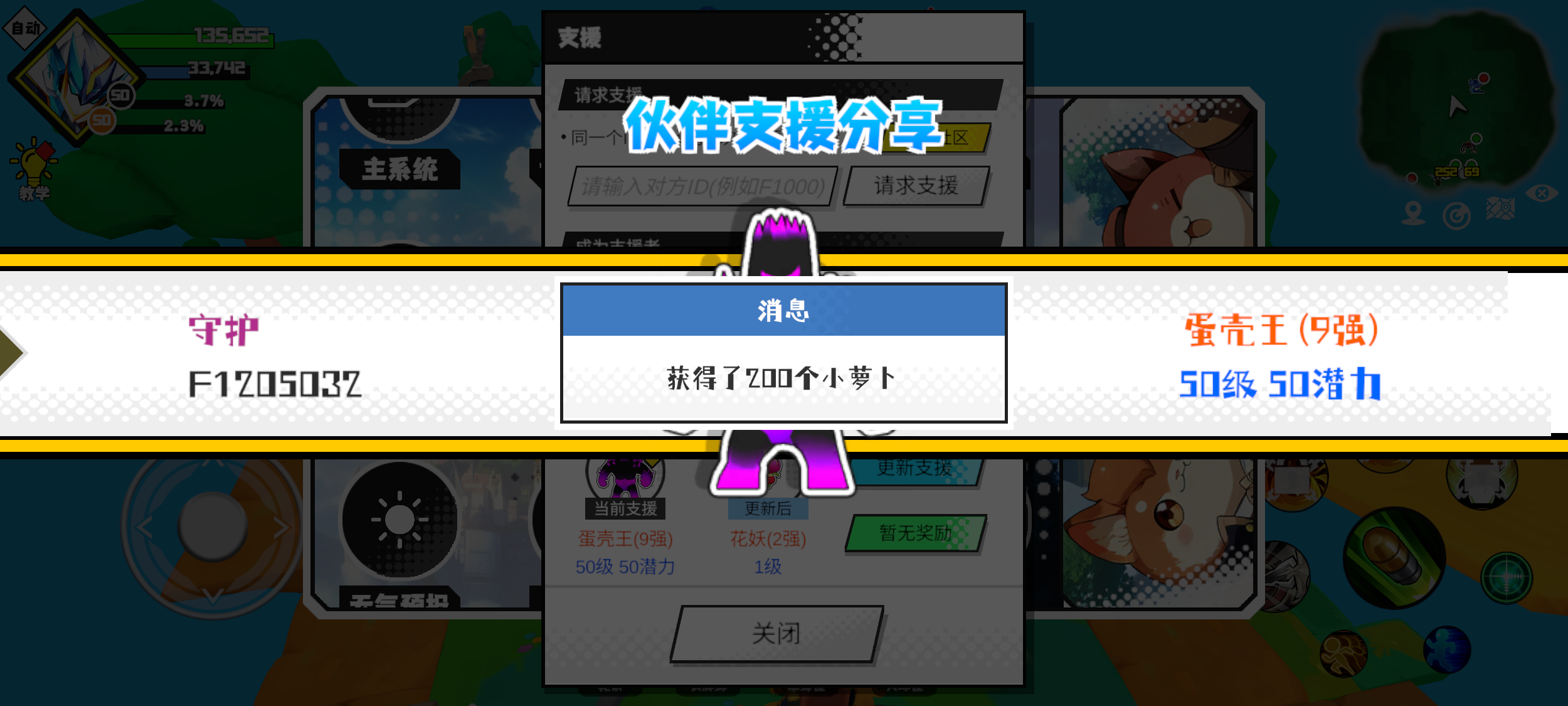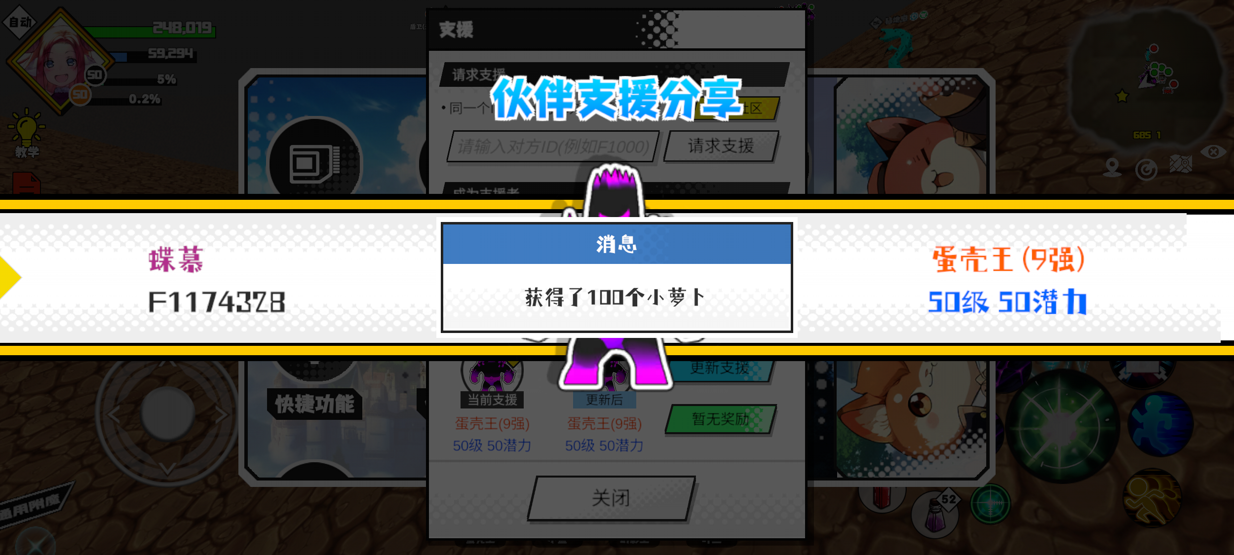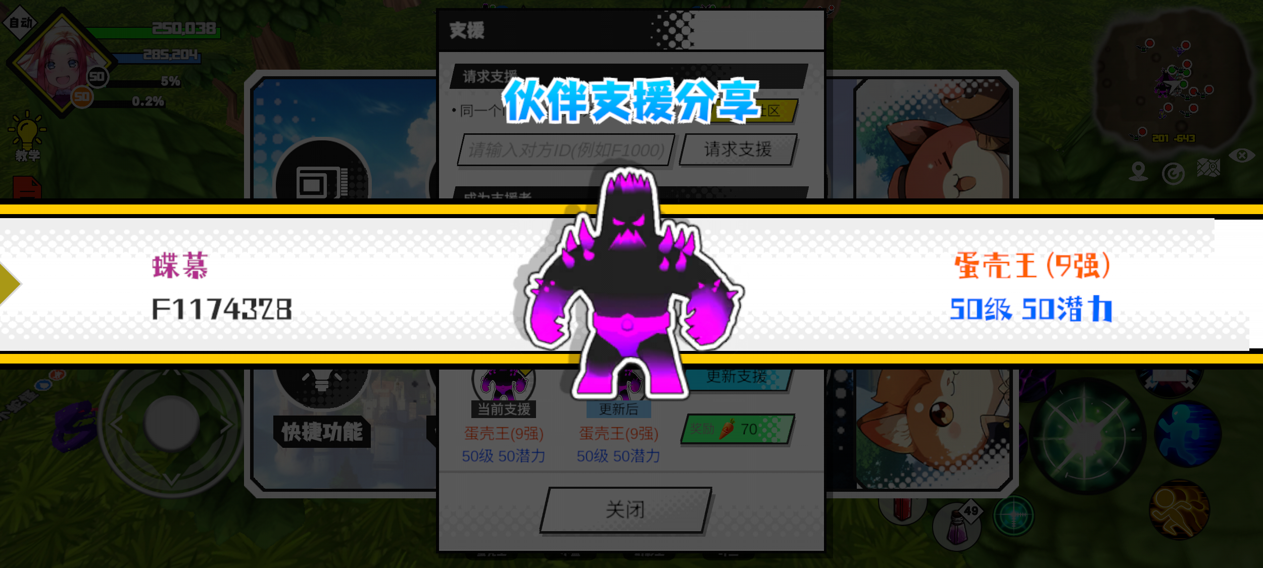支援者:祀祀小天使(F1058829)如果遇到困难,可以召唤我的宠物帮忙,召唤方法是进入地图后点击左下角的手机功能>支援>输入【F1058829】>就可以召唤我的宠物!我的宠物是蛋壳王(9强)50级 50潜力技能1:黑魔破技能2:黑魔破技能3:黑魔破技能4:黑魔破智慧配点:245初阶职业:鬼咒进阶职业:气宗#超数据世界
