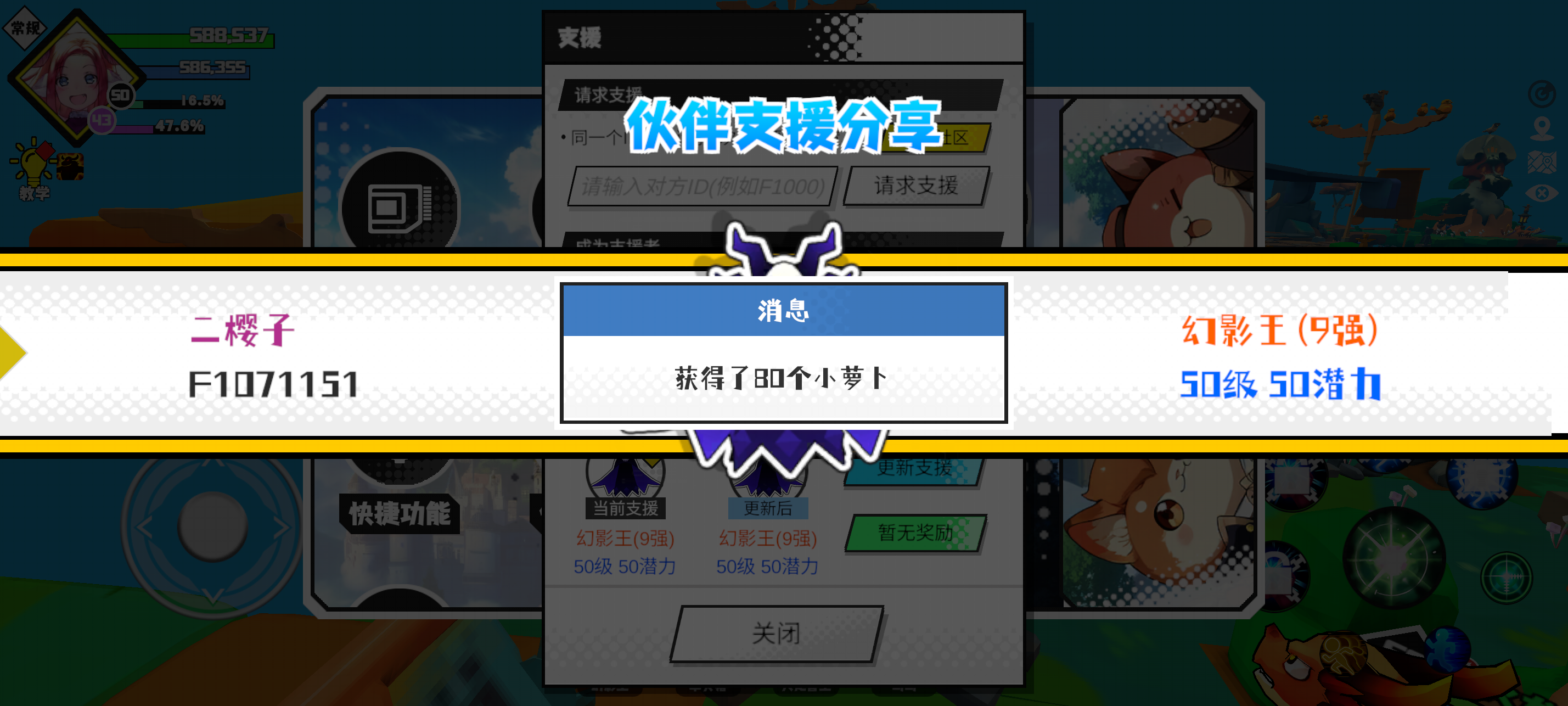 支援者:二樱子(F1071151)如果遇到困难,可以召唤我的宠物帮忙,召唤方法是进入地图后点击左下角的手机功能>支援>输入【F1071151】>就可以召唤我的宠物!我的宠物是幻影王(9强)50级 50潜力技能1:黑魔破技能2:黑魔破技能3:黑魔破技能4:黑魔破智慧配点:245初阶职业:鬼咒进阶职业:海神#超数据世界