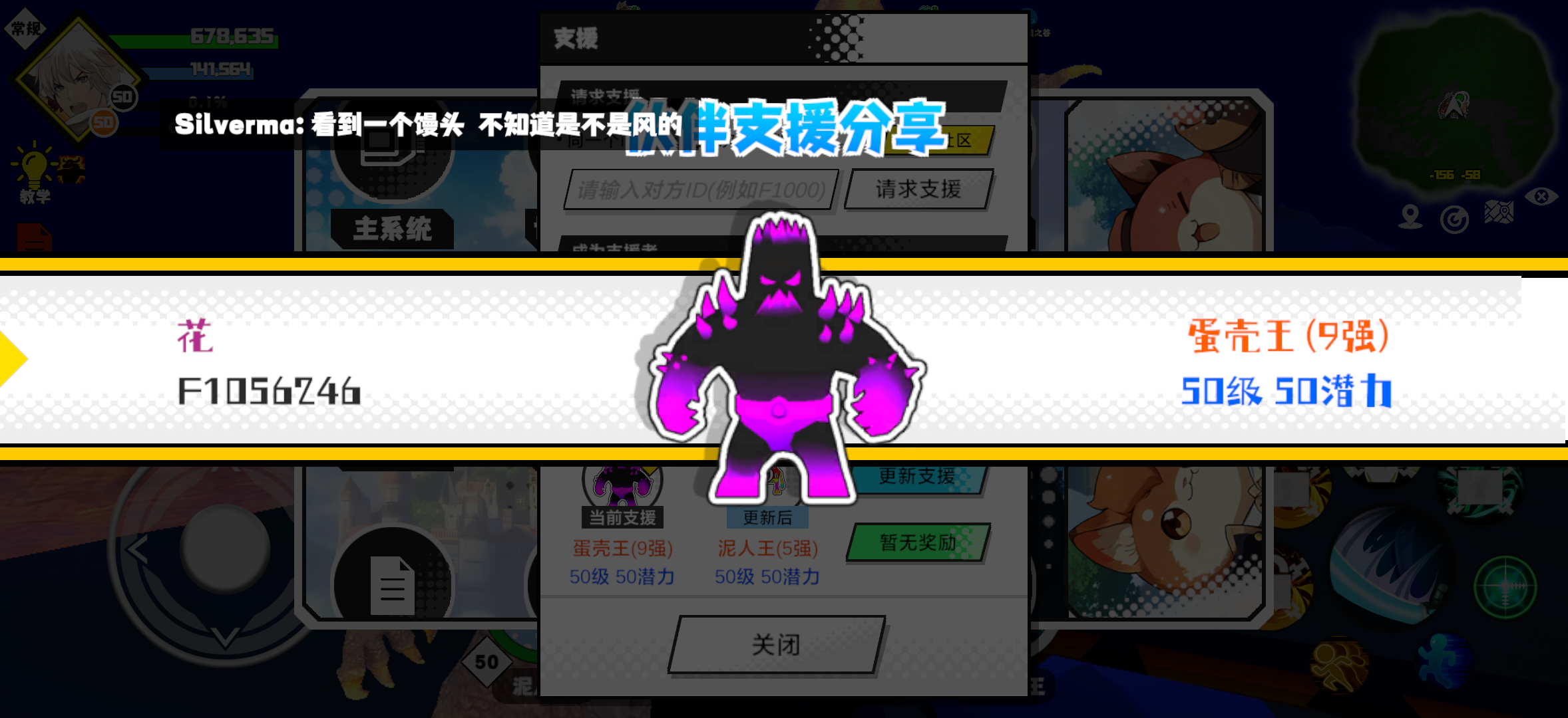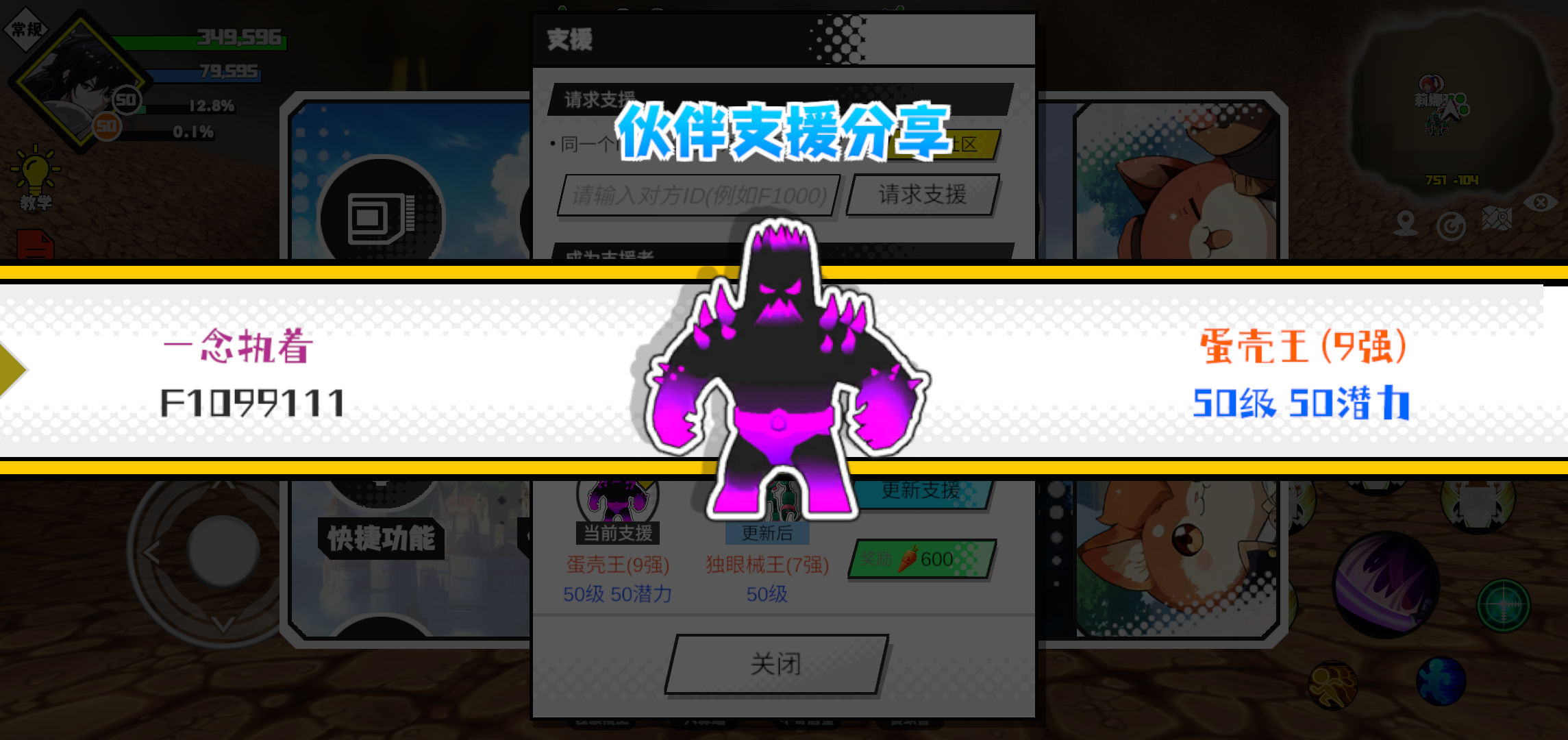 #超数据世界 支援者:嘉宝(F1219461)如果遇到困难,可以召唤我的宠物帮忙,召唤方法是进入地图后点击左下角的手机功能>支援>输入【F1219461】>就可以召唤我的宠物!我的宠物是蛋壳王(9强)50级 50潜力技能1:火焰破技能2:燃热之地技能3:魔源技能4:魔者智慧配点:245初阶职业:鬼咒进阶职业:海神