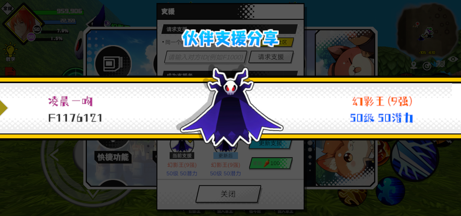 支援者:凌晨一吻(F1176121)如果遇到困难,可以召唤我的宠物帮忙,召唤方法是进入地图后点击左下角的手机功能>支援>输入【F1176121】>就可以召唤我的宠物!我的宠物是幻影王(9强)50级 50潜力技能1:黑魔破技能2:黑魔破技能3:黑魔破技能4:黑魔破智慧配点:245初阶职业:鬼咒进阶职业:海神#超数据世界