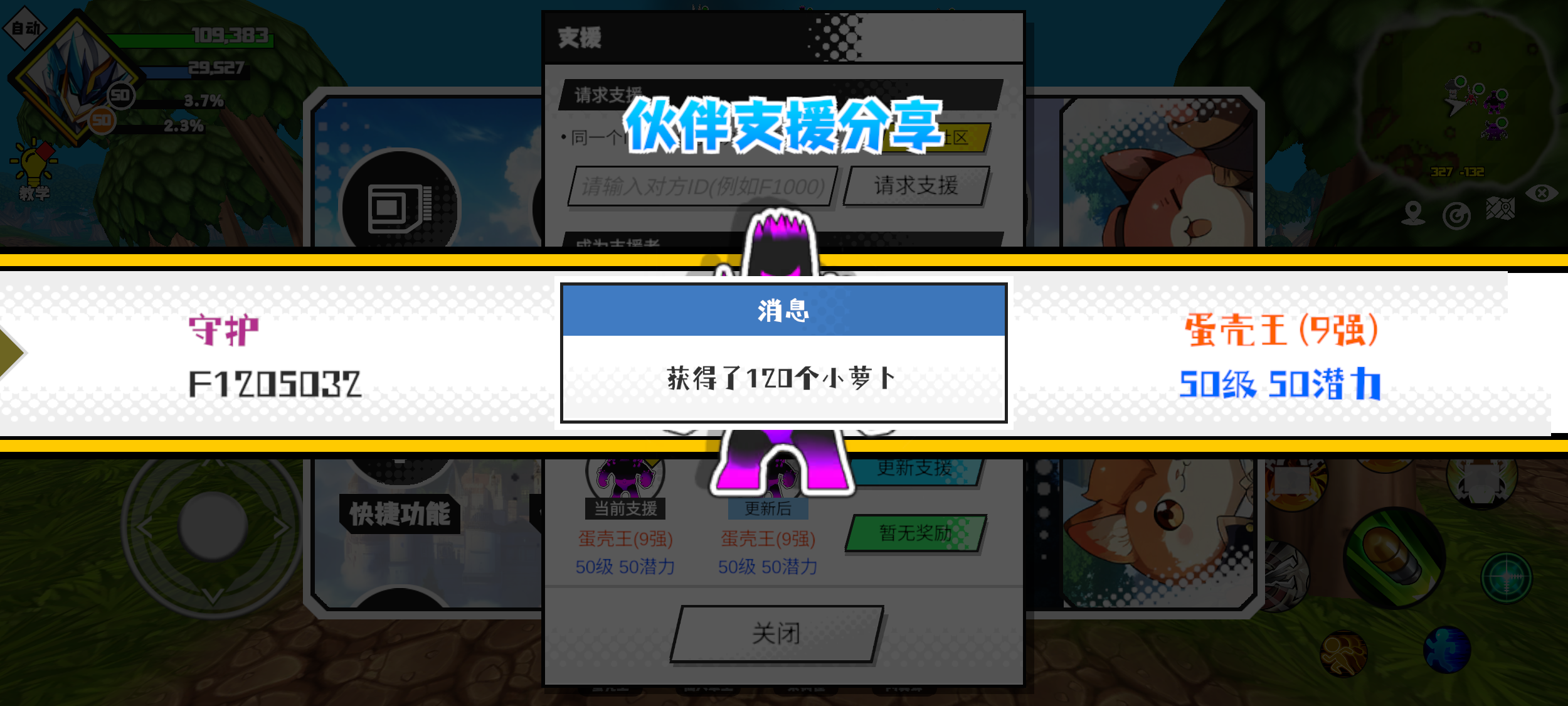 支援者:守护(F1205032)如果遇到困难,可以召唤我的宠物帮忙,召唤方法是进入地图后点击左下角的手机功能>支援>输入【F1205032】>就可以召唤我的宠物!我的宠物是蛋壳王(9强)50级 50潜力技能1:黑魔破技能2:黑魔破技能3:魔炮十连技能4:智慧智慧配点:245初阶职业:鬼咒进阶职业:海神#超数据世界 #超数据世界