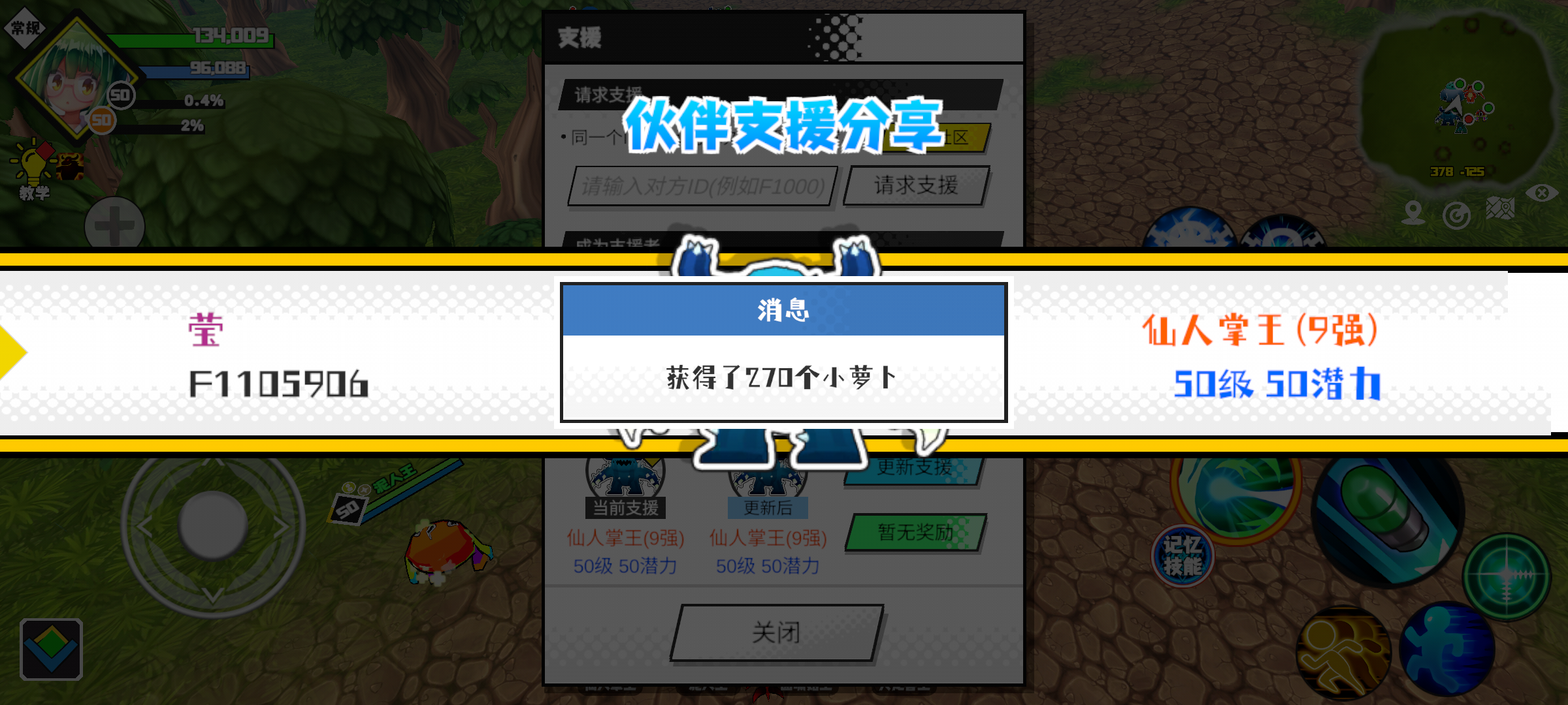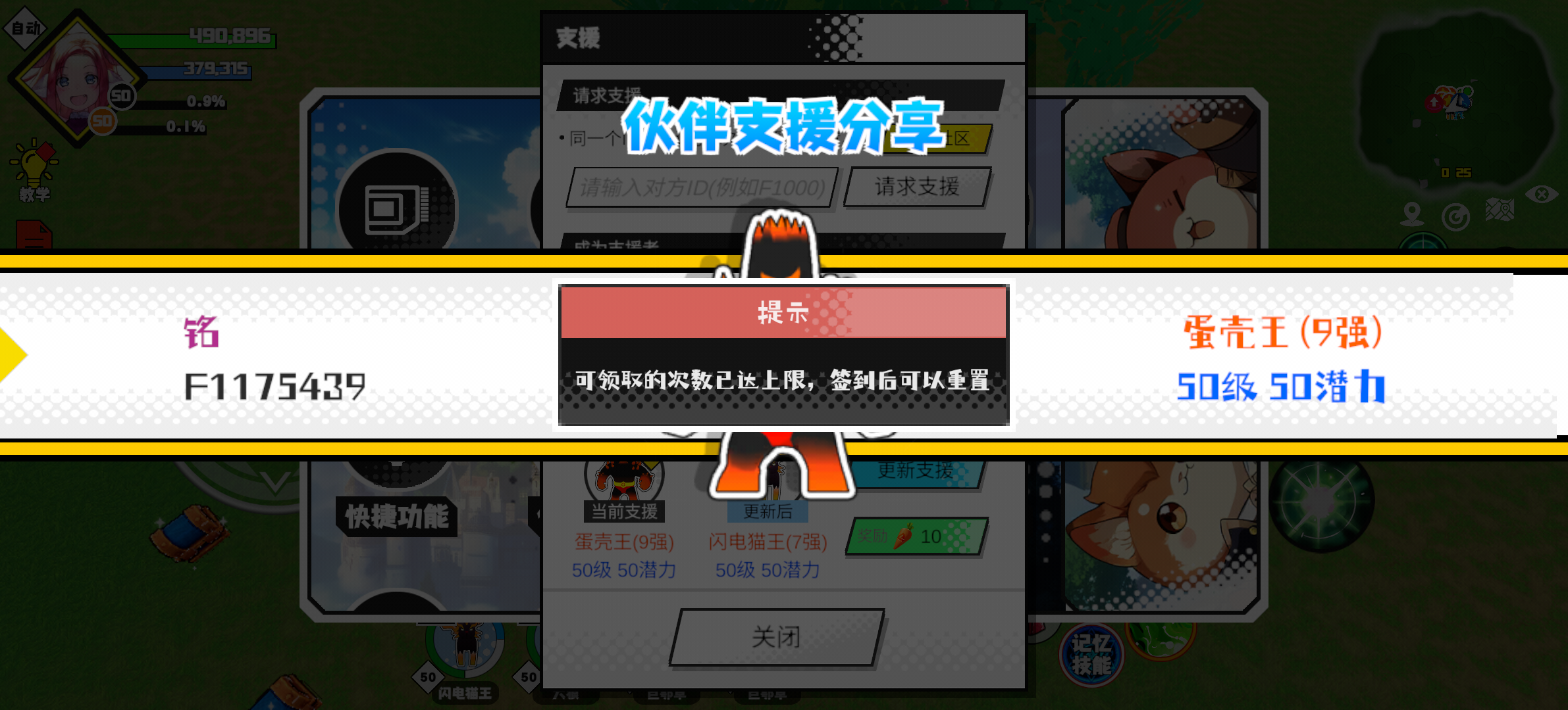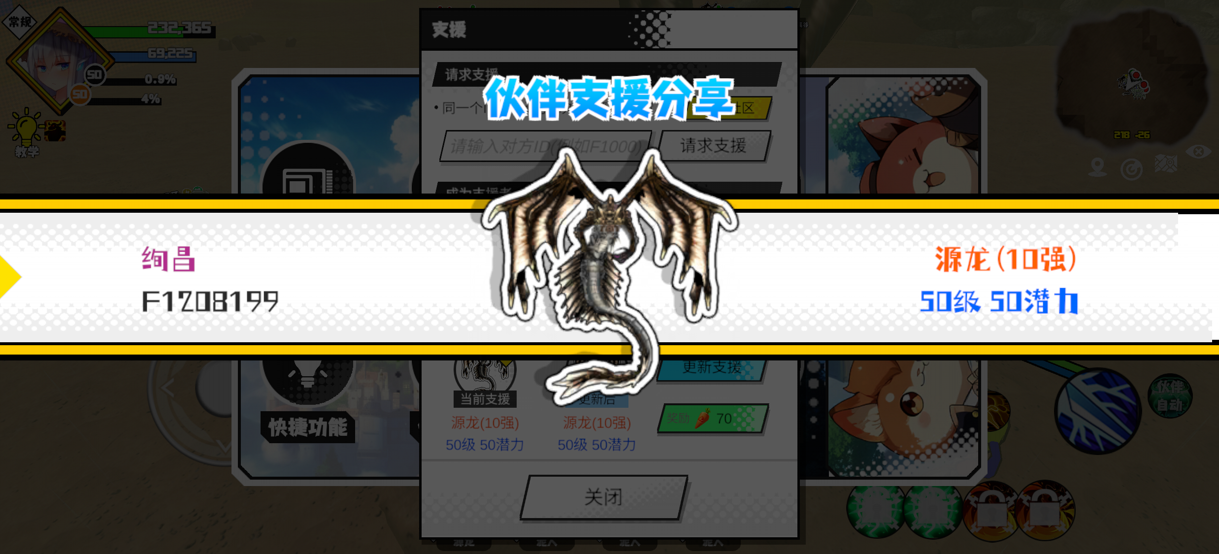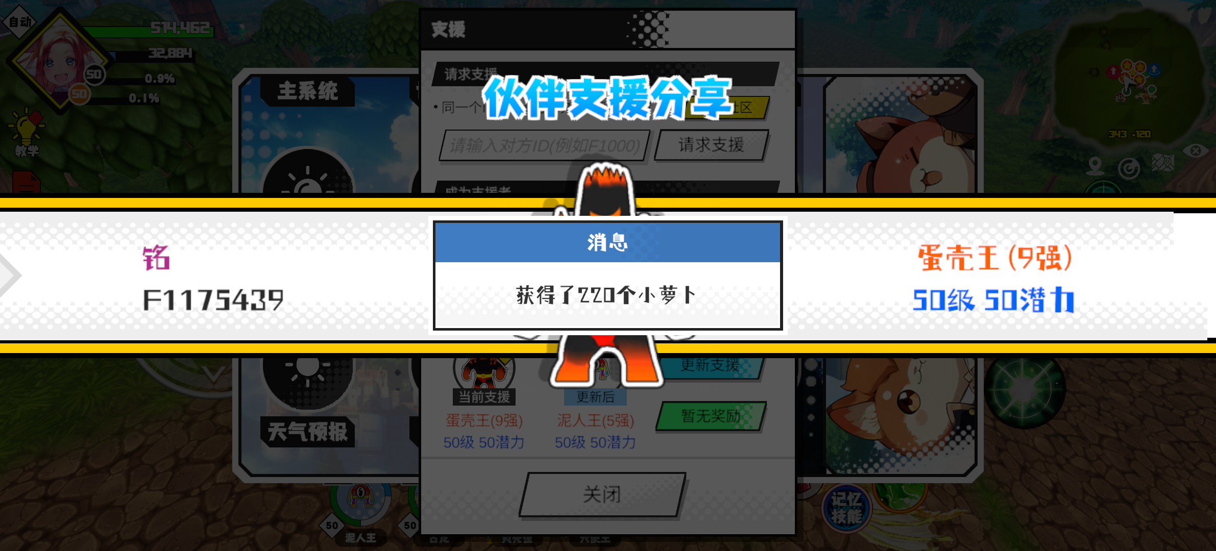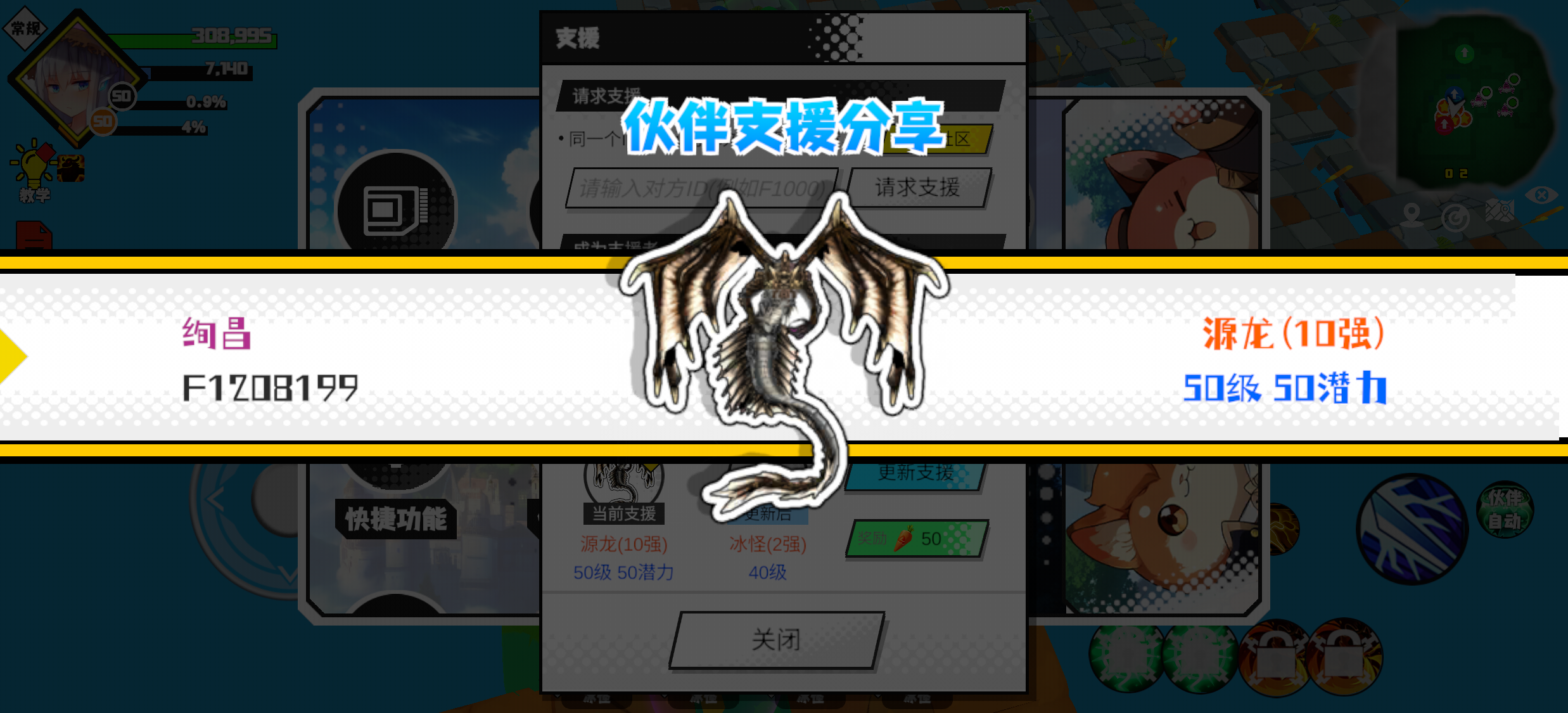 支援者:命(F1000289)如果遇到困难,可以召唤我的宠物帮忙,召唤方法是进入地图后点击左下角的手机功能>支援>输入【F1000289】>就可以召唤我的宠物!我的宠物是蛋壳王(9强)50级 50潜力技能1:火焰破技能2:火焰破技能3:火焰破技能4:火焰破智慧配点:245初阶职业:鬼咒进阶职业:海神#超数据世界