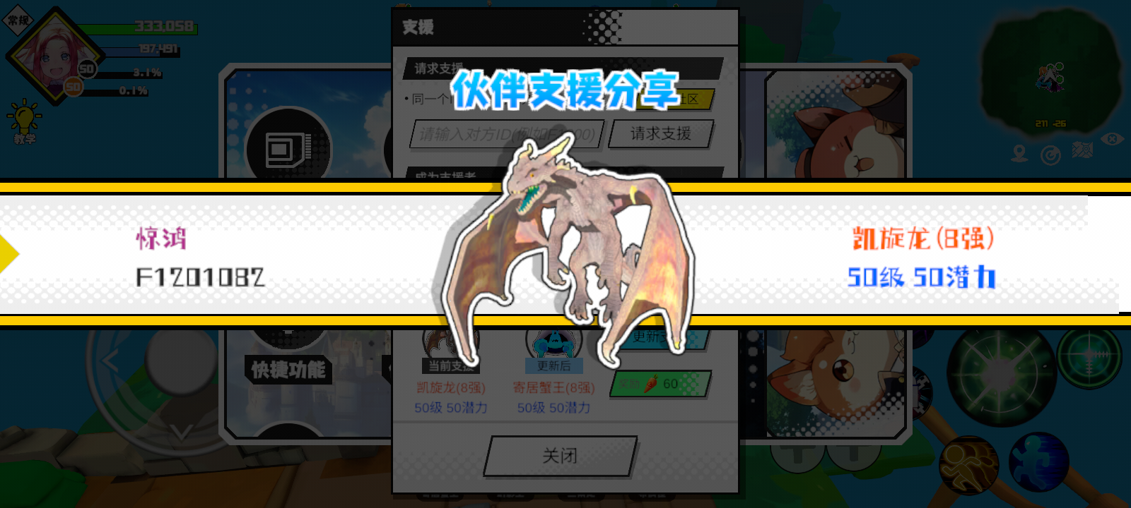 支援者:惊鸿(F1201082)如果遇到困难,可以召唤我的宠物帮忙,召唤方法是进入地图后点击左下角的手机功能>支援>输入【F1201082】>就可以召唤我的宠物!我的宠物是凯旋龙(8强)50级 50潜力技能1:火之意技能2:黑暗升龙击技能3:黑暗升龙击技能4:魔源力量配点:145敏捷配点:100初阶职业:暗猎进阶职业:无极#超数据世界