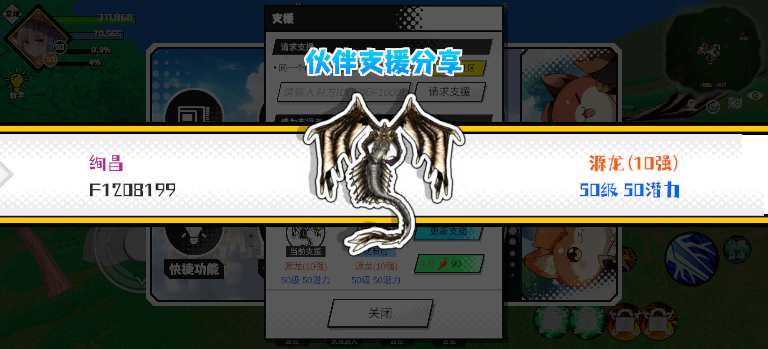 支援者:绚昌(F1208199)如果遇到困难,可以召唤我的宠物帮忙,召唤方法是进入地图后点击左下角的手机功能>支援>输入【F1208199】>就可以召唤我的宠物!我的宠物是源龙(10强)50级 50潜力技能1:黑暗升龙击技能2:黑暗升龙击技能3:火之意技能4:魔源力量配点:145敏捷配点:100初阶职业:暗猎进阶职业:无极#超数据世界