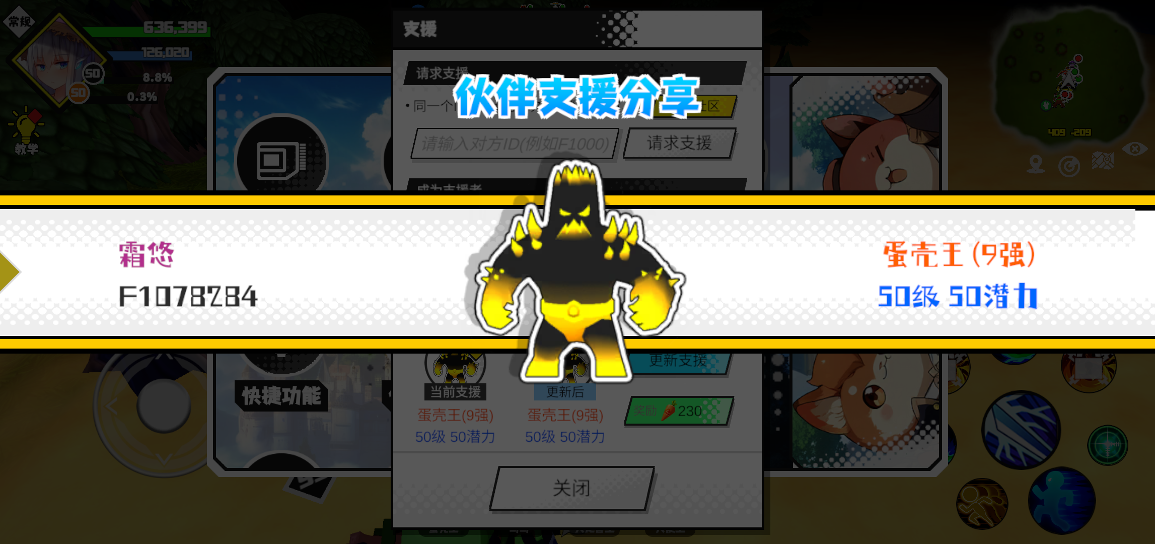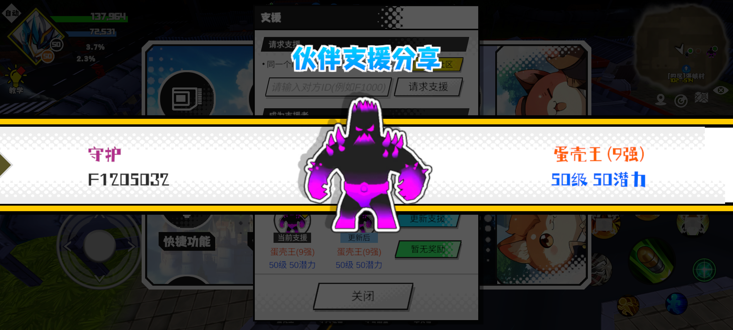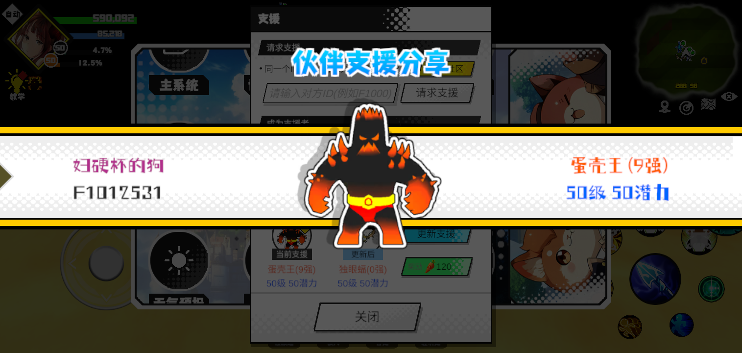 #超数据世界 #超数据世界 支援者:妇硬杯的狗(F1012531)如果遇到困难,可以召唤我的宠物帮忙,召唤方法是进入地图后点击左下角的手机功能>支援>输入【F1012531】>就可以召唤我的宠物!我的宠物是蛋壳王(9强)50级 50潜力技能1:火炮十连技能2:燃热之地技能3:燃热之地技能4:智慧智慧配点:245初阶职业:鬼咒进阶职业:气宗