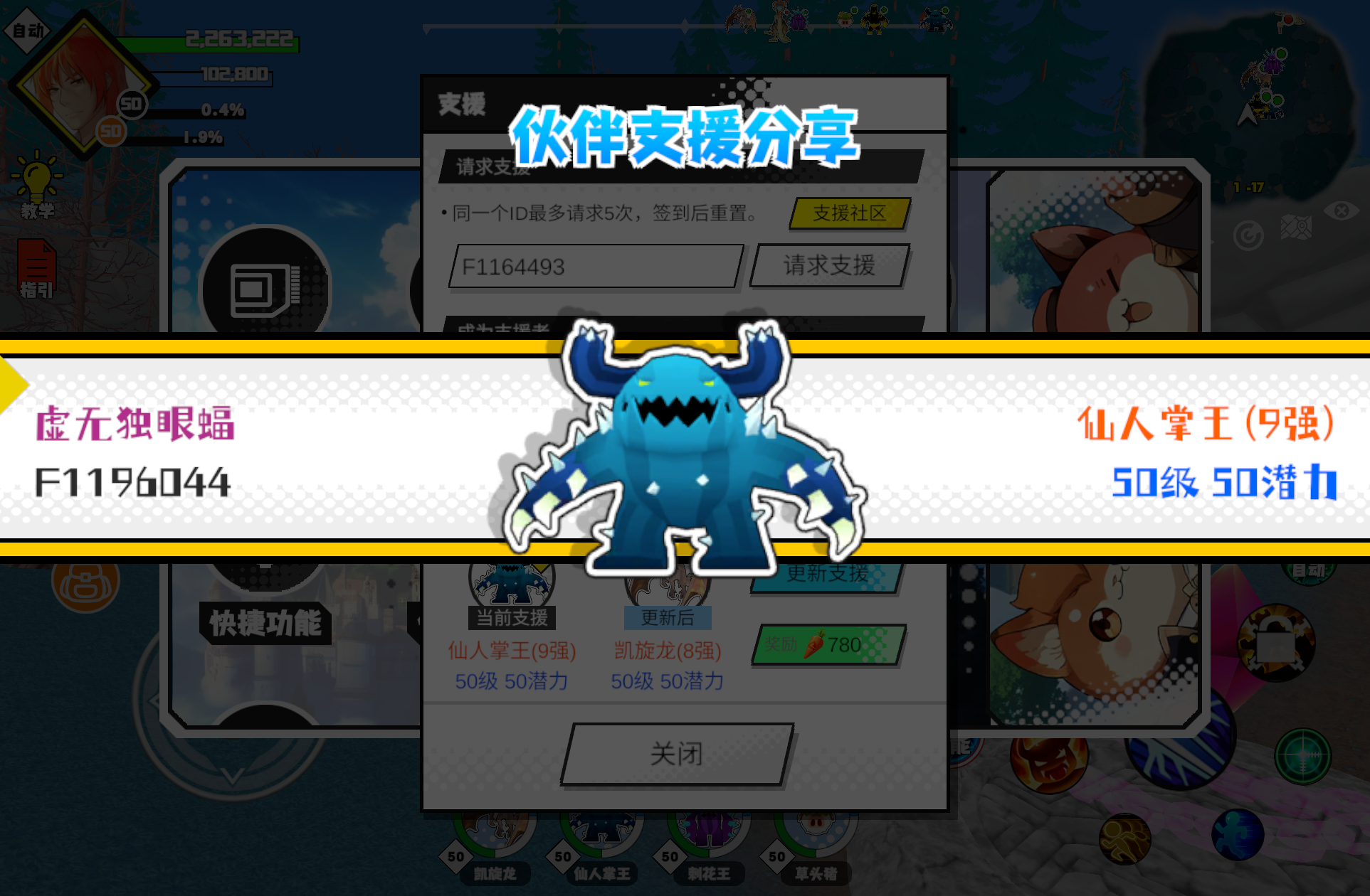 支援者:黑到发光(F1213582)如果遇到困难,可以召唤我的宠物帮忙,召唤方法是进入地图后点击左下角的手机功能>支援>输入【F1213582】>就可以召唤我的宠物!我的宠物是仙人掌王(9强)50级 50潜力技能1:魔源技能2:八雷神术技能3:八雷神术技能4:八雷神术智慧配点:245初阶职业:鬼咒进阶职业:海神#超数据世界