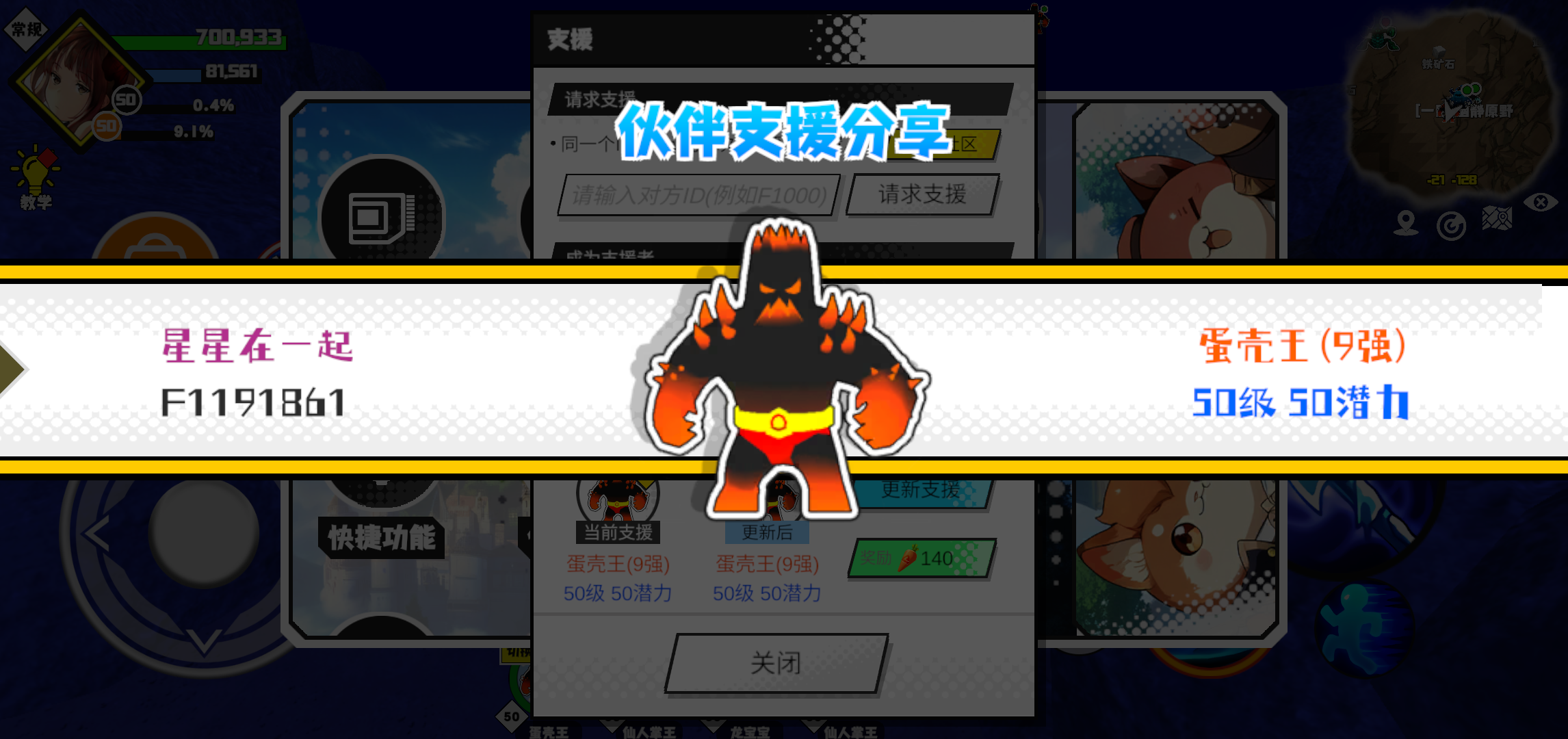 支援者:星星在一起(F1191861)如果遇到困难,可以召唤我的宠物帮忙,召唤方法是进入地图后点击左下角的手机功能>支援>输入【F1191861】>就可以召唤我的宠物!我的宠物是蛋壳王(9强)50级 50潜力技能1:魔源技能2:火焰大爆炸技能3:火焰大爆炸技能4:火焰大爆炸敏捷配点:1智慧配点:244初阶职业:鬼咒进阶职业:海神#超数据世界