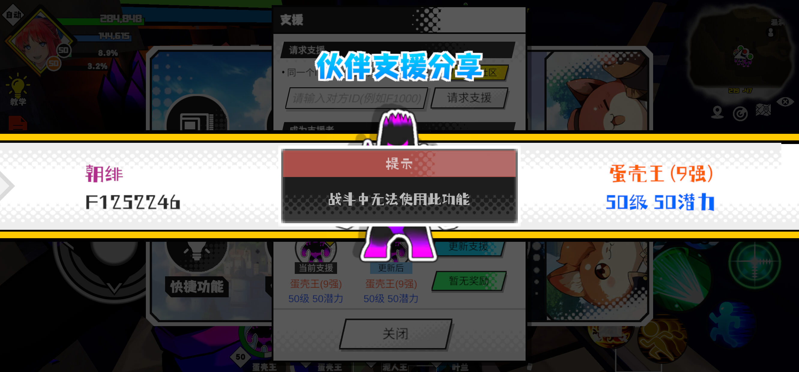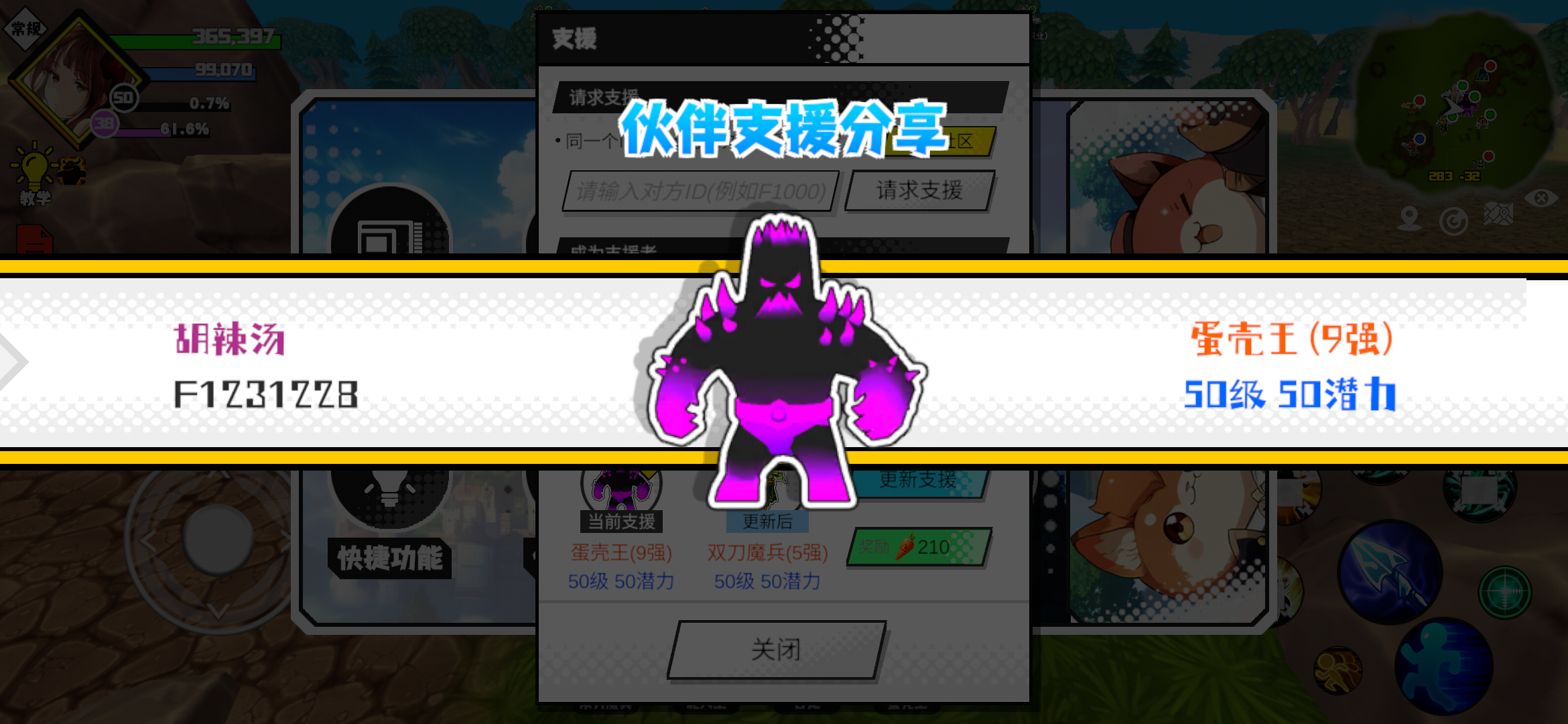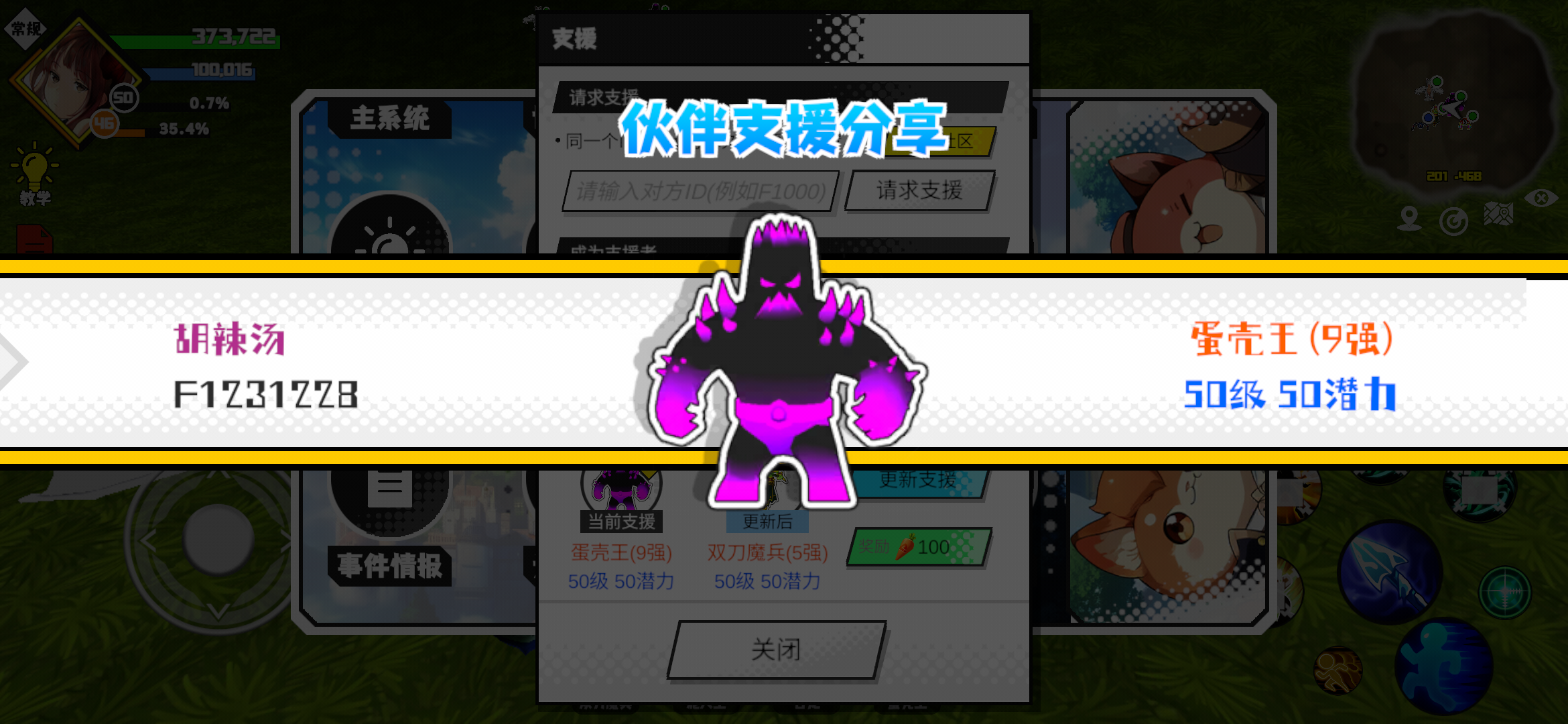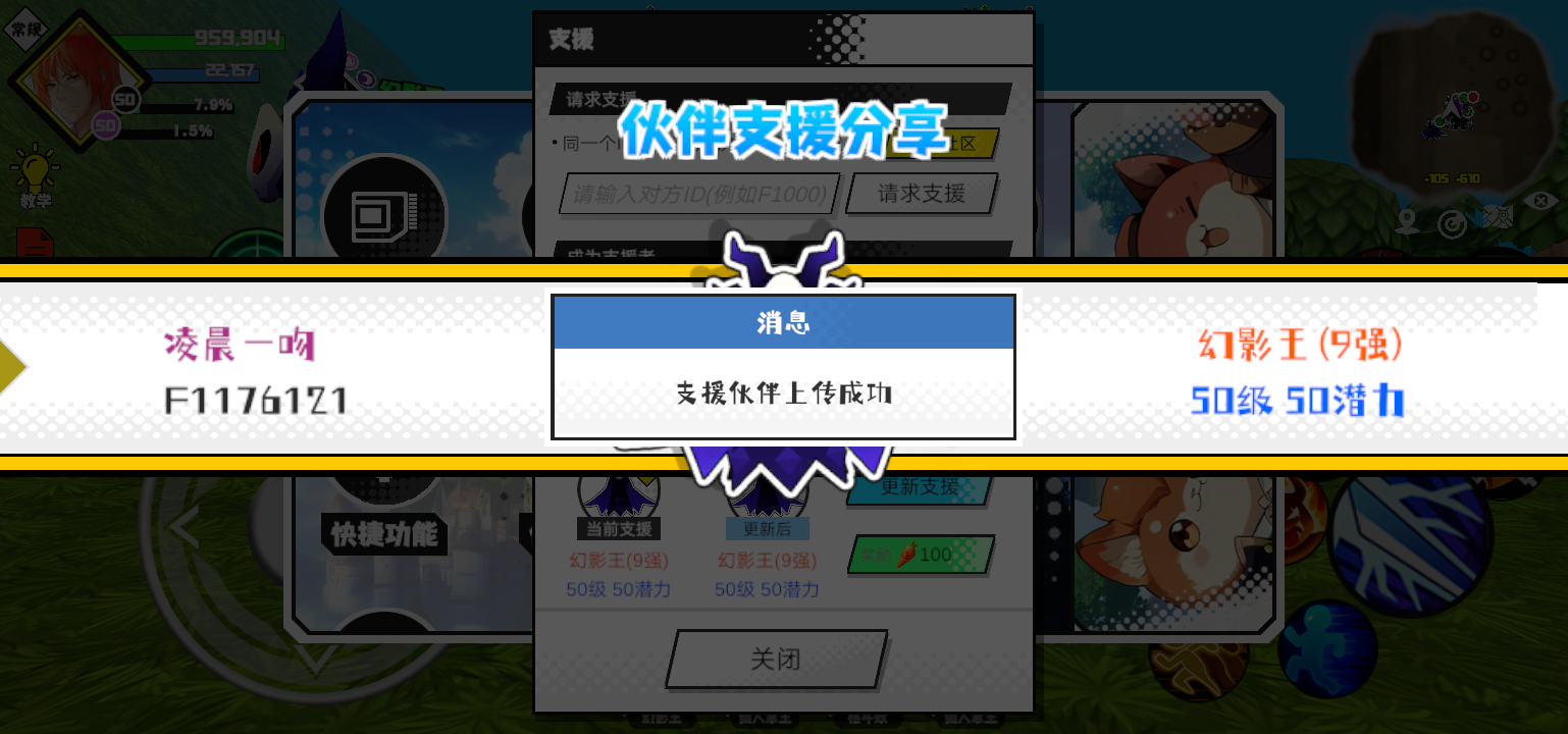 支援者:胡辣汤(F1231228)如果遇到困难,可以召唤我的宠物帮忙,召唤方法是进入地图后点击左下角的手机功能>支援>输入【F1231228】>就可以召唤我的宠物!我的宠物是蛋壳王(9强)50级 50潜力技能1:魔源技能2:黑魔破技能3:黑魔破技能4:黑魔破智慧配点:245初阶职业:鬼咒进阶职业:海神#超数据世界