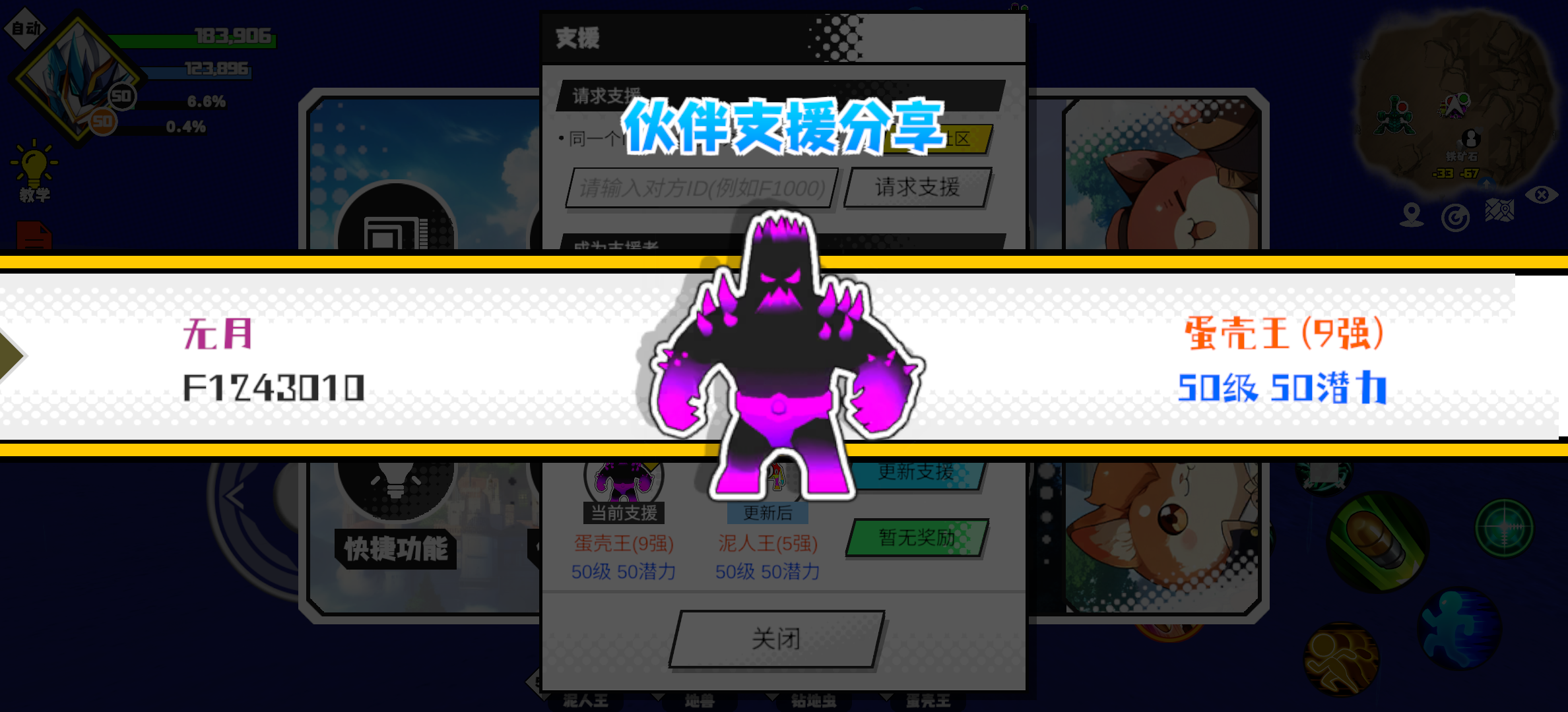 支援者:无月(F1243010)如果遇到困难,可以召唤我的宠物帮忙,召唤方法是进入地图后点击左下角的手机功能>支援>输入【F1243010】>就可以召唤我的宠物!我的宠物是蛋壳王(9强)50级 50潜力技能1:黑魔破技能2:黑魔破技能3:黑魔破技能4:黑魔破智慧配点:245初阶职业:鬼咒进阶职业:海神#超数据世界
