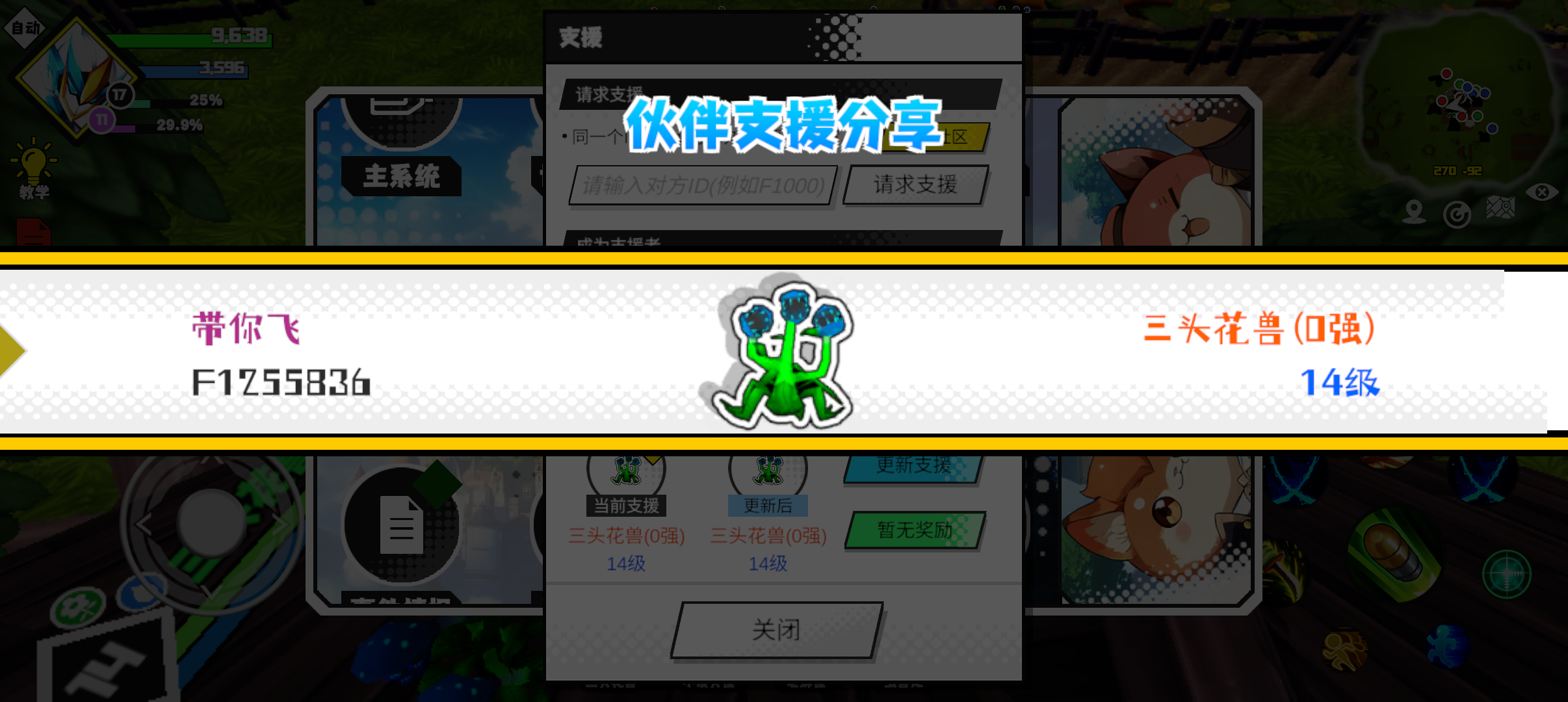 支援者:带你飞(F1255836)如果遇到困难,可以召唤我的宠物帮忙,召唤方法是进入地图后点击左下角的手机功能>支援>输入【F1255836】>就可以召唤我的宠物!我的宠物是三头花兽(0强)14级技能1:群体嘲讽技能2:群体嘲讽技能3:小恢复术技能4:耐力体质配点:100初阶职业:守卫进阶职业:无#超数据世界