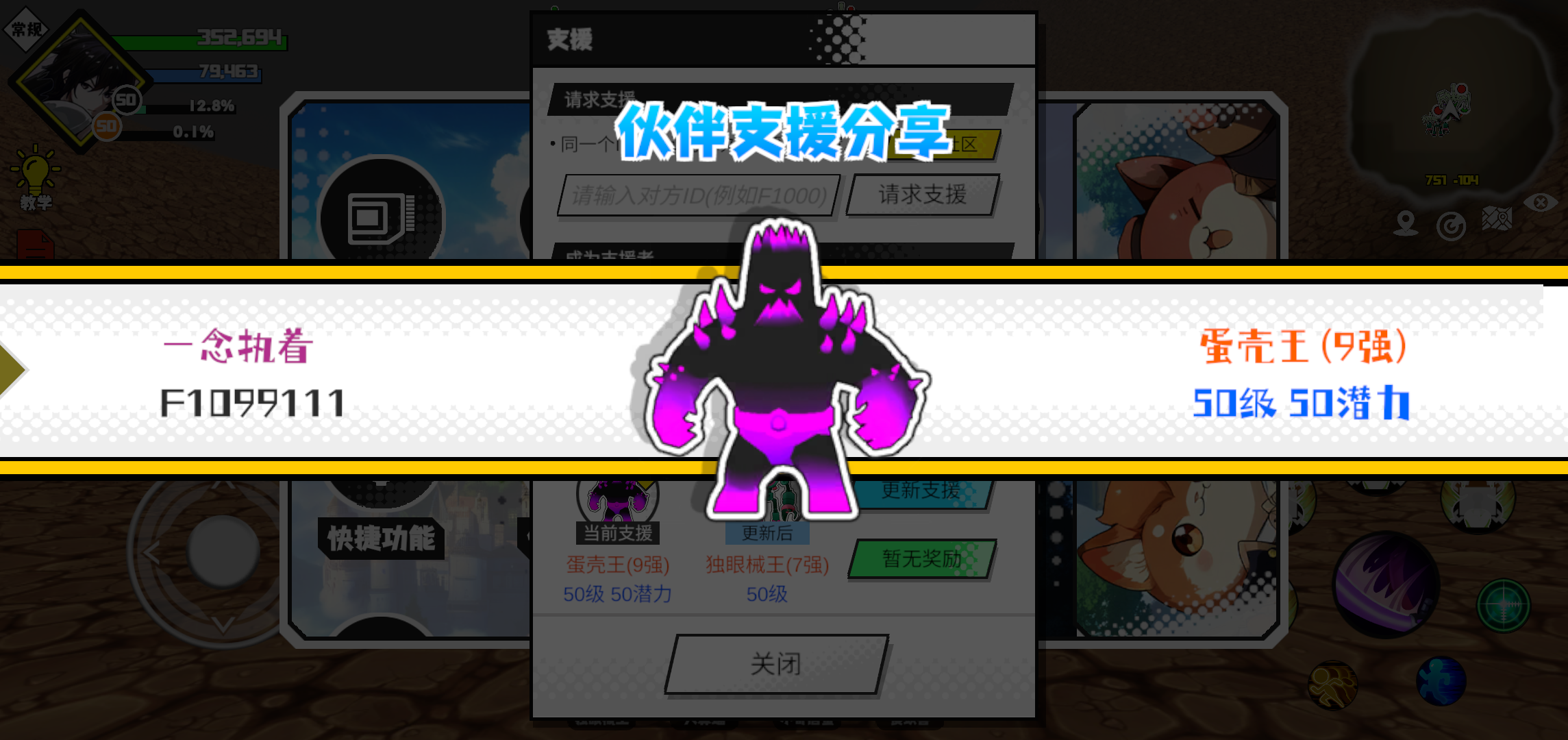 支援者:一念执着(F1099111)如果遇到困难,可以召唤我的宠物帮忙,召唤方法是进入地图后点击左下角的手机功能>支援>输入【F1099111】>就可以召唤我的宠物!我的宠物是蛋壳王(9强)50级 50潜力技能1:黑魔破技能2:黑魔破技能3:黑魔破技能4:黑魔破智慧配点:245初阶职业:鬼咒进阶职业:海神#超数据世界