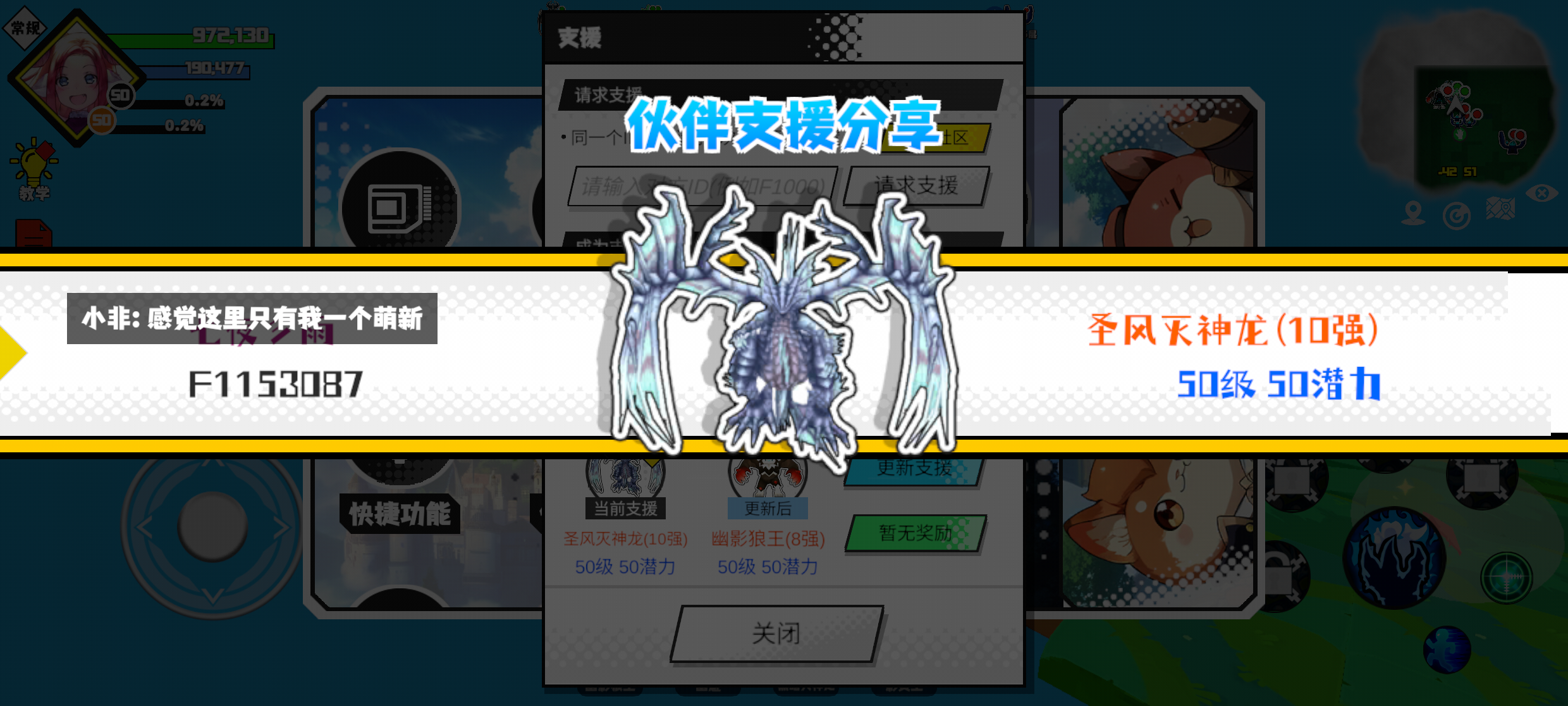 #超数据世界 支援者:七夜彡雨(F1153087)如果遇到困难,可以召唤我的宠物帮忙,召唤方法是进入地图后点击左下角的手机功能>支援>输入【F1153087】>就可以召唤我的宠物!我的宠物是圣风灭神龙(10强)50级 50潜力技能1:鹰眼技能2:风之意技能3:普攻增幅技能4:魔源力量配点:145敏捷配点:100初阶职业:剑侠进阶职业:盾卫