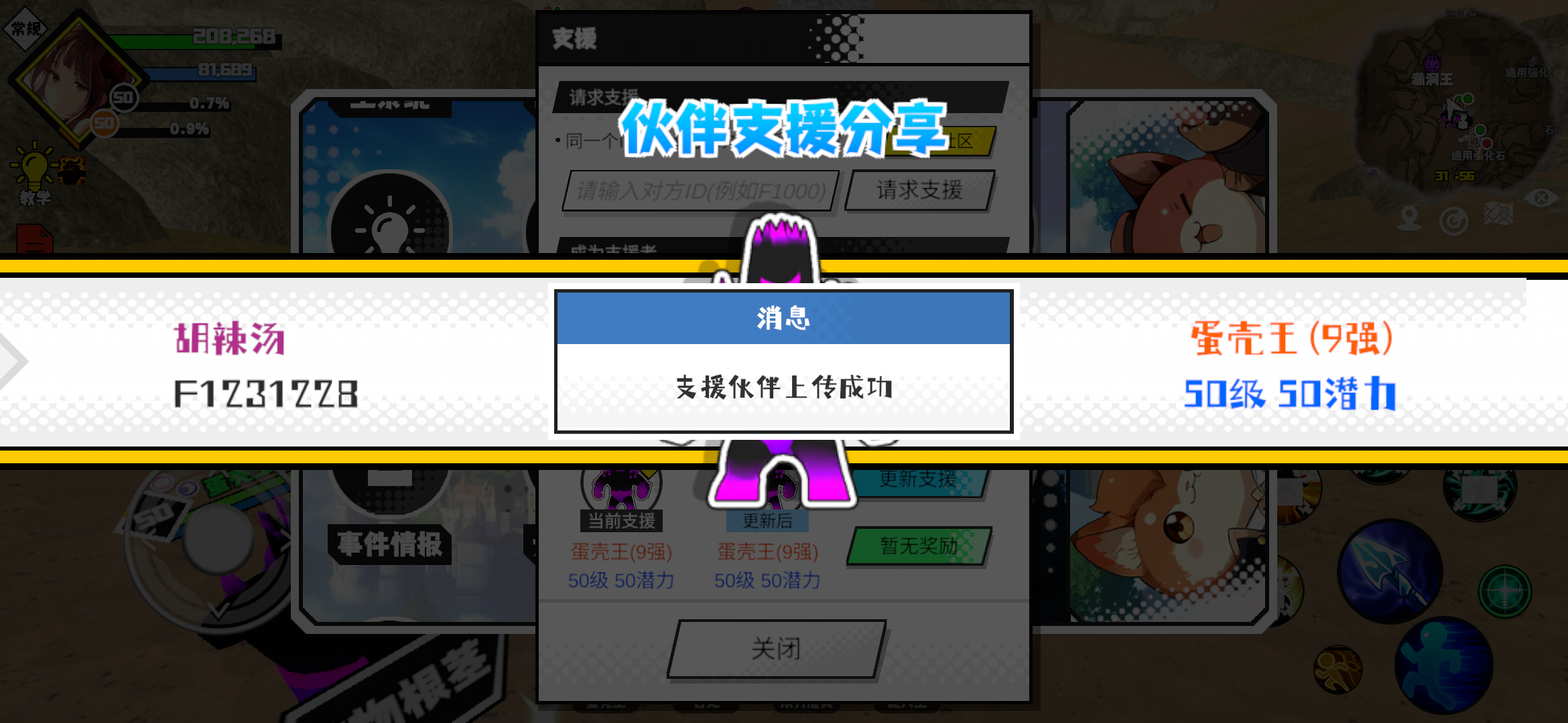支援者:胡辣汤(F1231228)如果遇到困难,可以召唤我的宠物帮忙,召唤方法是进入地图后点击左下角的手机功能>支援>输入【F1231228】>就可以召唤我的宠物!我的宠物是蛋壳王(9强)50级 50潜力技能1:魔源技能2:黑魔破技能3:黑魔破技能4:黑魔破智慧配点:245初阶职业:鬼咒进阶职业:海神#超数据世界