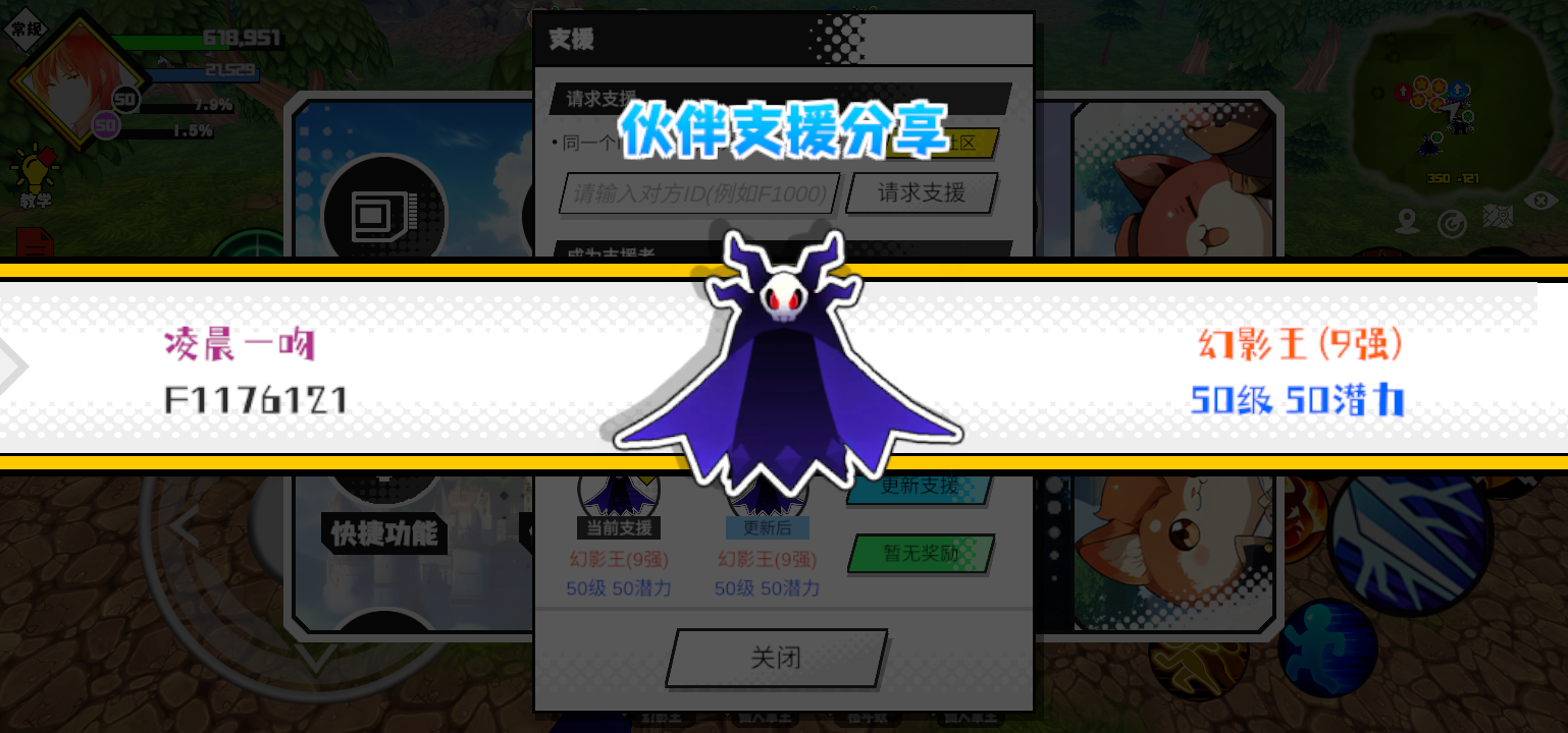 支援者:凌晨一吻(F1176121)如果遇到困难,可以召唤我的宠物帮忙,召唤方法是进入地图后点击左下角的手机功能>支援>输入【F1176121】>就可以召唤我的宠物!我的宠物是幻影王(9强)50级 50潜力技能1:黑魔破技能2:黑魔破技能3:黑魔破技能4:黑魔破智慧配点:245初阶职业:鬼咒进阶职业:海神#超数据世界