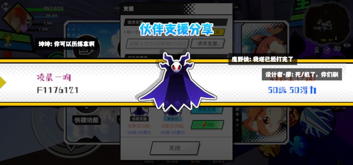 支援者:一念执着(F1099111)如果遇到困难,可以召唤我的宠物帮忙,召唤方法是进入地图后点击左下角的手机功能>支援>输入【F1099111】>就可以召唤我的宠物!我的宠物是蛋壳王(9强)50级 50潜力技能1:黑魔破技能2:黑魔破技能3:黑魔破技能4:黑魔破智慧配点:245初阶职业:鬼咒进阶职业:海神#超数据世界