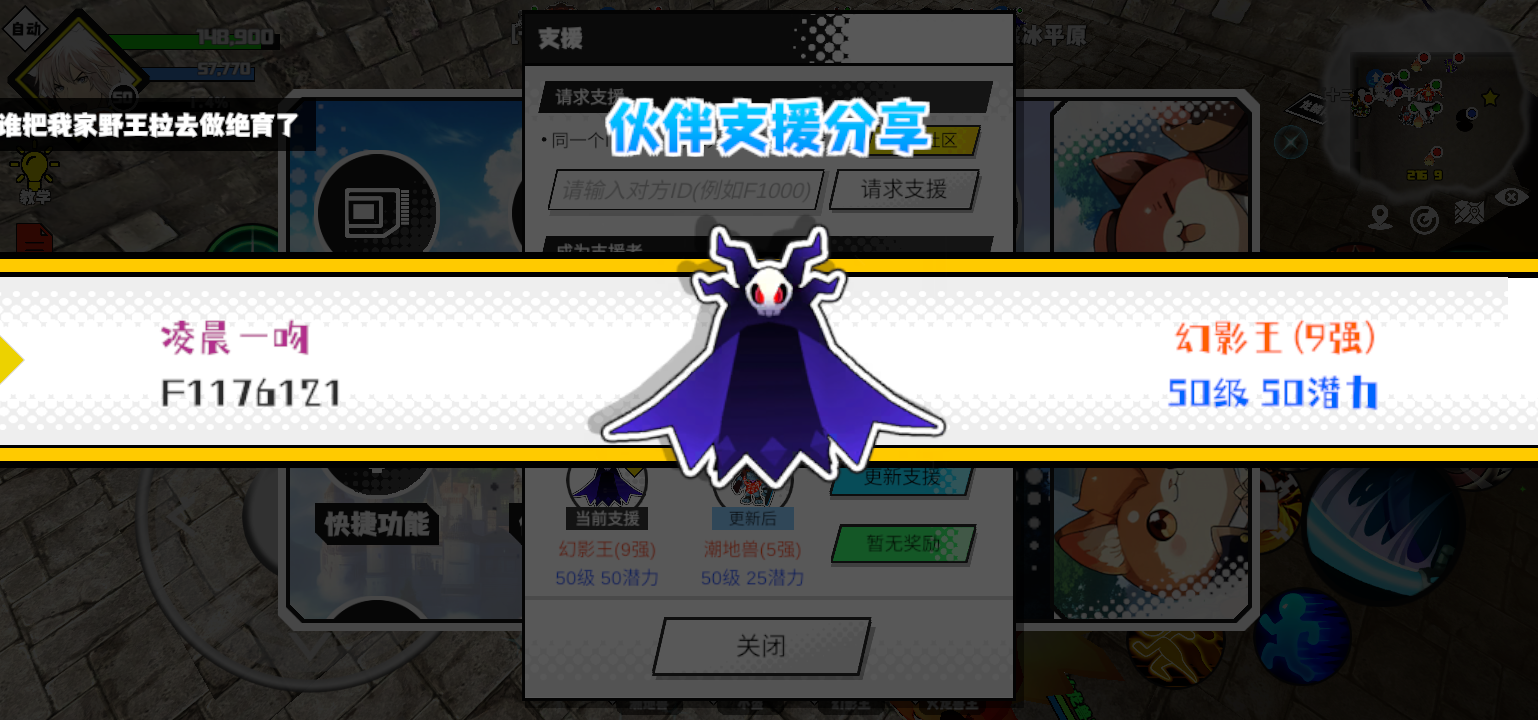 支援者:虚无独眼蝠(F1196044)如果遇到困难,可以召唤我的宠物帮忙,召唤方法是进入地图后点击左下角的手机功能>支援>输入【F1196044】>就可以召唤我的宠物!我的宠物是幻影王(9强)50级 50潜力技能1:黑之破坏技能2:黑之破坏技能3:黑魔破技能4:黑魔弹智慧配点:245初阶职业:鬼咒进阶职业:海神#超数据世界