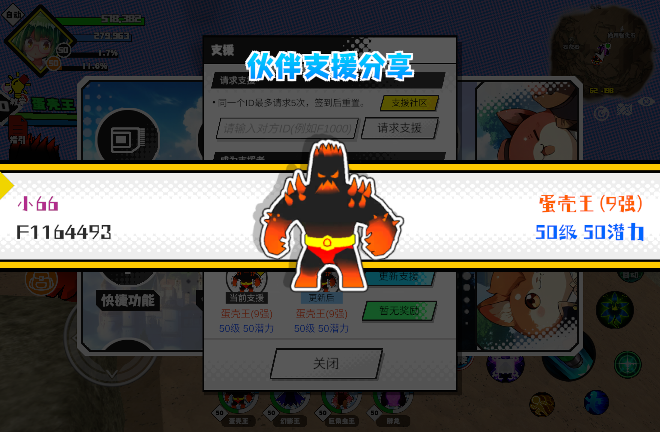 支援者:小66(F1164493)如果遇到困难,可以召唤我的宠物帮忙,召唤方法是进入地图后点击左下角的手机功能>支援>输入【F1164493】>就可以召唤我的宠物!我的宠物是蛋壳王(9强)50级 50潜力技能1:燃热之地技能2:火焰破技能3:火焰破技能4:燃热之地智慧配点:245初阶职业:鬼咒进阶职业:海神#超数据世界