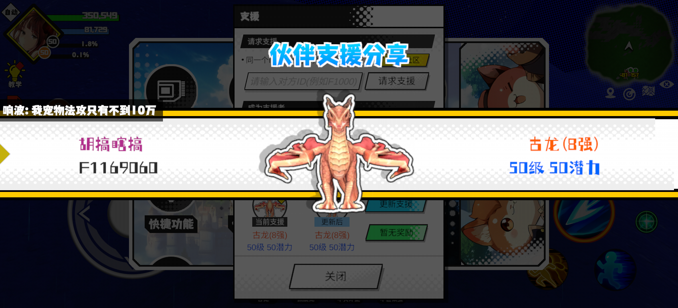 支援者:妇硬杯的狗(F1012531)如果遇到困难,可以召唤我的宠物帮忙,召唤方法是进入地图后点击左下角的手机功能>支援>输入【F1012531】>就可以召唤我的宠物!我的宠物是火龙兽王(9强)50级 50潜力技能1:异空术技能2:异空术技能3:异空术技能4:魔导之力敏捷配点:45智慧配点:200初阶职业:鬼咒进阶职业:魔灭#超数据世界