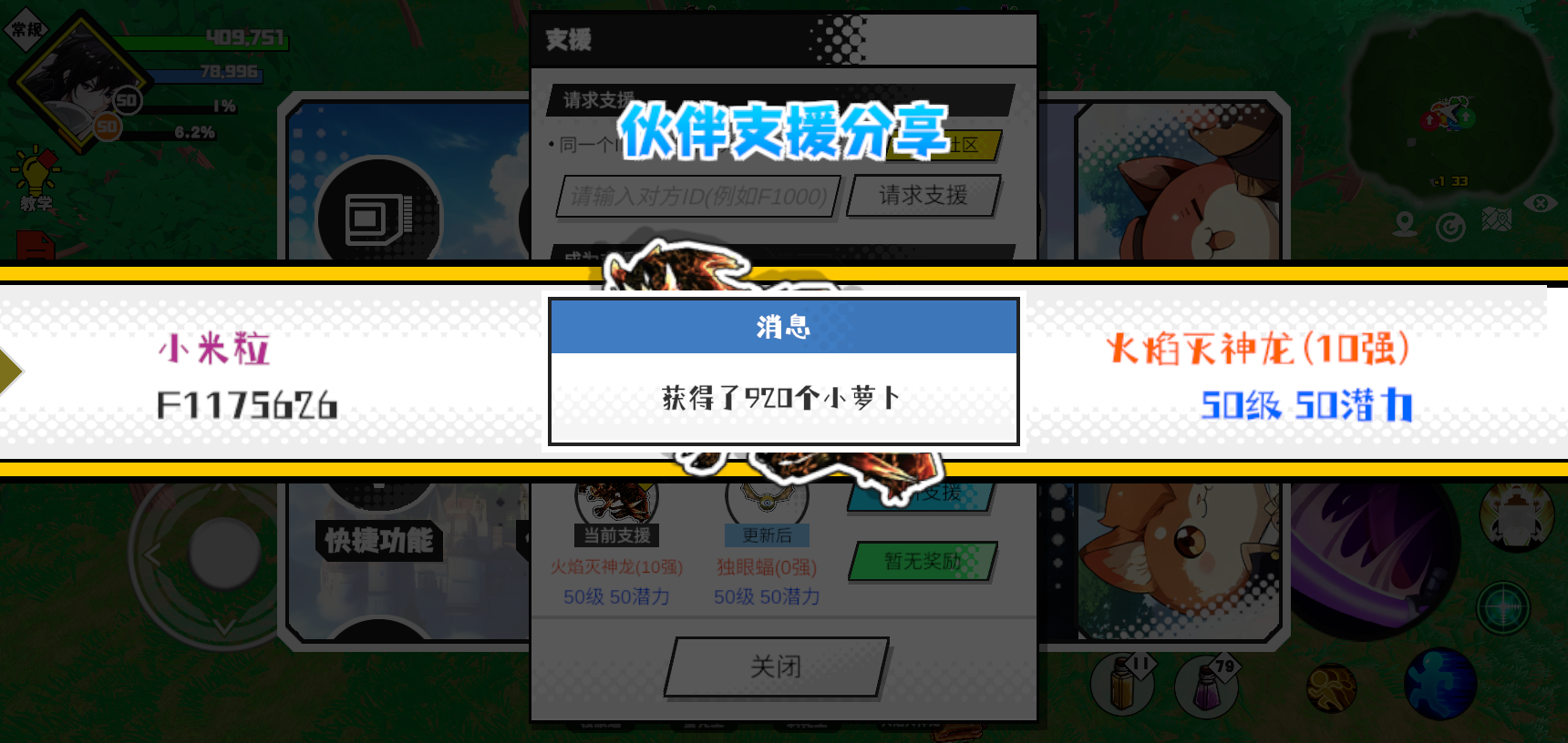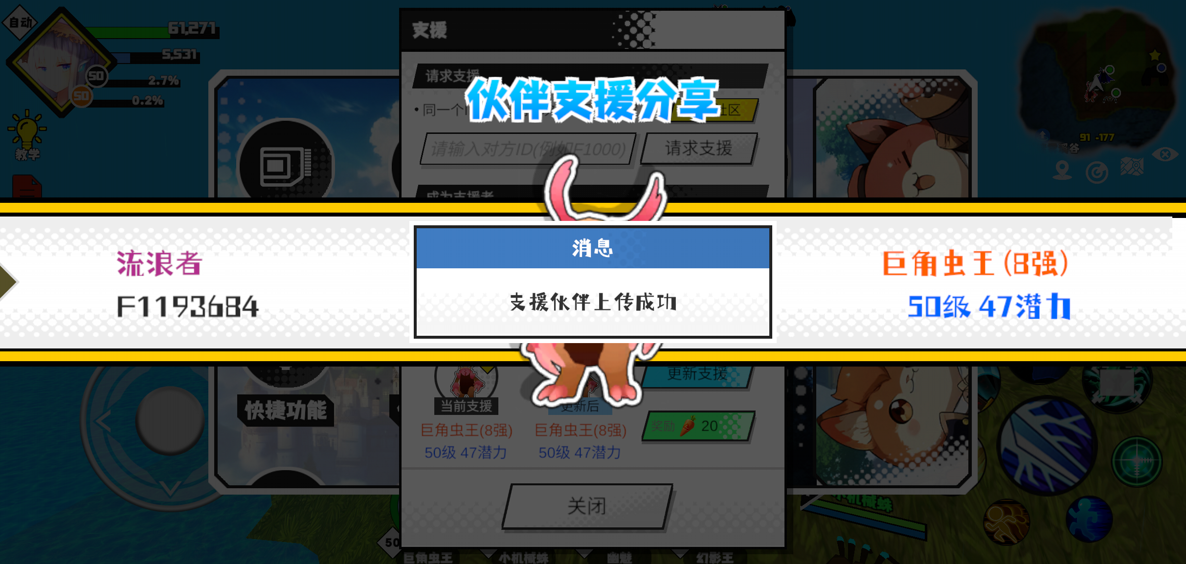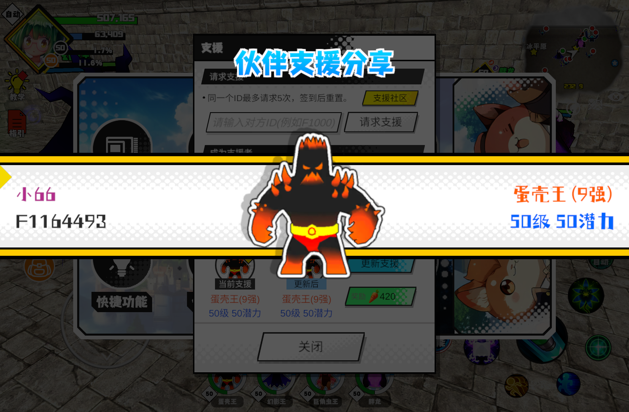 支援者:小66(F1164493)如果遇到困难,可以召唤我的宠物帮忙,召唤方法是进入地图后点击左下角的手机功能>支援>输入【F1164493】>就可以召唤我的宠物!我的宠物是蛋壳王(9强)50级 50潜力技能1:燃热之地技能2:火焰破技能3:火焰破技能4:燃热之地智慧配点:245初阶职业:鬼咒进阶职业:海神#超数据世界