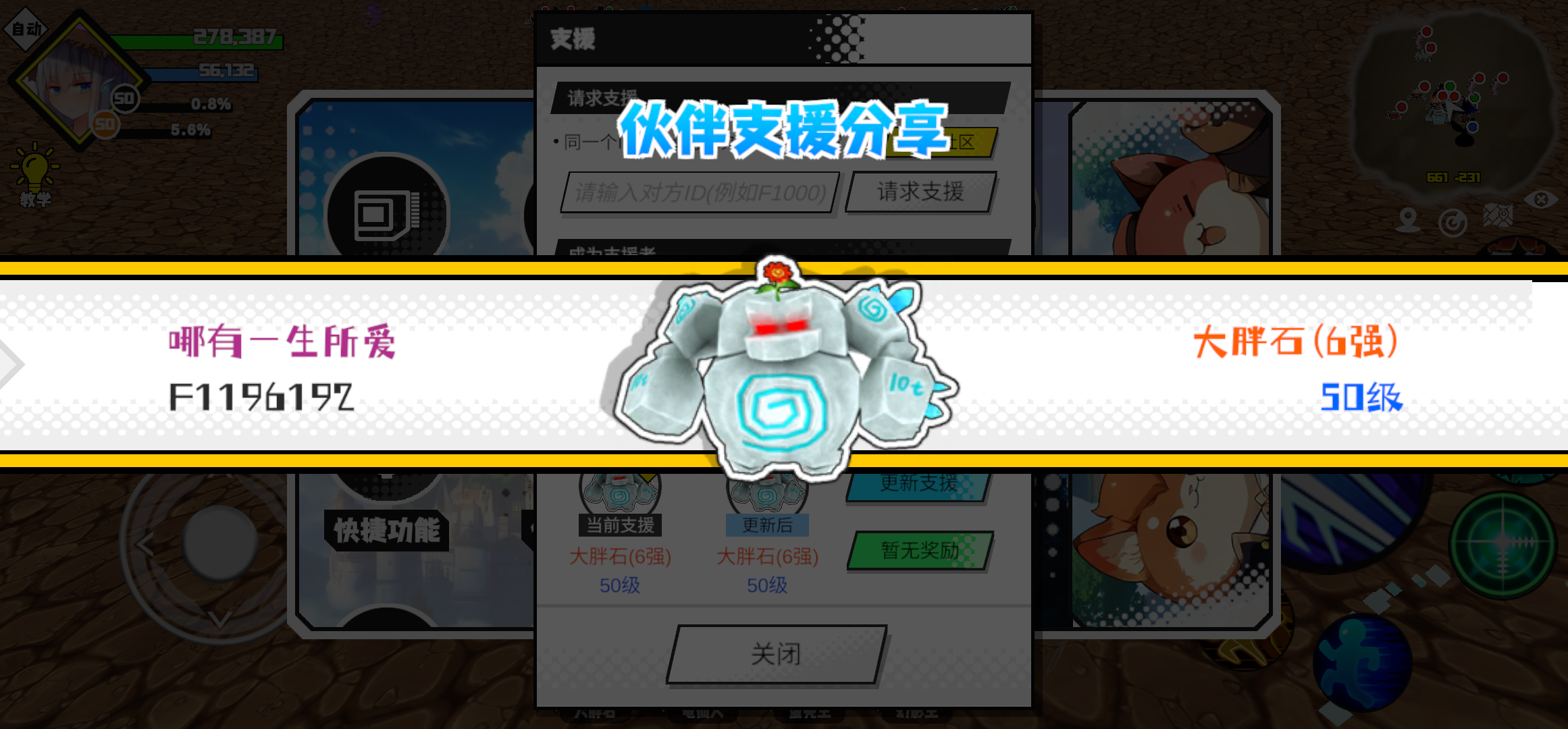 支援者:哪有一生所爱(F1196192)如果遇到困难,可以召唤我的宠物帮忙,召唤方法是进入地图后点击左下角的手机功能>支援>输入【F1196192】>就可以召唤我的宠物!我的宠物是大胖石(6强)50级技能1:群体吸引技能2:水灵技能3:水灵技能4:群体吸引体质配点:245初阶职业:守卫进阶职业:盾卫#超数据世界