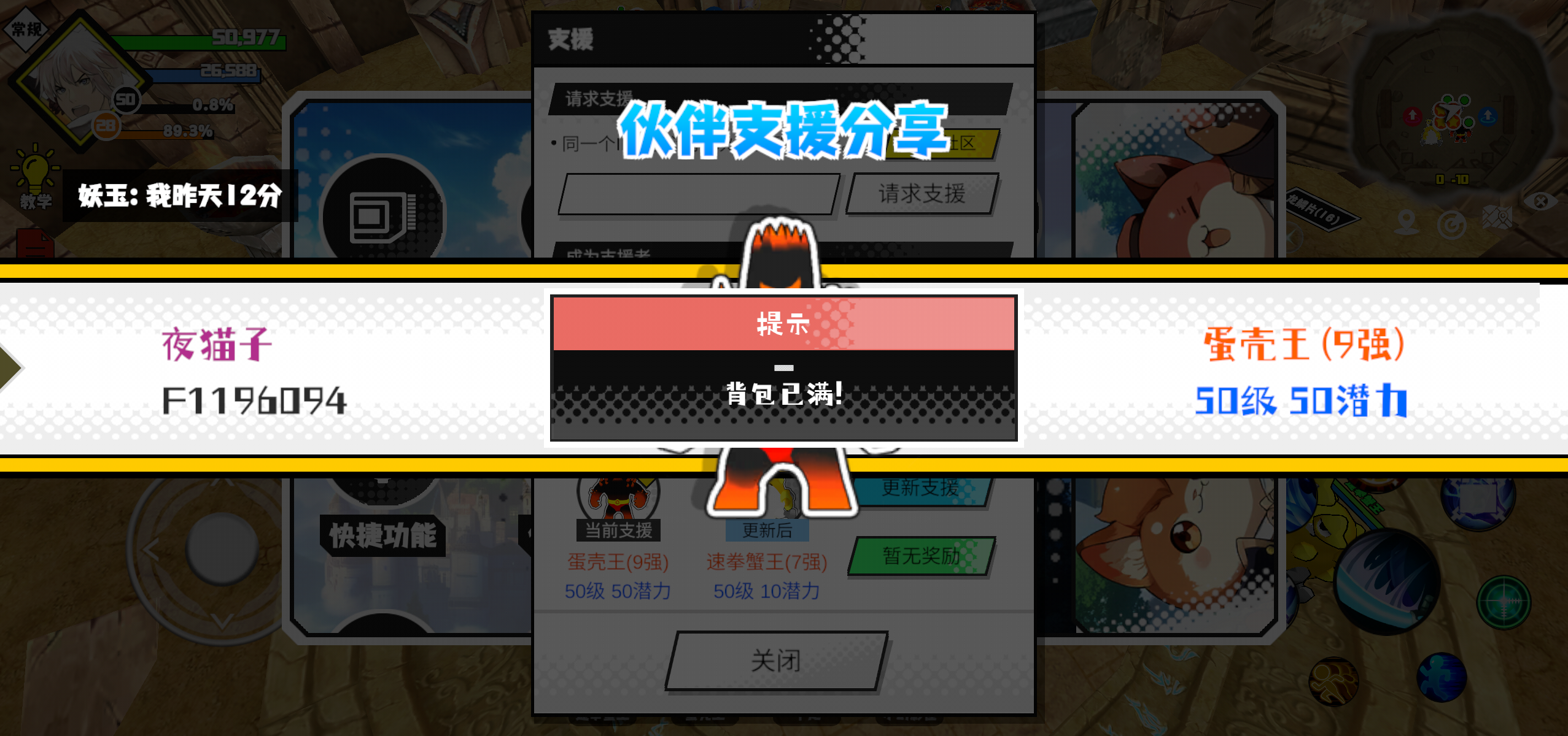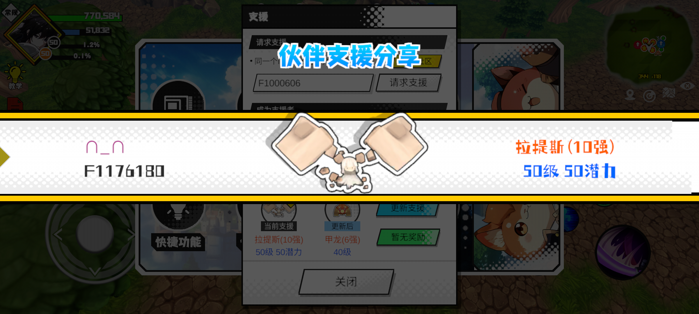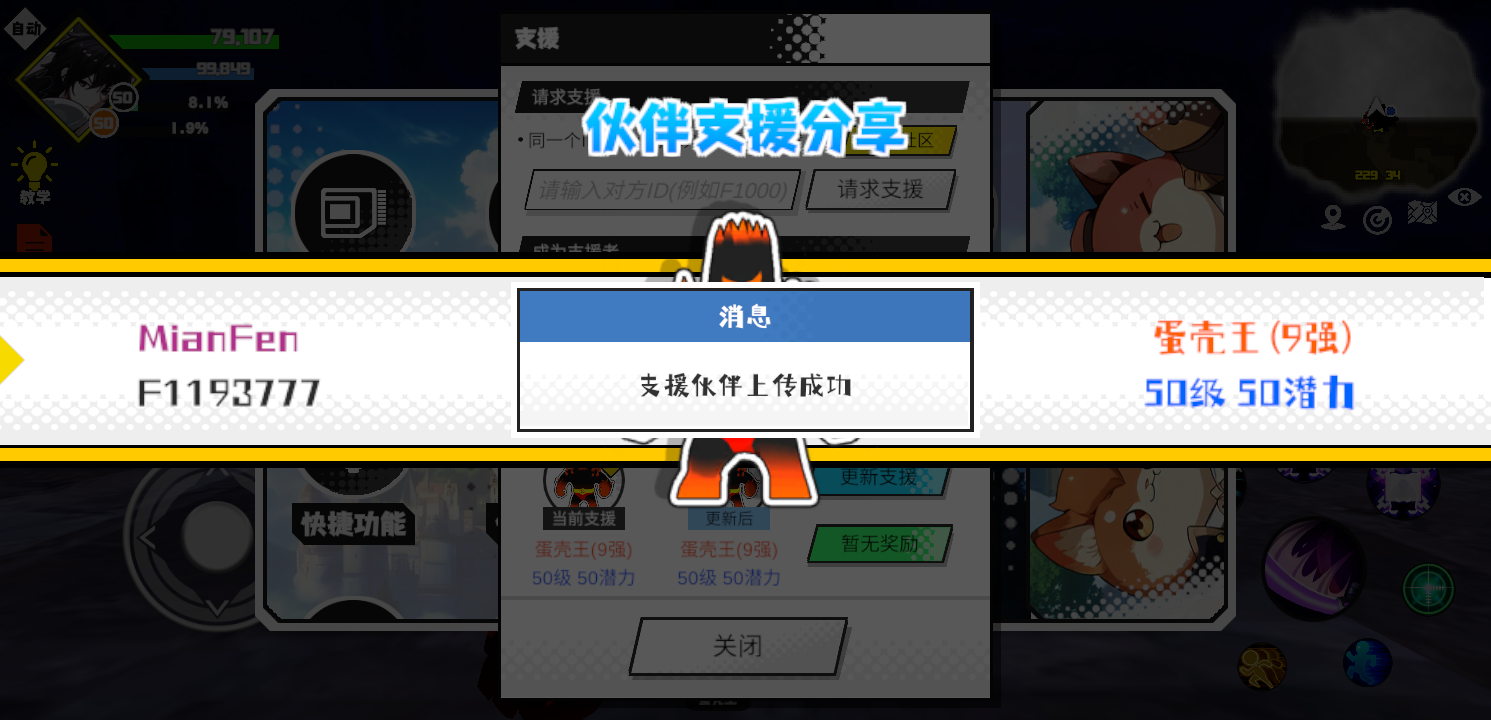 支援者:夜猫子(F1196094)如果遇到困难,可以召唤我的宠物帮忙,召唤方法是进入地图后点击左下角的手机功能>支援>输入【F1196094】>就可以召唤我的宠物!我的宠物是蛋壳王(9强)50级 50潜力技能1:星火之泪技能2:物理保护1技能3:炎之呼吸技能4:钢火术智慧配点:245初阶职业:鬼咒进阶职业:魔灭#超数据世界