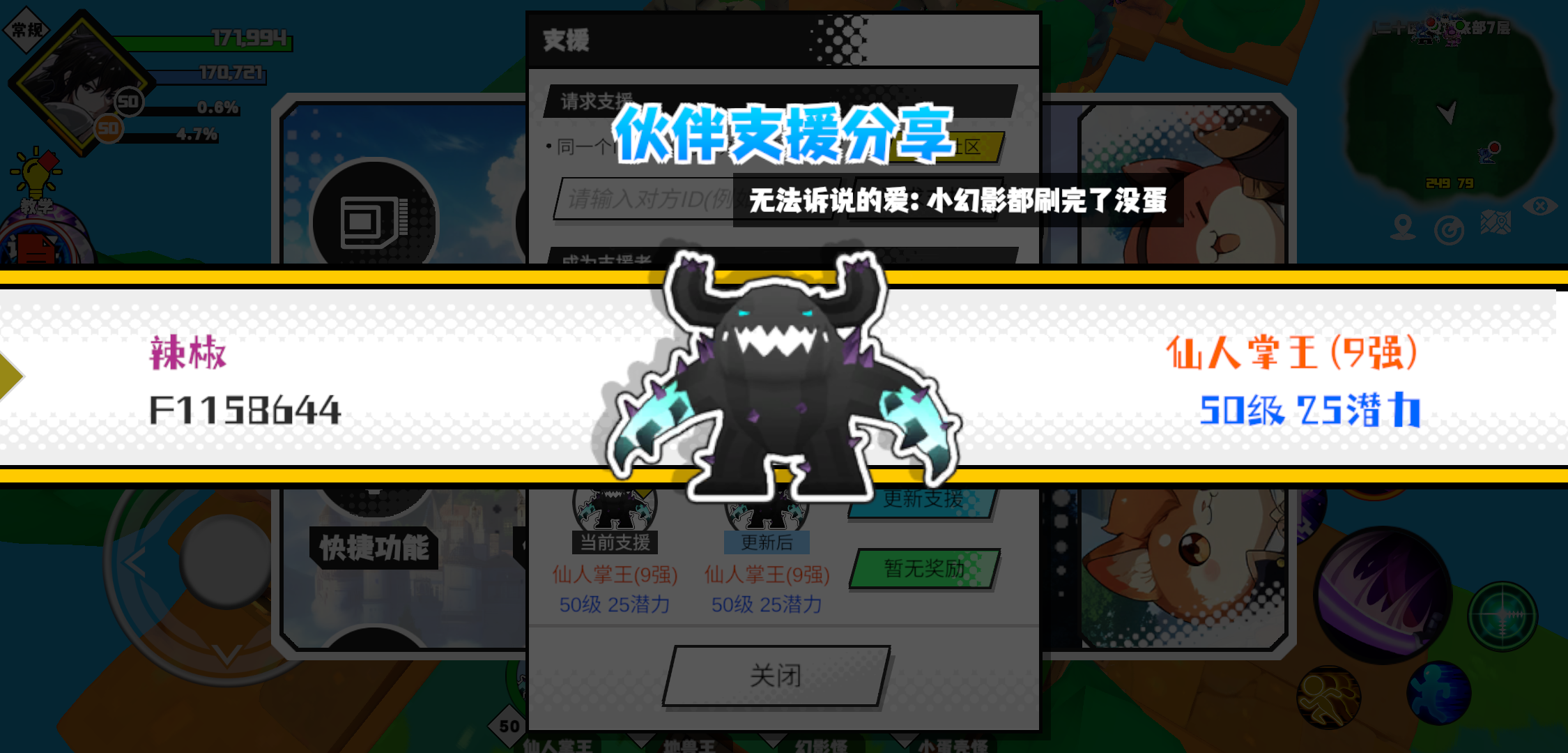 支援者:祀祀小天使(F1058829)如果遇到困难,可以召唤我的宠物帮忙,召唤方法是进入地图后点击左下角的手机功能>支援>输入【F1058829】>就可以召唤我的宠物!我的宠物是蛋壳王(9强)50级 50潜力技能1:黑魔破技能2:黑魔破技能3:黑魔破技能4:黑魔破智慧配点:245初阶职业:鬼咒进阶职业:气宗#超数据世界