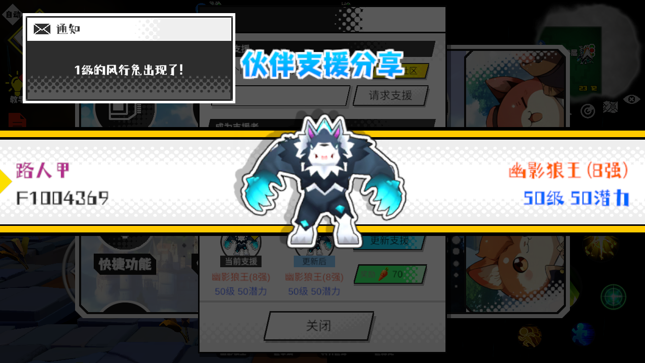 支援者:路人甲(F1004369)如果遇到困难,可以召唤我的宠物帮忙,召唤方法是进入地图后点击左下角的手机功能>支援>输入【F1004369】>就可以召唤我的宠物!我的宠物是幽影狼王(8强)50级 50潜力技能1:普攻增幅技能2:魔源技能3:神力技能4:神力力量配点:145敏捷配点:100初阶职业:守卫进阶职业:海神#超数据世界