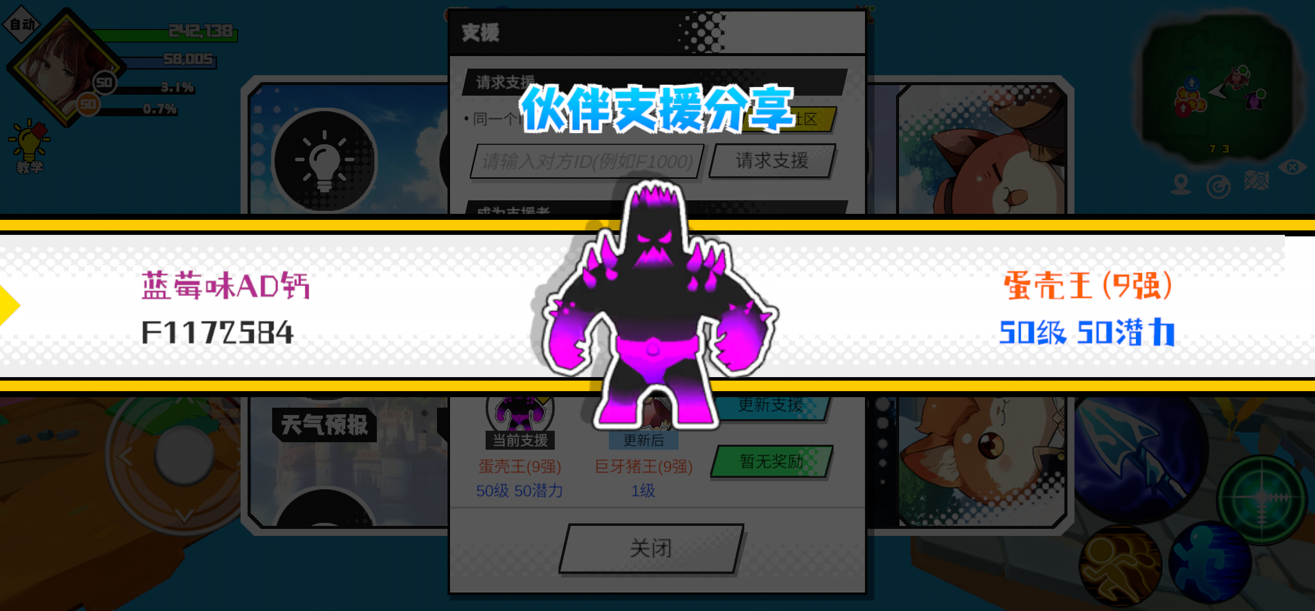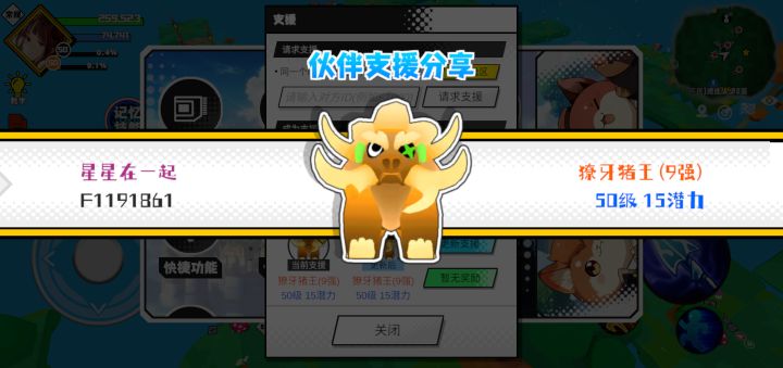 支援者:星星在一起(F1191861)如果遇到困难,可以召唤我的宠物帮忙,召唤方法是进入地图后点击左下角的手机功能>支援>输入【F1191861】>就可以召唤我的宠物!我的宠物是獠牙猪王(9强)50级 15潜力技能1:群体吸引技能2:再生技能3:群体力量强化2技能4:水灵体质配点:245初阶职业:守卫进阶职业:麟目#超数据世界