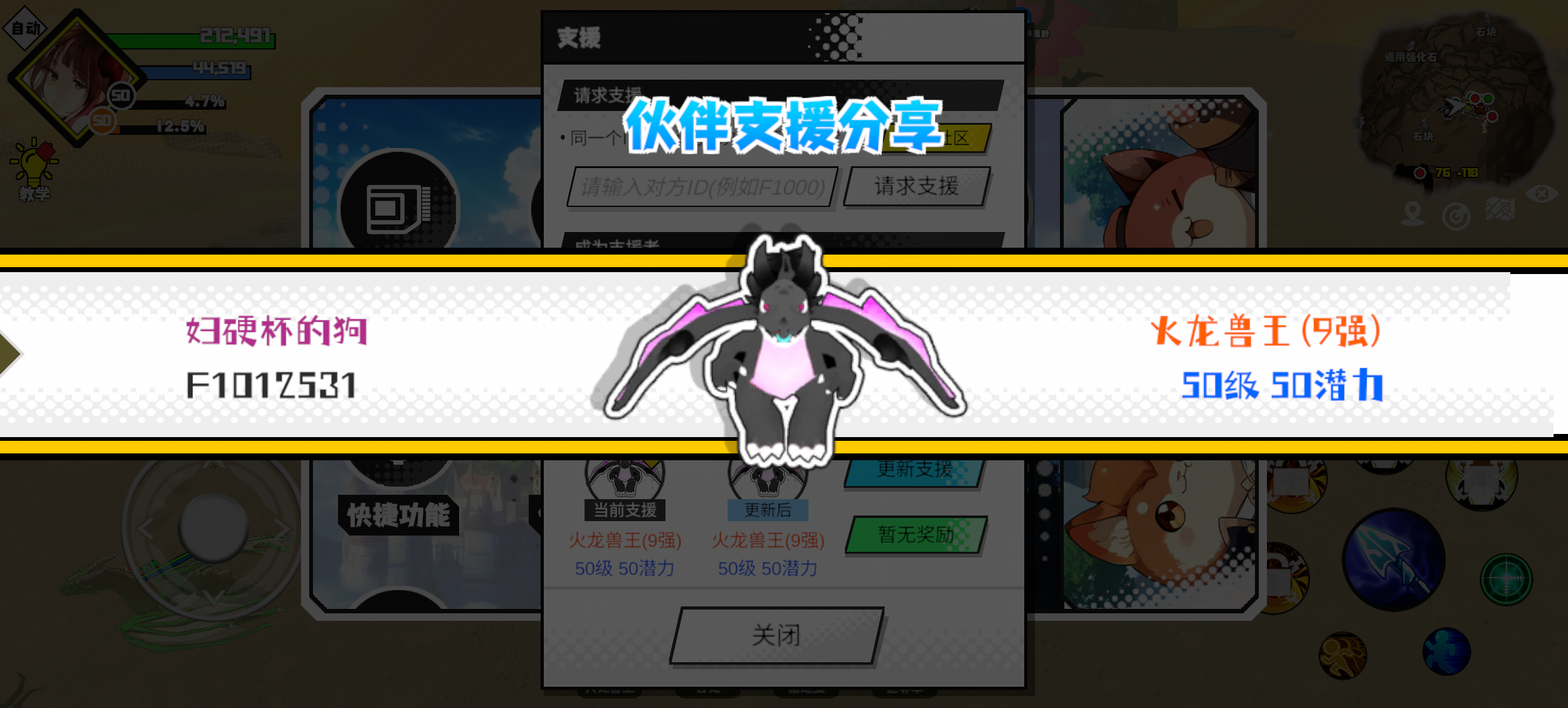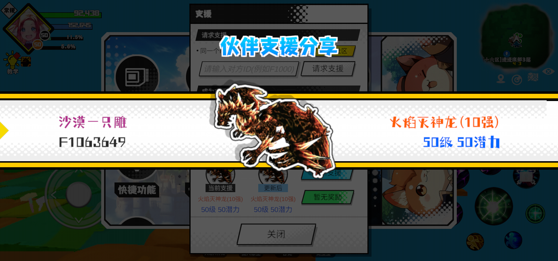 #超数据世界 支援者:沙漠一只雕(F1063649)如果遇到困难,可以召唤我的宠物帮忙,召唤方法是进入地图后点击左下角的手机功能>支援>输入【F1063649】>就可以召唤我的宠物!我的宠物是火焰灭神龙(10强)50级 50潜力技能1:火之意技能2:凤凰螺旋击技能3:凤凰螺旋击技能4:凤凰螺旋击力量配点:245初阶职业:暗猎进阶职业:无极