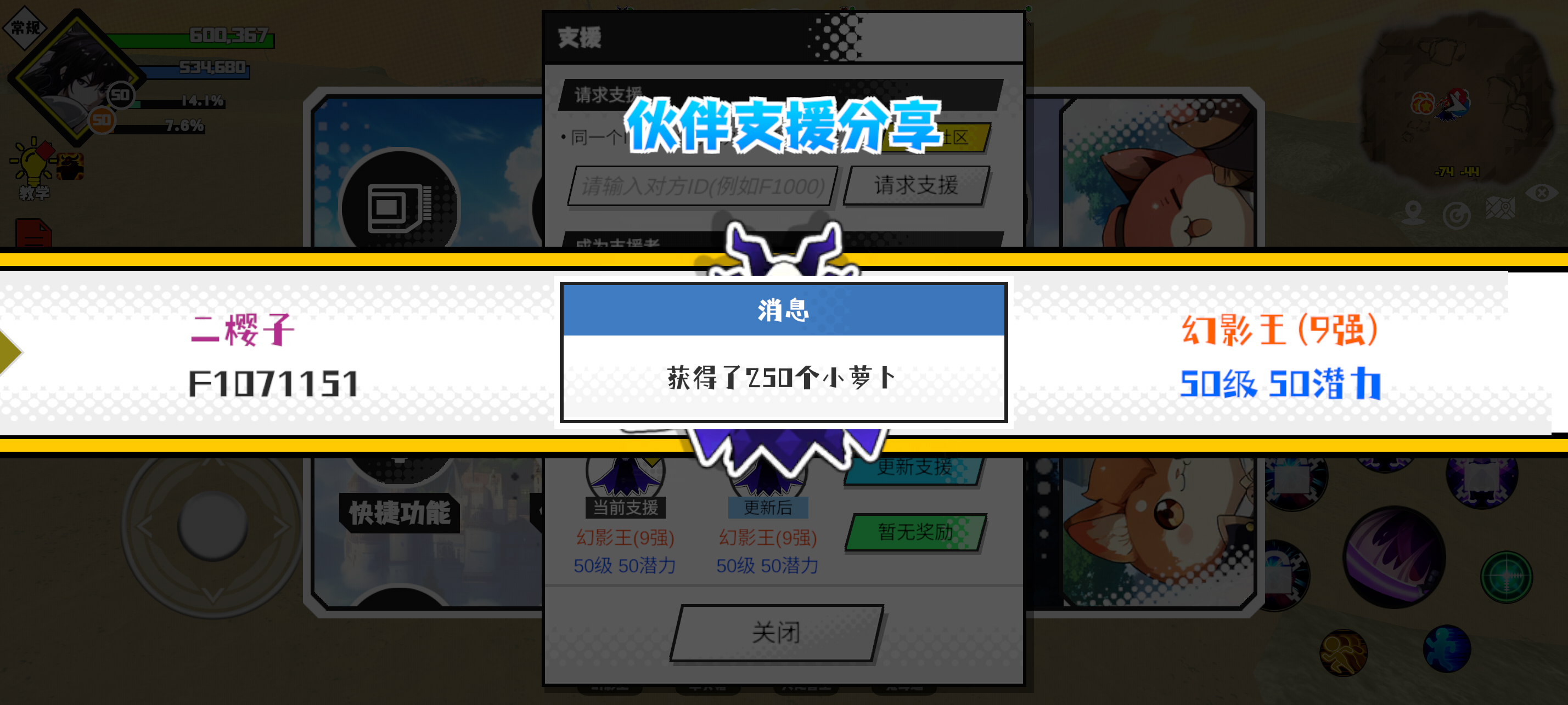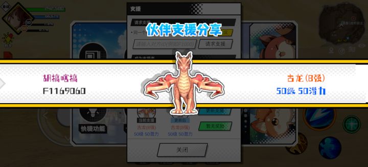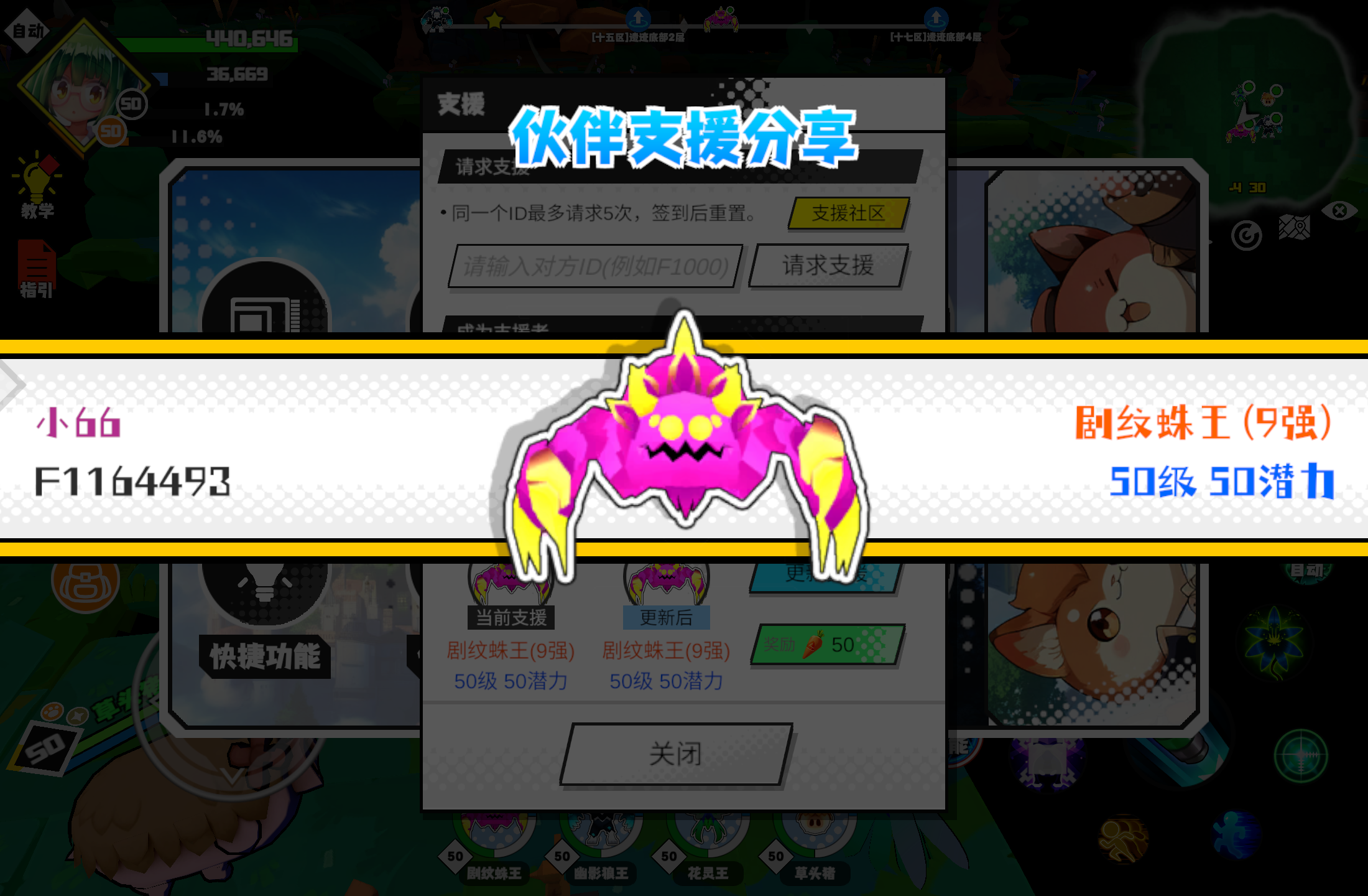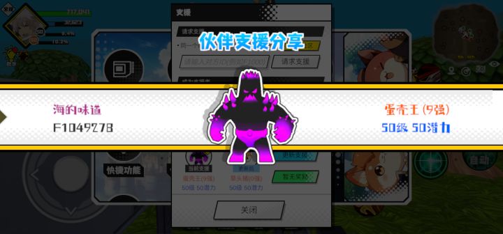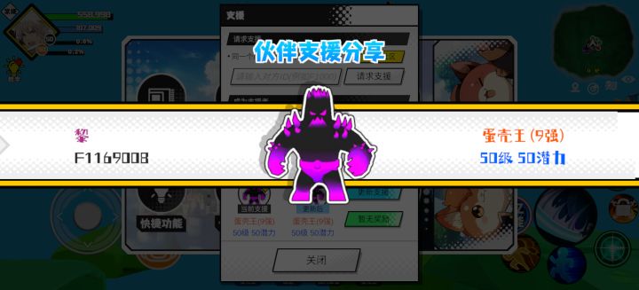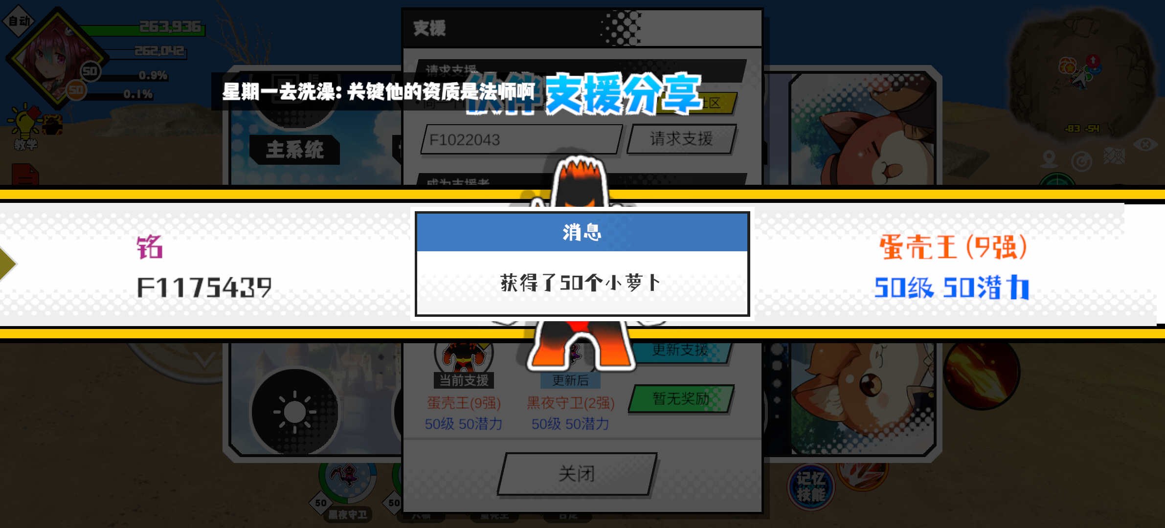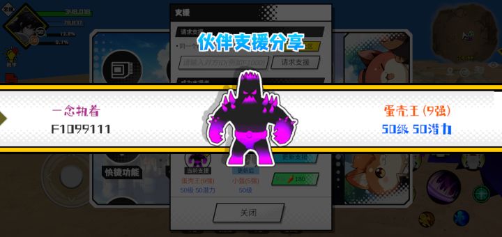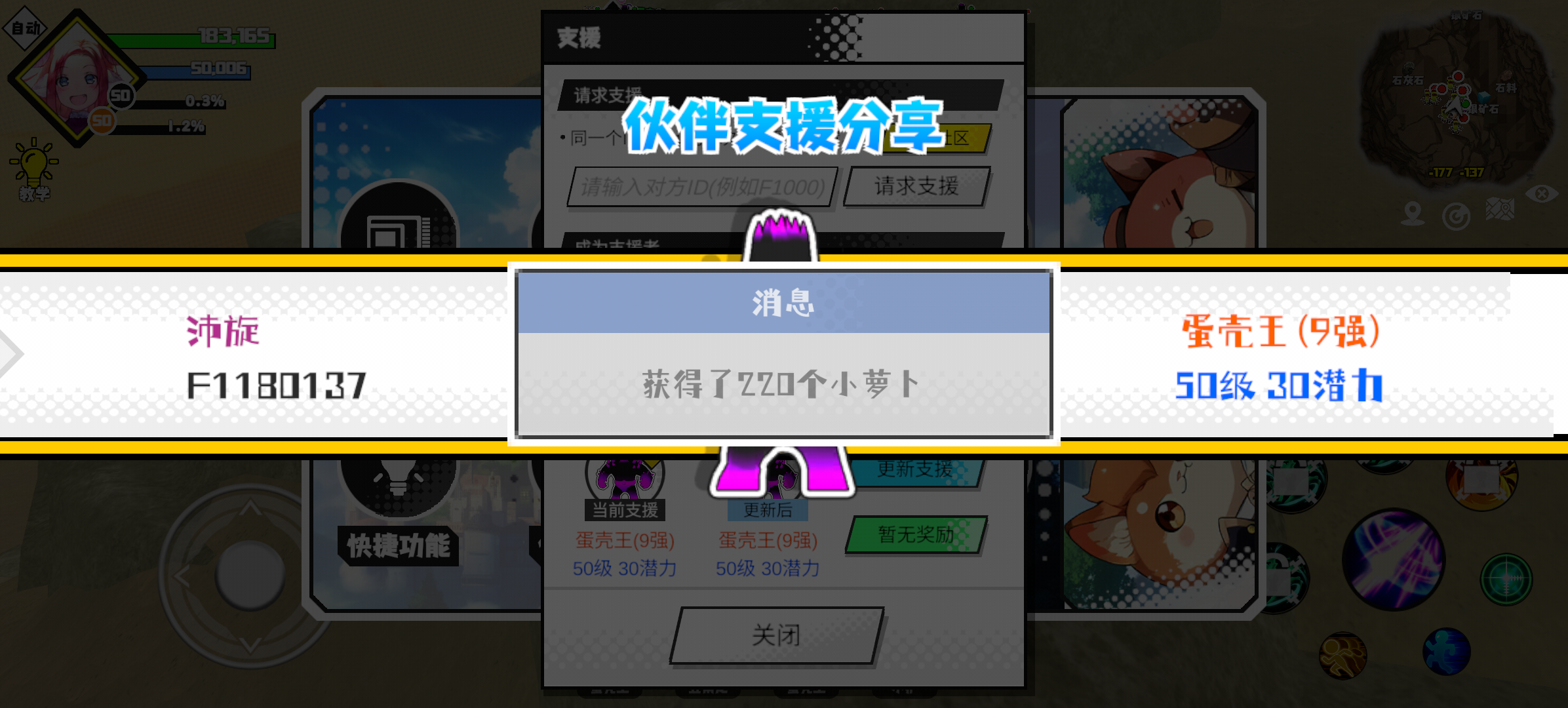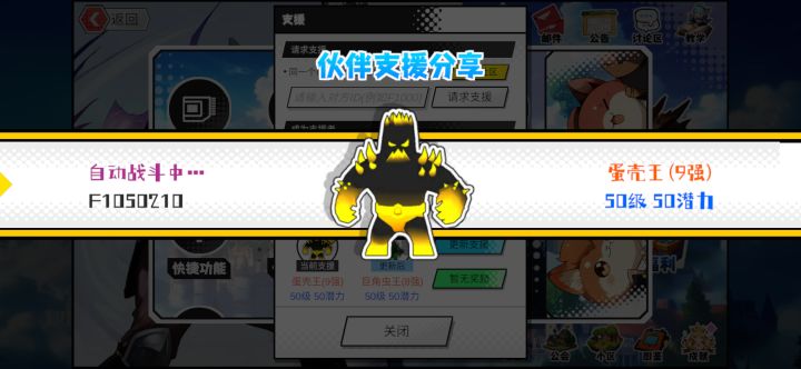 支援者:自动战斗中…(F1050210)如果遇到困难,可以召唤我的宠物帮忙,召唤方法是进入地图后点击左下角的手机功能>支援>输入【F1050210】>就可以召唤我的宠物!我的宠物是蛋壳王(9强)50级 50潜力技能1:八雷神术技能2:八雷神术技能3:冰炮十连技能4:八雷神术智慧配点:245初阶职业:时导进阶职业:海神#超数据世界