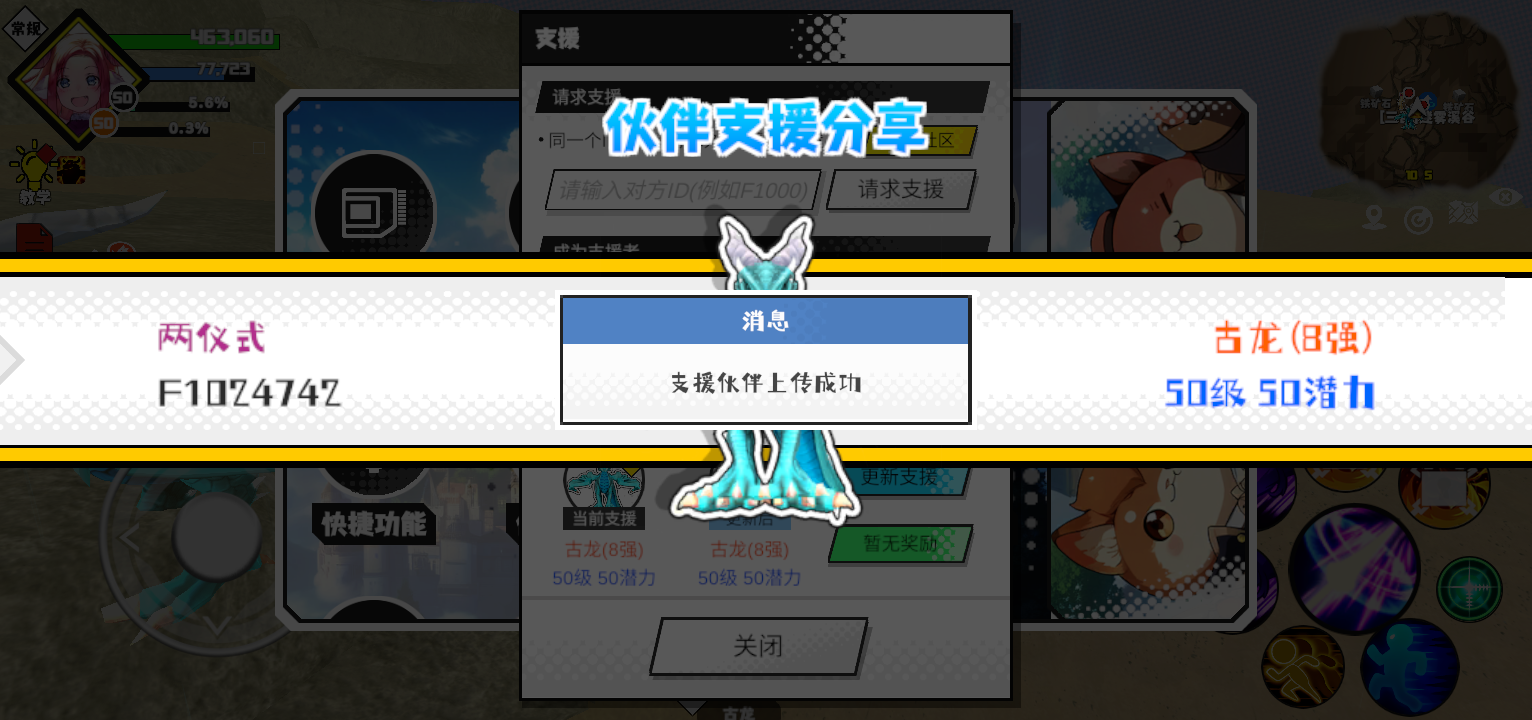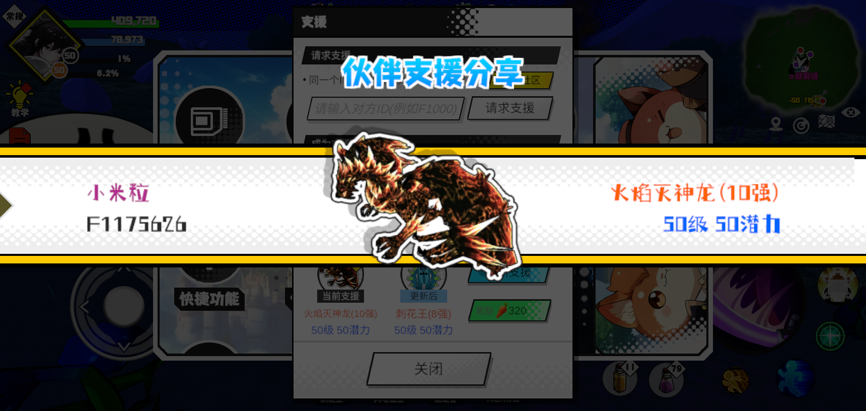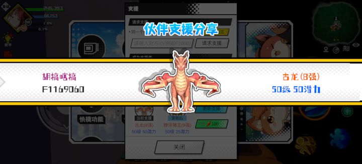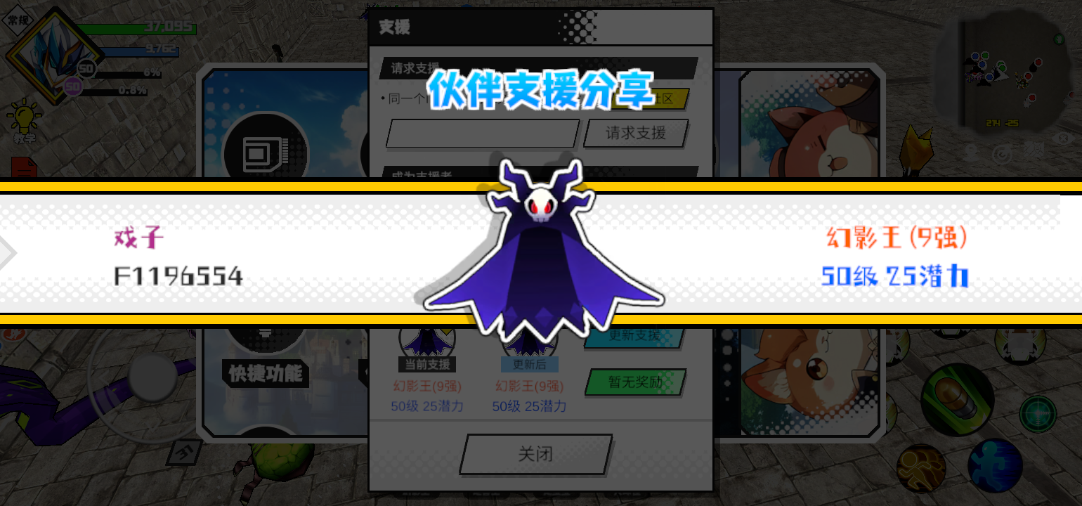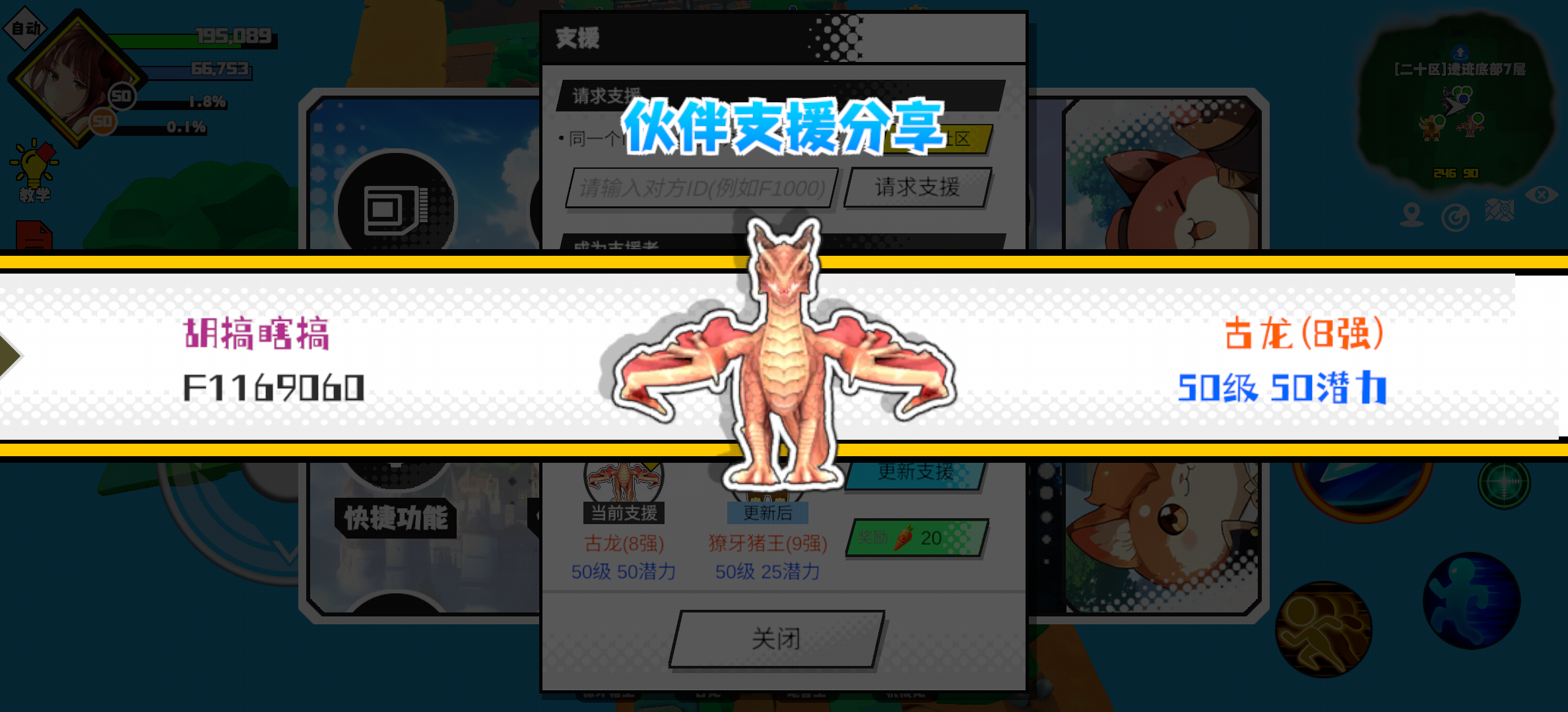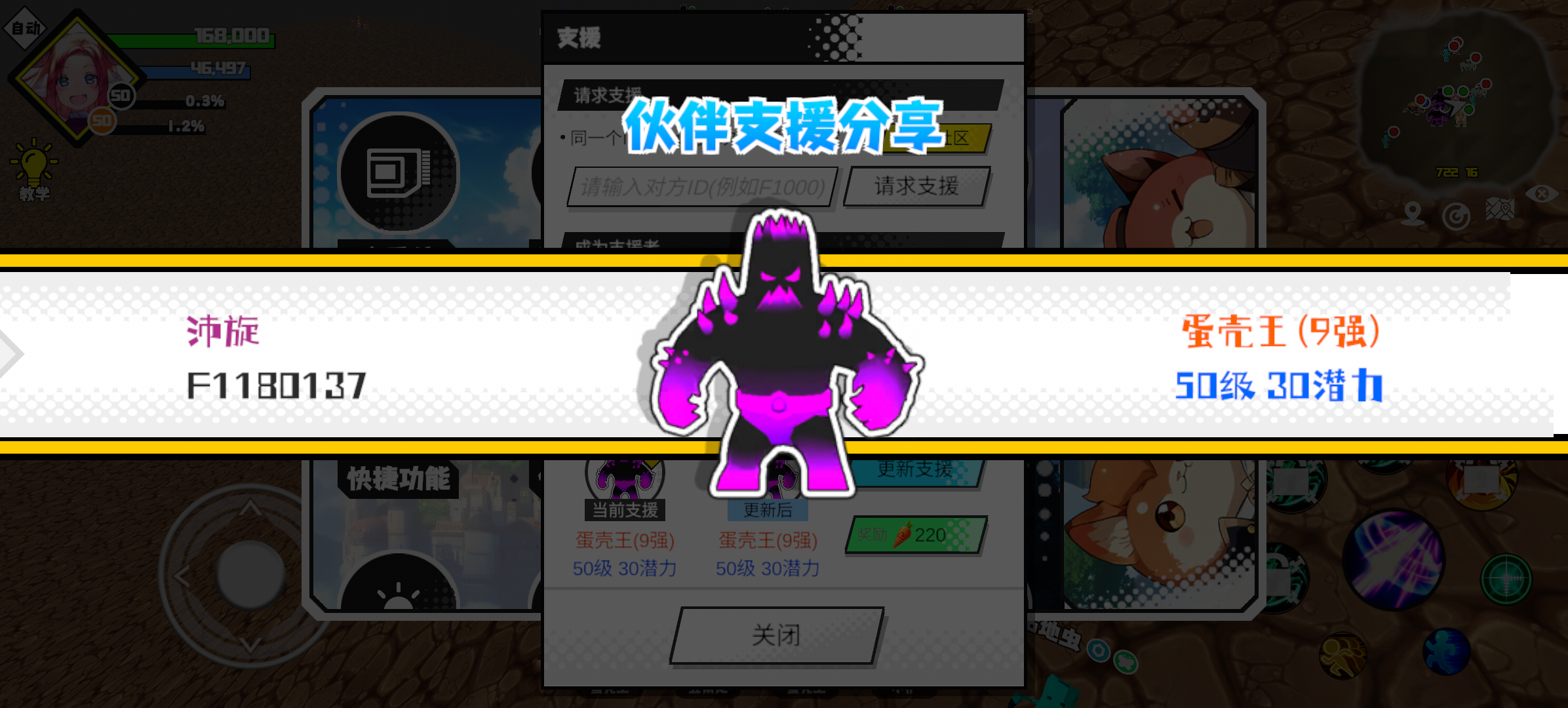 支援者:自动战斗中…(F1050210)如果遇到困难,可以召唤我的宠物帮忙,召唤方法是进入地图后点击左下角的手机功能>支援>输入【F1050210】>就可以召唤我的宠物!我的宠物是蛋壳王(9强)50级 50潜力技能1:八雷神术技能2:八雷神术技能3:冰炮十连技能4:八雷神术智慧配点:245初阶职业:时导进阶职业:海神#超数据世界