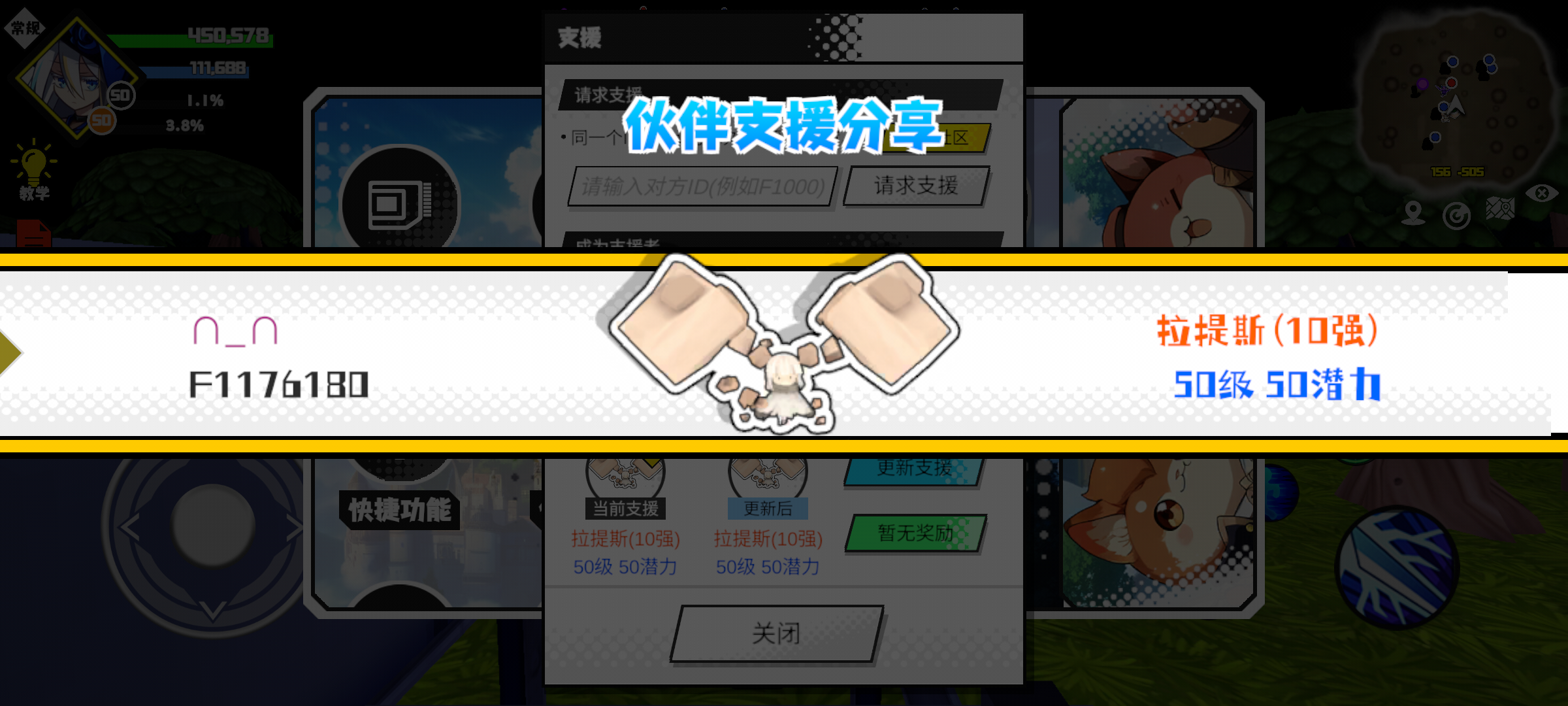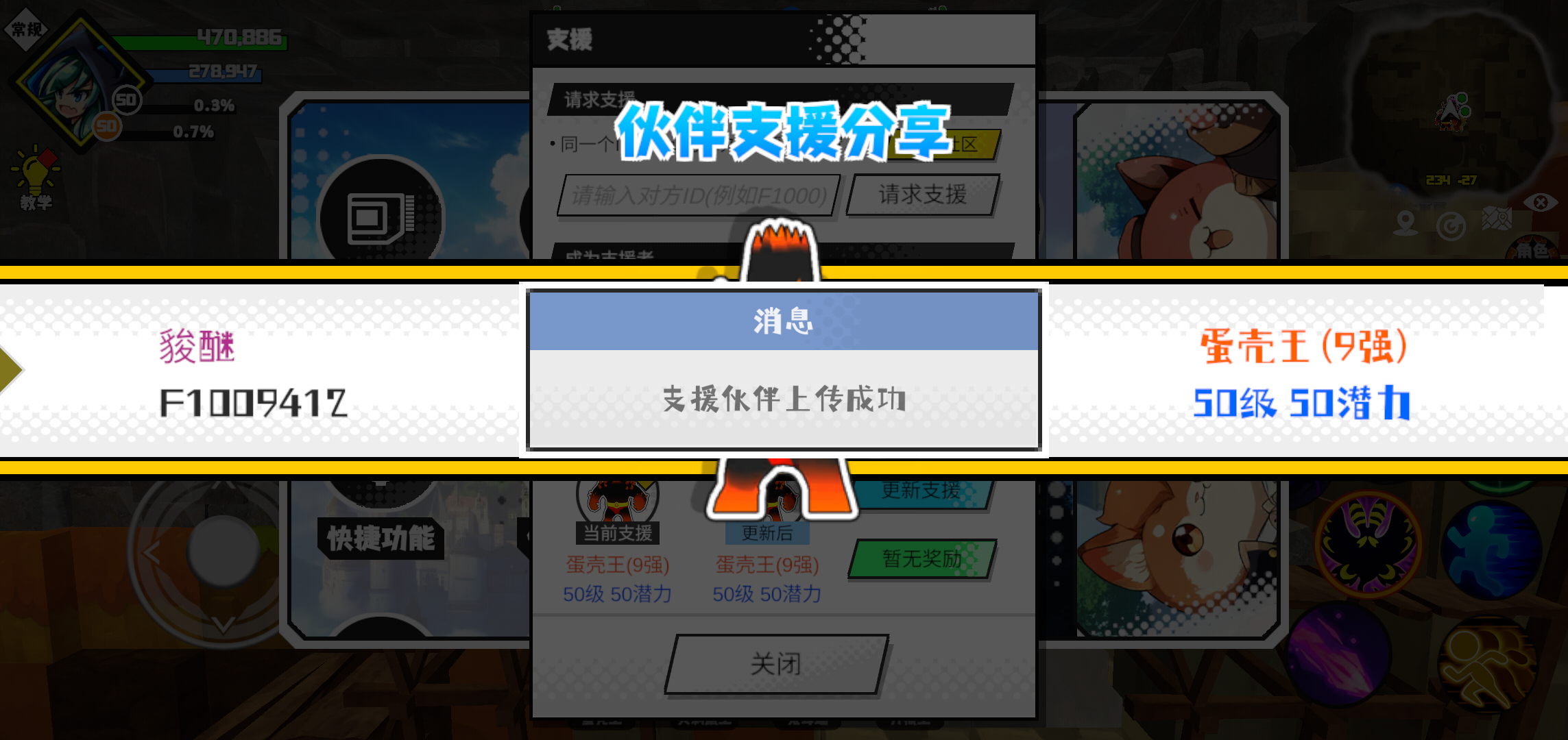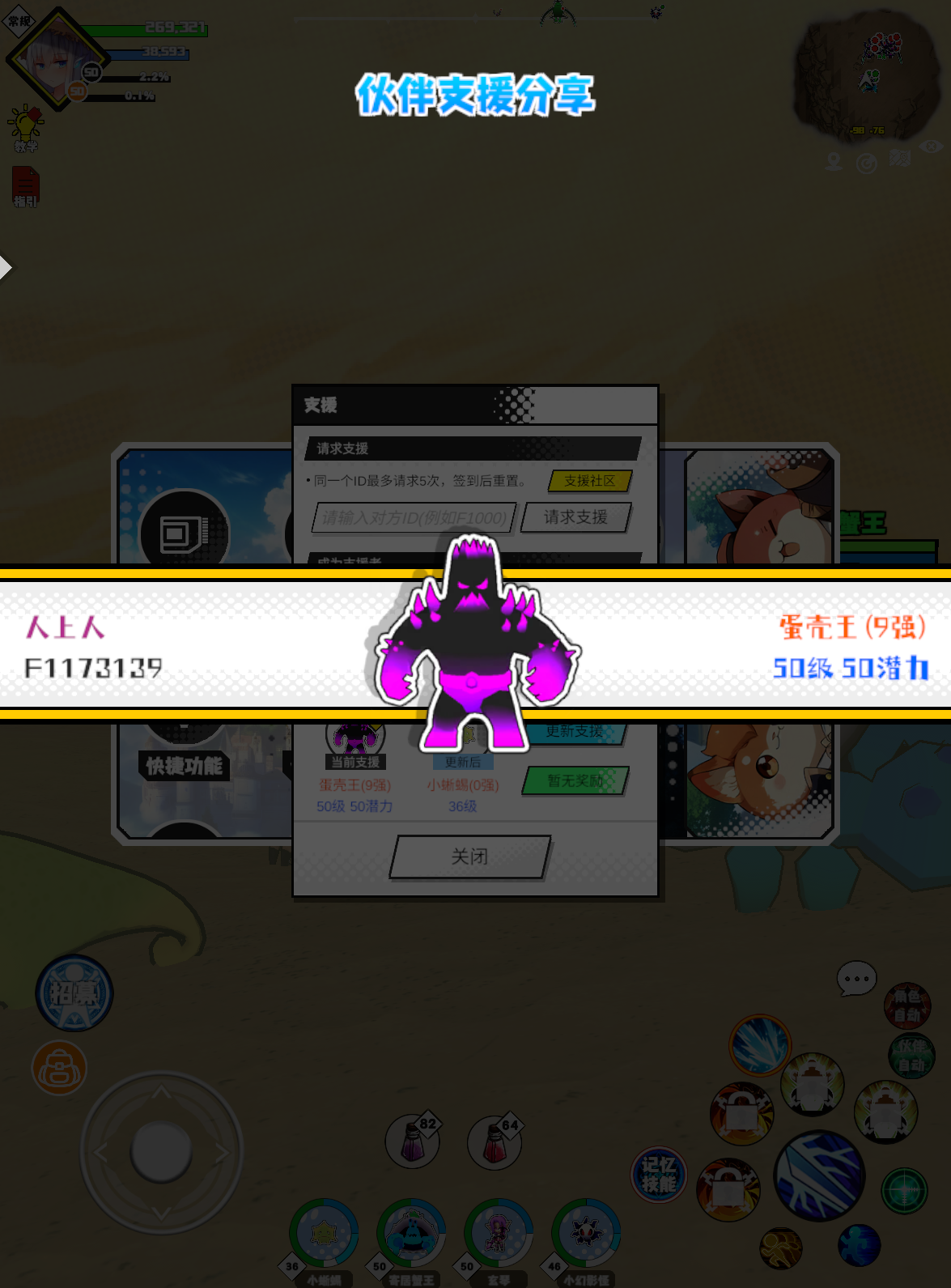 #超数据世界 支援者:䝜醚(F1009412)如果遇到困难,可以召唤我的宠物帮忙,召唤方法是进入地图后点击左下角的手机功能>支援>输入【F1009412】>就可以召唤我的宠物!我的宠物是蛋壳王(9强)50级 50潜力技能1:火焰破技能2:火焰破技能3:火焰破技能4:火焰破智慧配点:245初阶职业:鬼咒进阶职业:海神