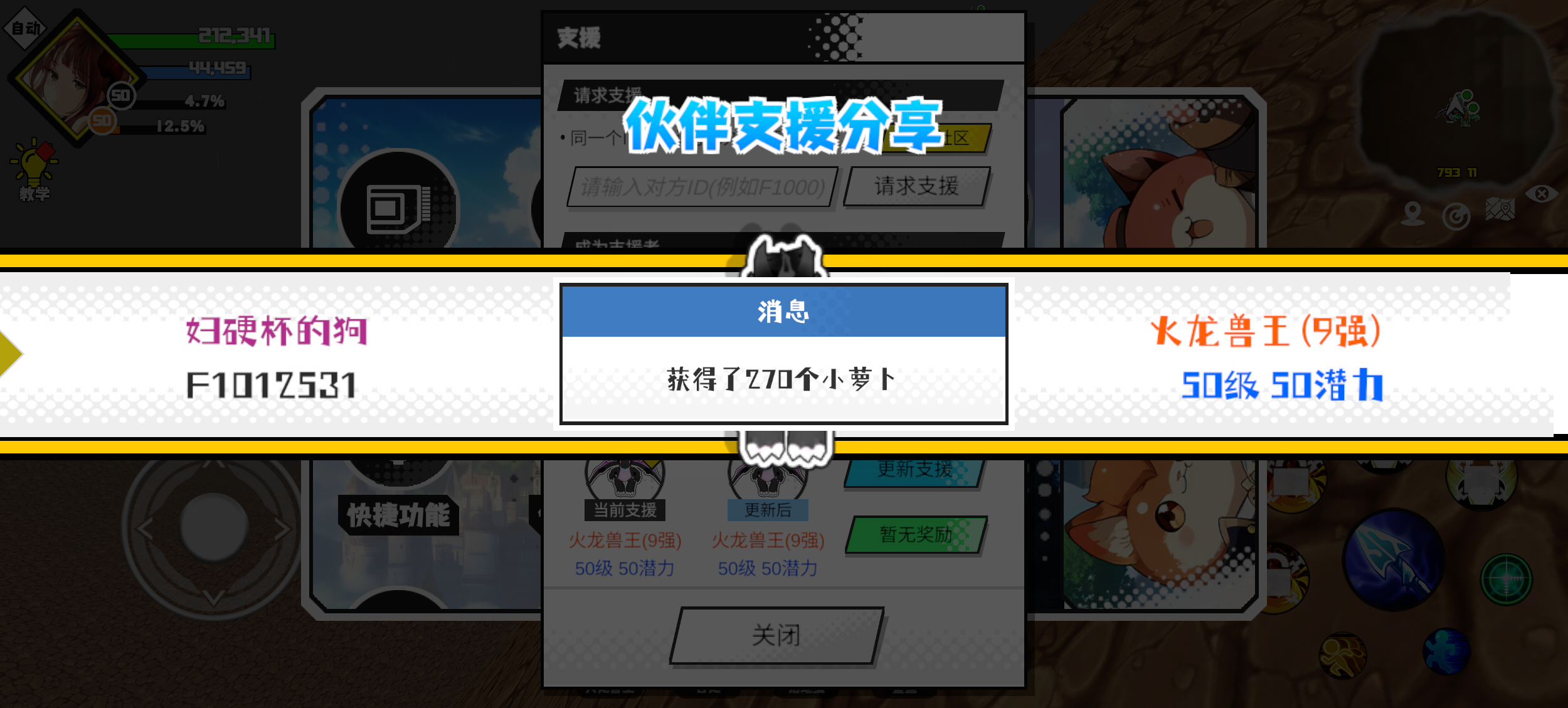 支援者:妇硬杯的狗(F1012531)如果遇到困难,可以召唤我的宠物帮忙,召唤方法是进入地图后点击左下角的手机功能>支援>输入【F1012531】>就可以召唤我的宠物!我的宠物是火龙兽王(9强)50级 50潜力技能1:异空术技能2:异空术技能3:异空术技能4:魔导之力敏捷配点:45智慧配点:200初阶职业:鬼咒进阶职业:魔灭#超数据世界