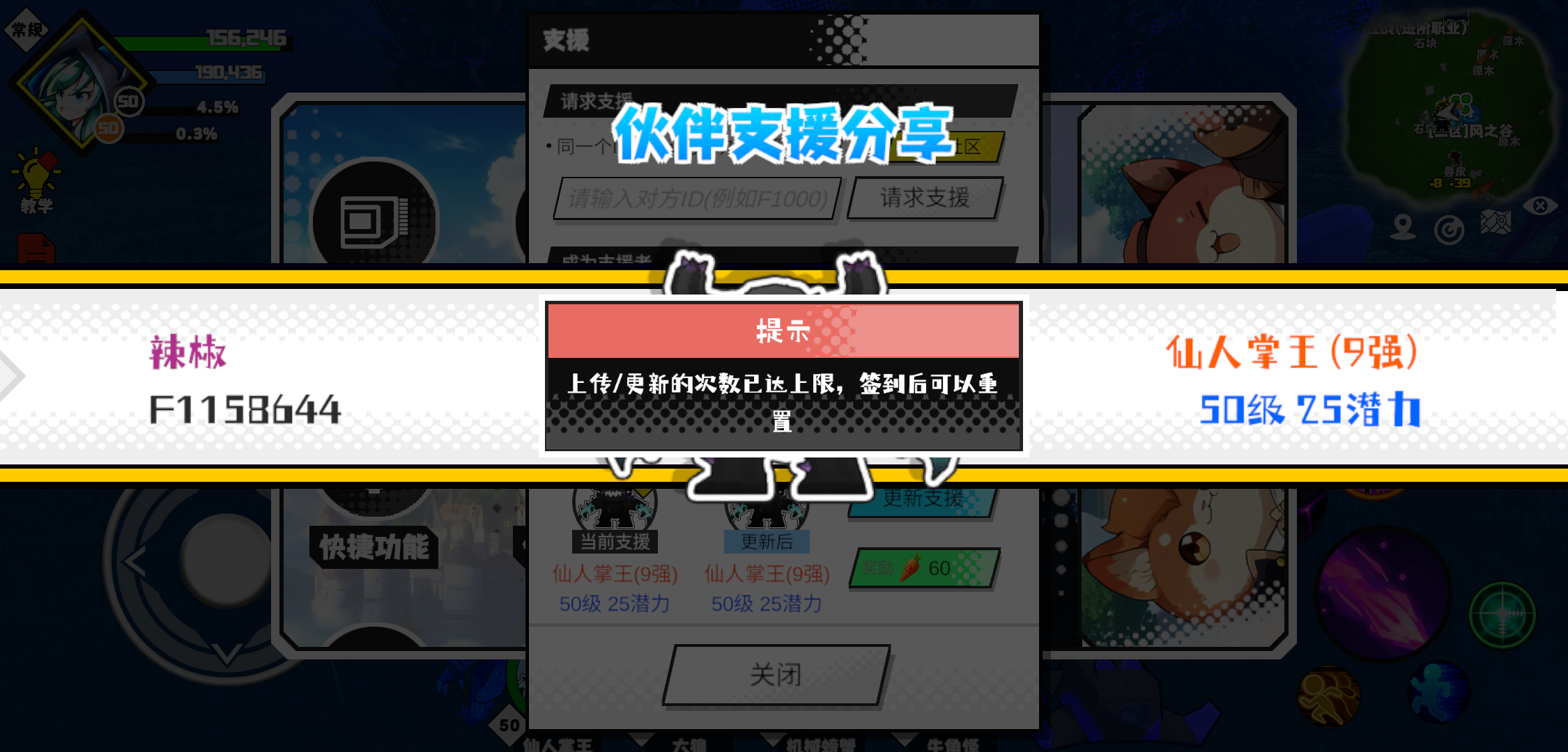 支援者:黎(F1169008)如果遇到困难,可以召唤我的宠物帮忙,召唤方法是进入地图后点击左下角的手机功能>支援>输入【F1169008】>就可以召唤我的宠物!我的宠物是蛋壳王(9强)50级 50潜力技能1:黑魔破技能2:黑魔破技能3:黑魔破技能4:黑魔破智慧配点:245初阶职业:鬼咒进阶职业:海神#超数据世界